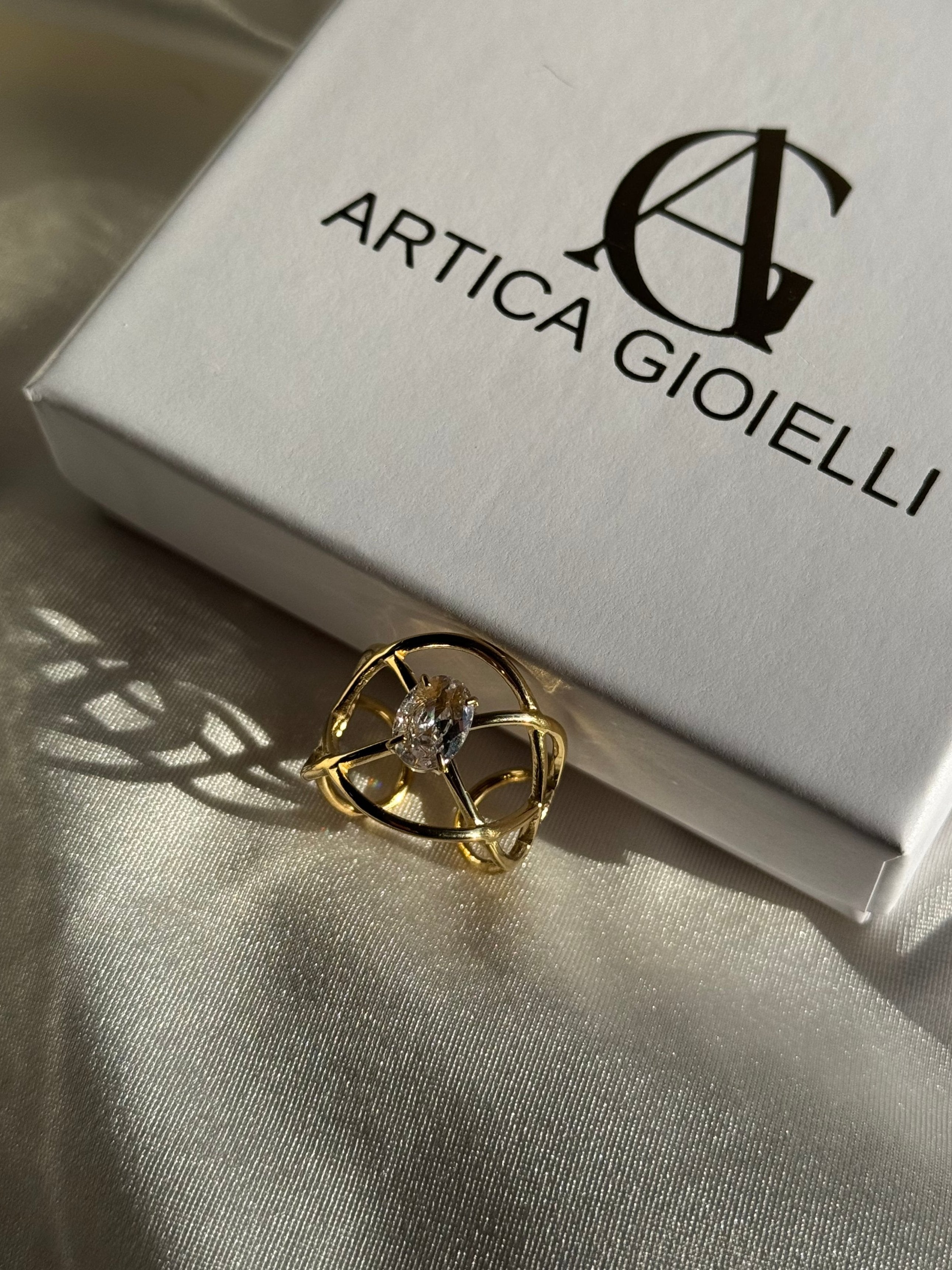 L'anello Atalanta dal design unico e raffinato è caratterizzato da una struttura dorata aperta, composta da linee fluide e curve intrecciate che formano un motivo elegante e artistico. Al centro dell'anello si trova una pietra di zirconia centrale taglio ovale, incastonato in modo da rimanere sospesa tra le curve dorate, creando un effetto di leggerezza e brillantezza. La pietra cattura e riflette la luce, aggiungendo un tocco scintillante al design sofisticato.