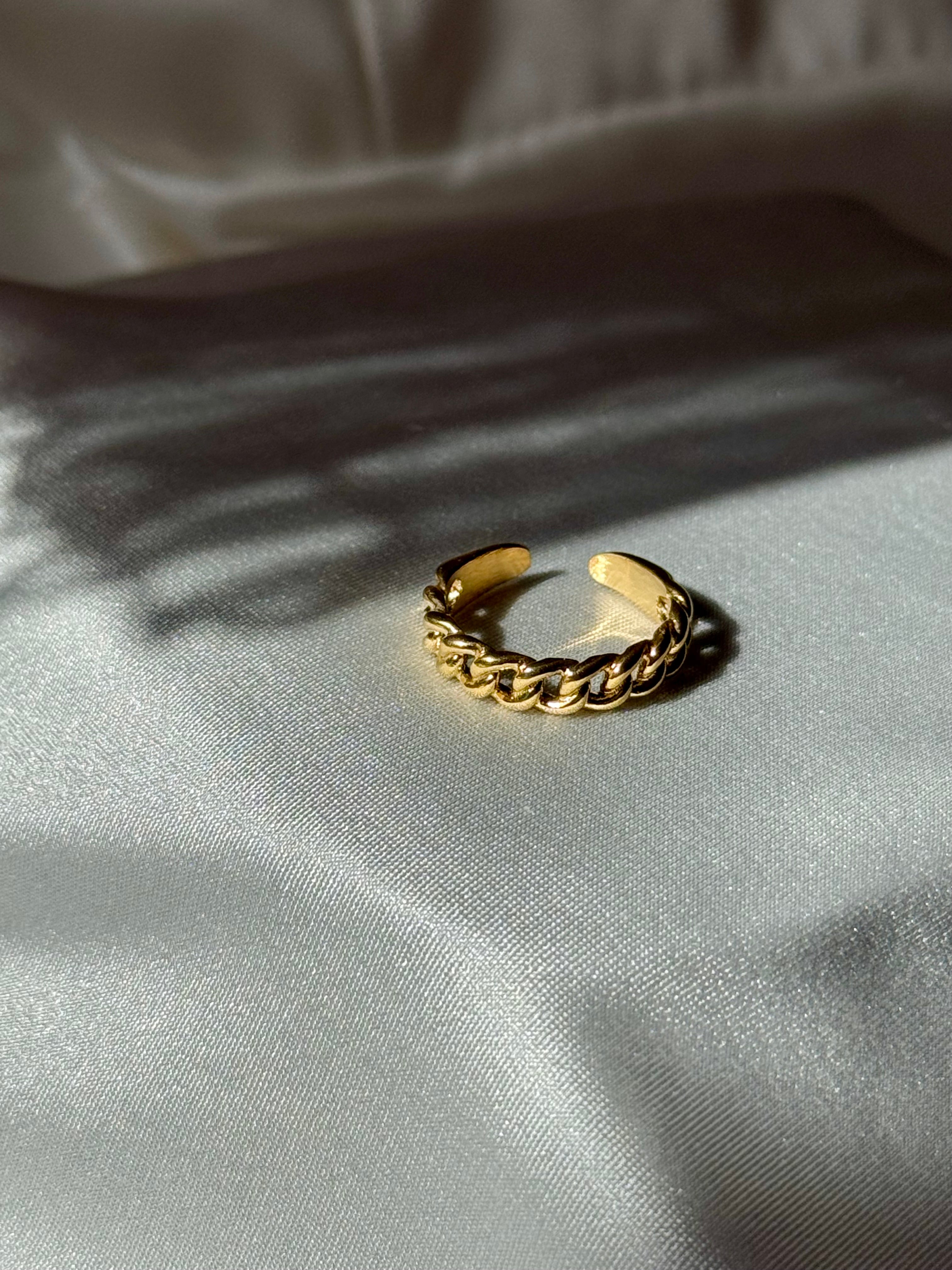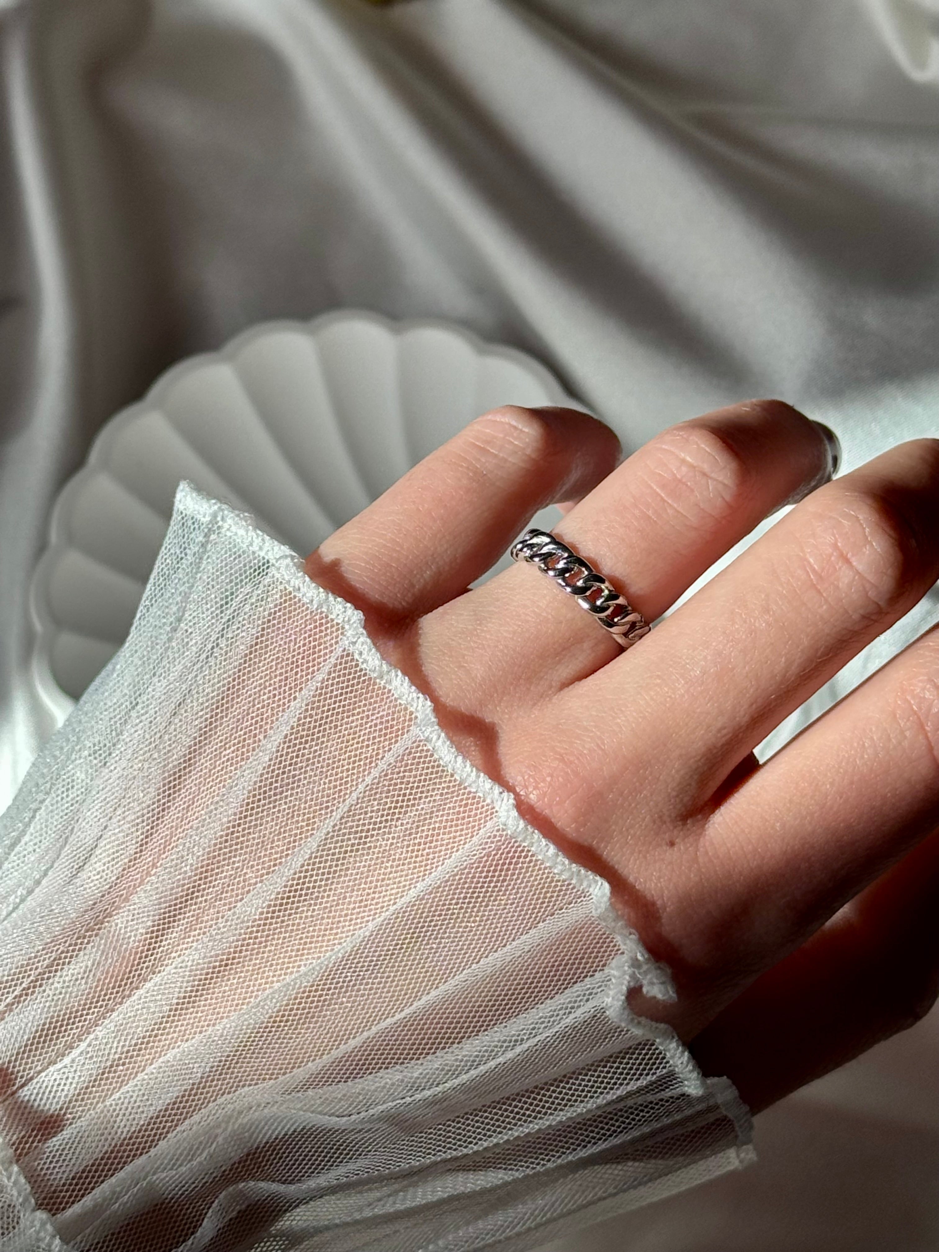 La struttura a catena è ben definita e curata nei dettagli, e l’anello è aperto sul retro per permettere una regolazione facile, adattandosi comodamente a diverse misure di dito.