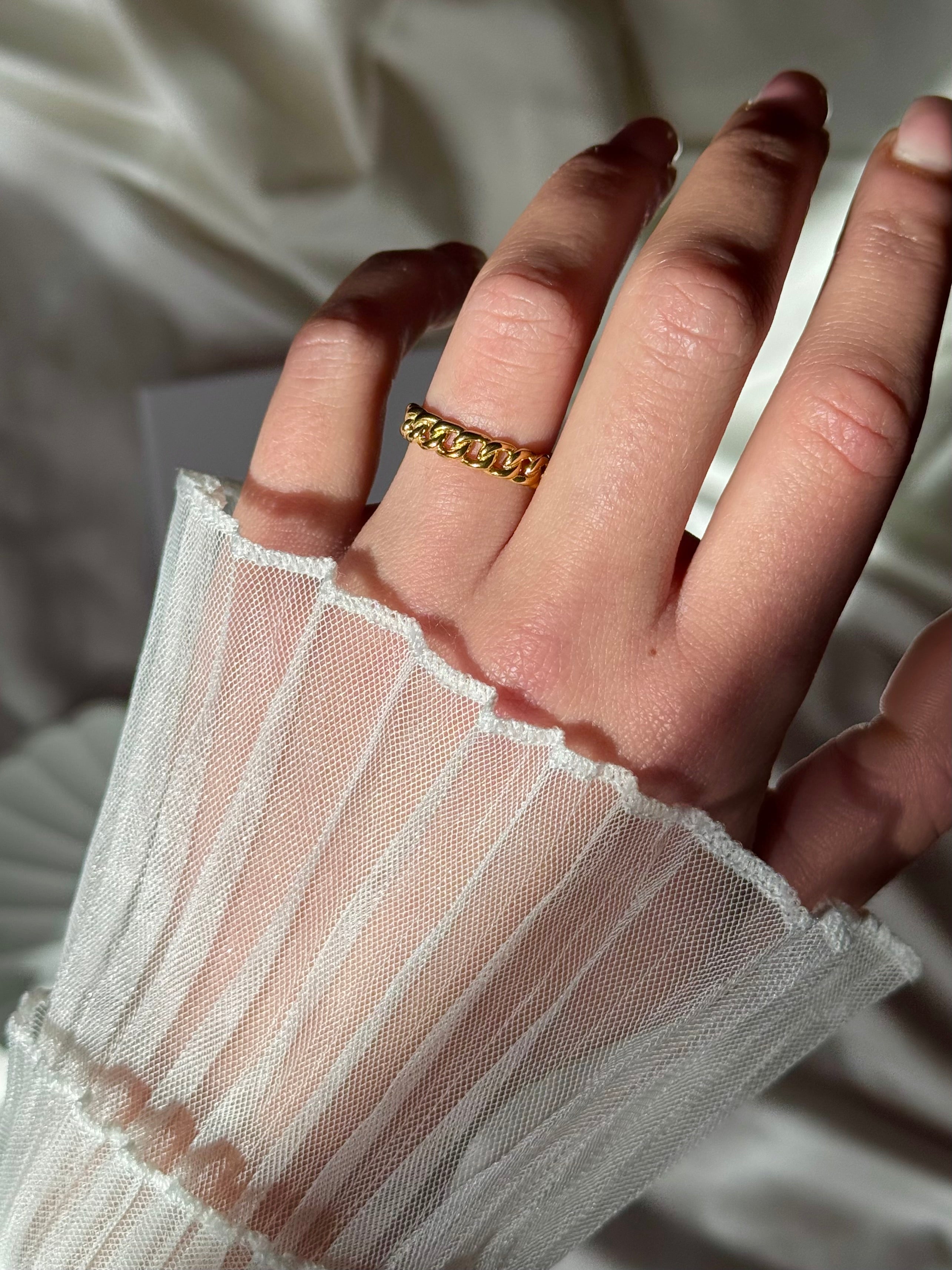 L'anello Evelyn a catena regolabile ha un design grintoso e contemporaneo, ispirato alla classica catena cubana. Realizzato in acciaio inossidabile e disponibile nelle tonalità dorata e argentata, questo anello offre uno stile versatile e moderno, perfetto per chi desidera un accessorio che completi un look casual o elegante.