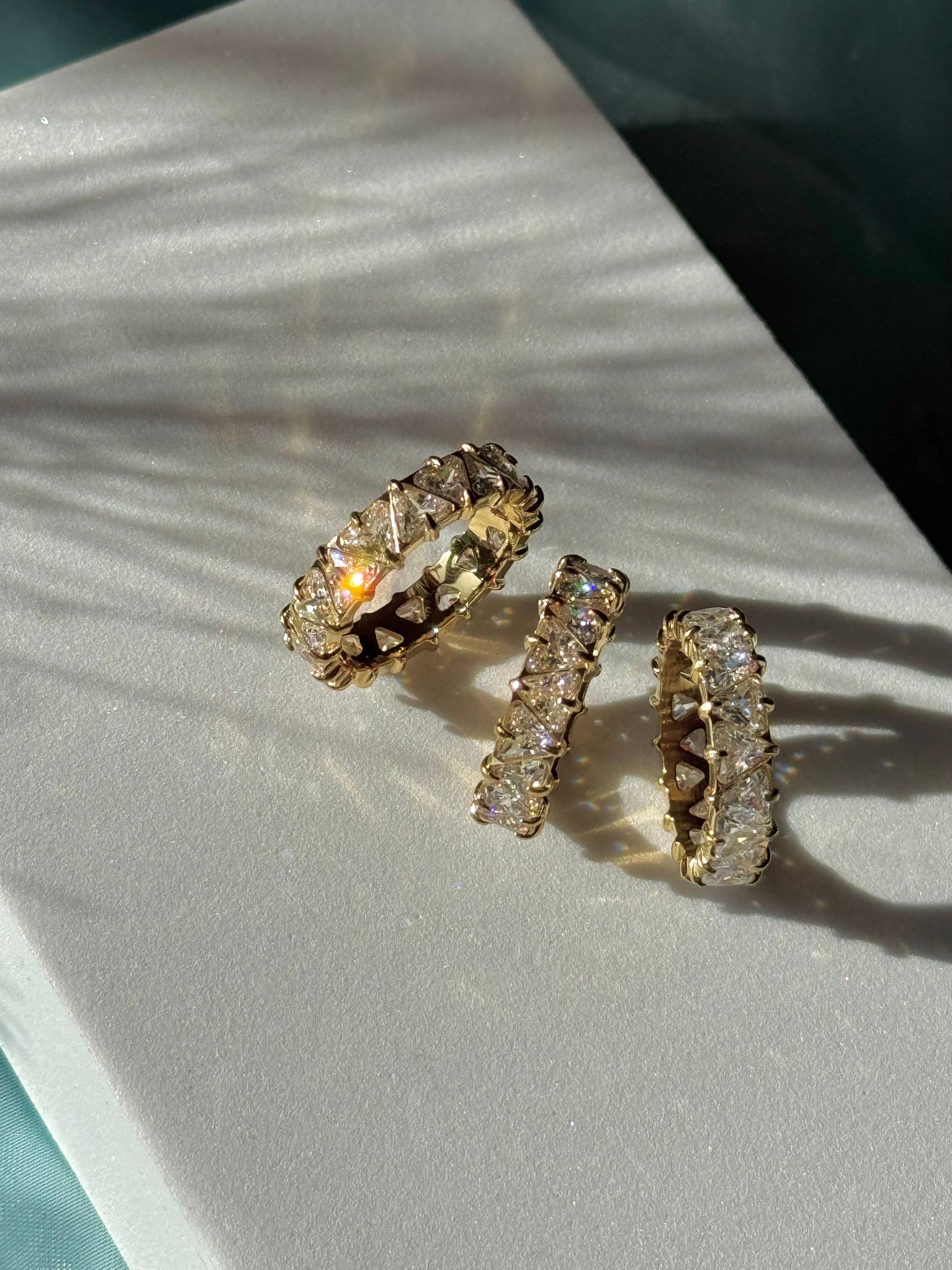 L'anello Olimpia dal design sofisticato e lussuoso presentano una fila continua di zirconia con taglio triangolare, creando un effetto visivo unico e ricercato. I zirconi, perfettamente incastonati, si alternano con precisione lungo tutta la circonferenza dell’anello, dando vita a una brillantezza intensa e multidirezionale che cattura e riflette la luce in modo straordinario.