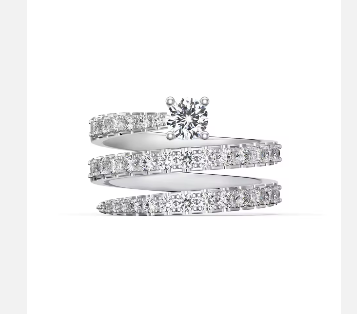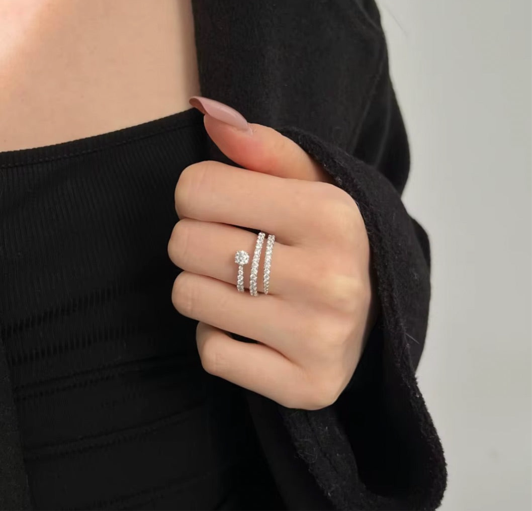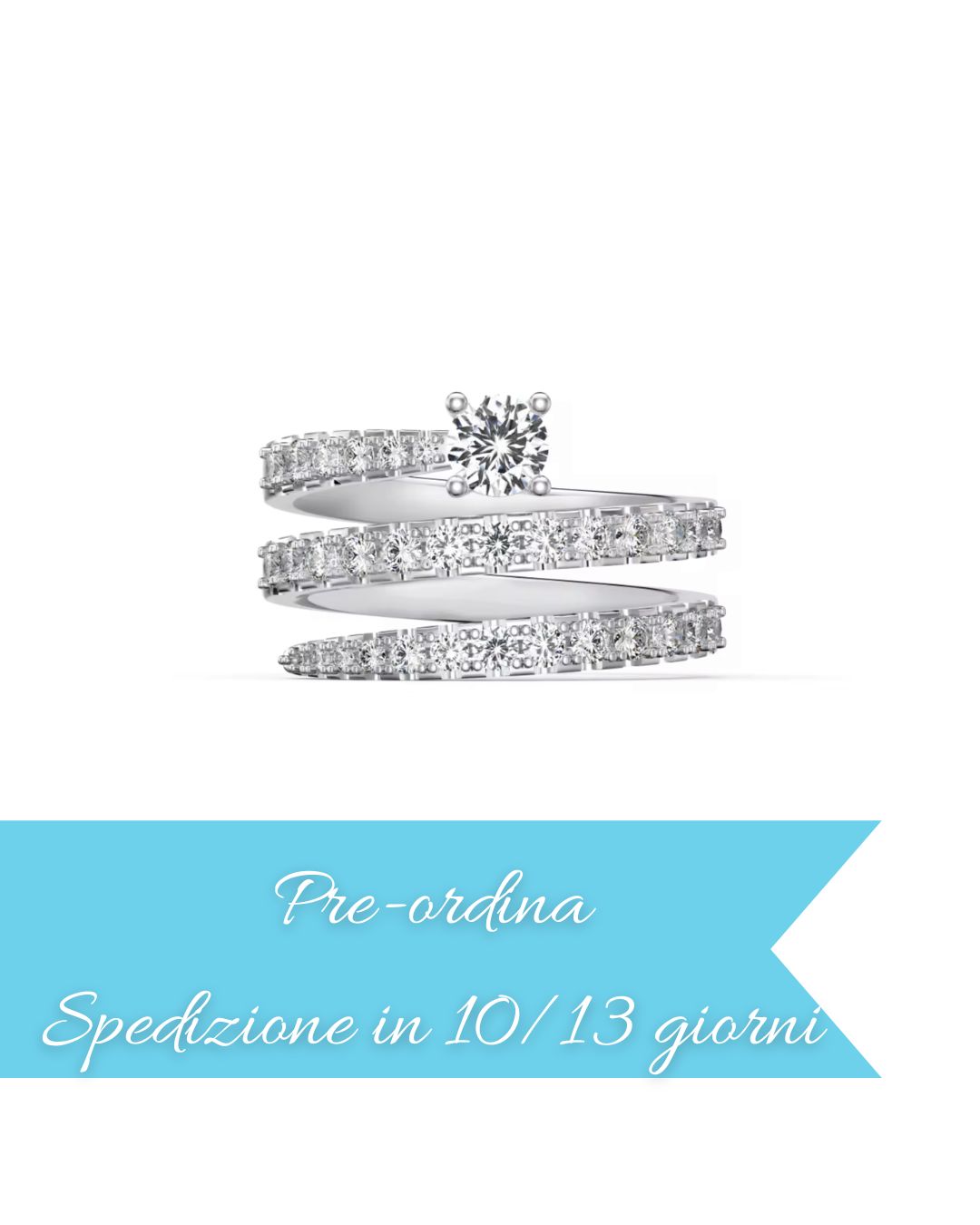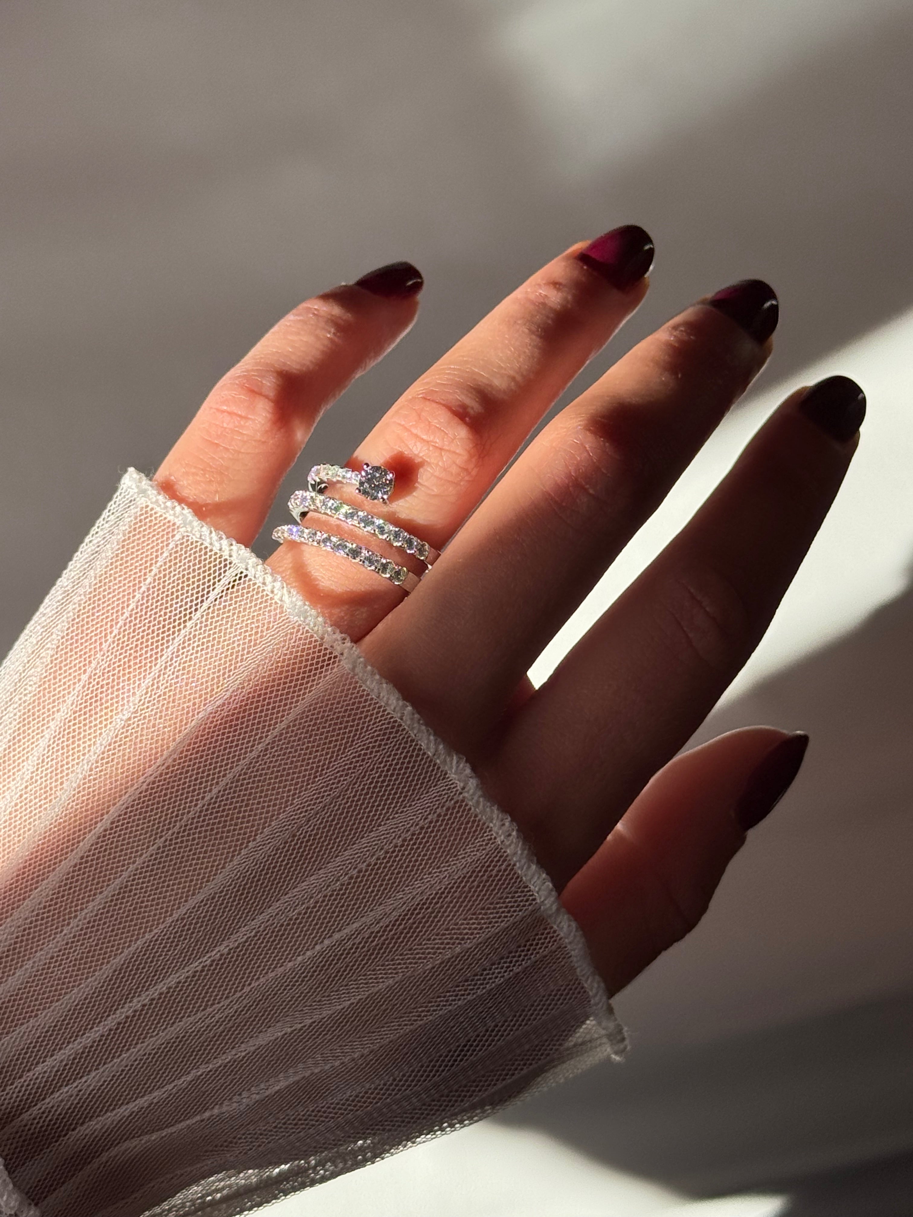 Un design sinuoso che abbraccia il dito con raffinatezza, impreziosito da una brillante pietra centrale e da una fila di zirconie che donano un effetto luminoso e sofisticato. Perfetto per aggiungere un tocco di eleganza moderna a ogni look.