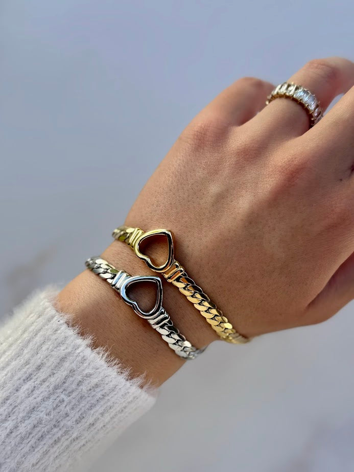 La combinazione tra la catena importante e il design delicato del cuore crea un equilibrio perfetto tra forza ed eleganza, rendendo questi bracciali ideali sia per look casual che per outfit più sofisticati. Questi pezzi sono perfetti per chi desidera un accessorio distintivo, con un tocco di romanticismo e classe.
