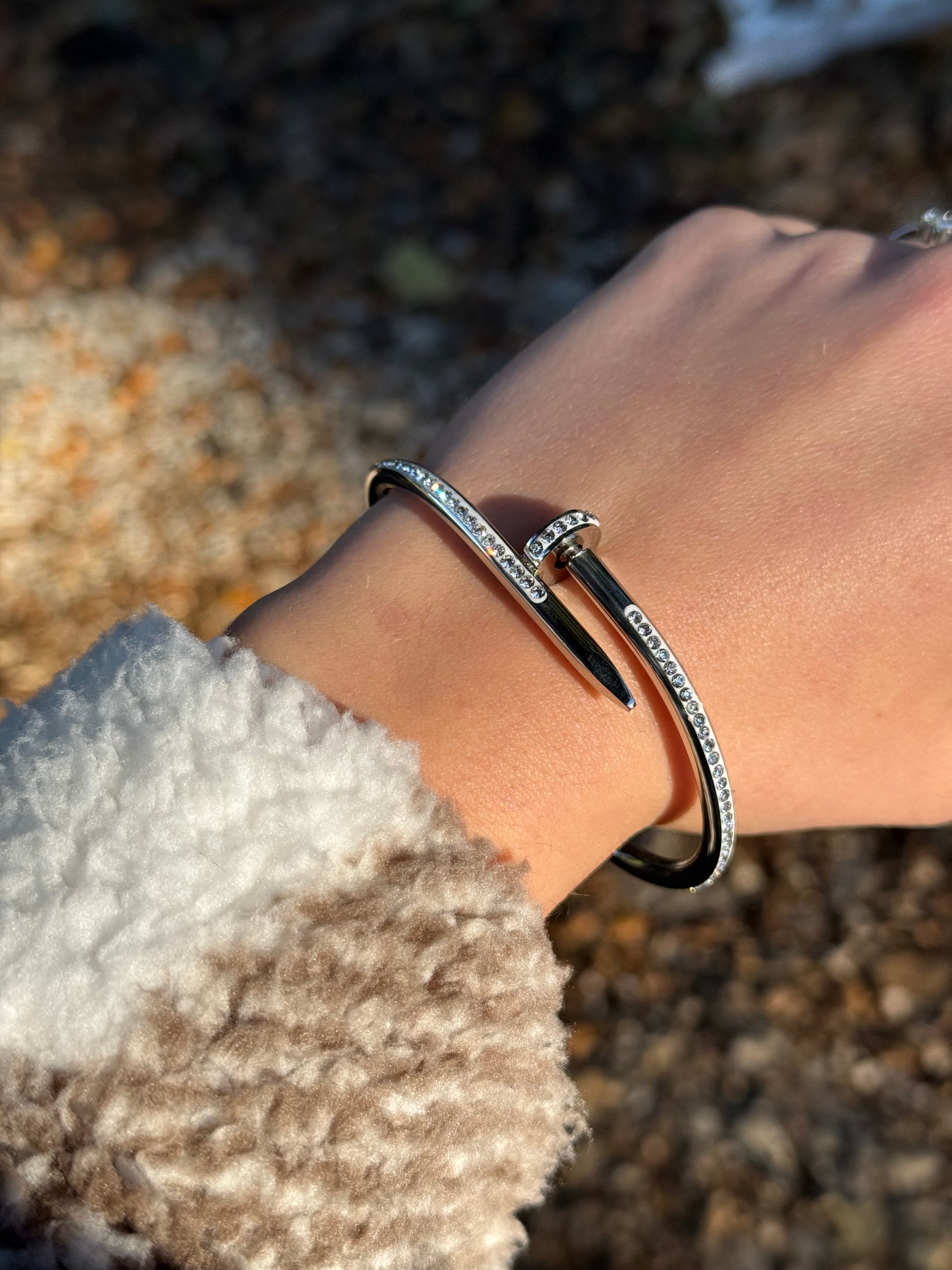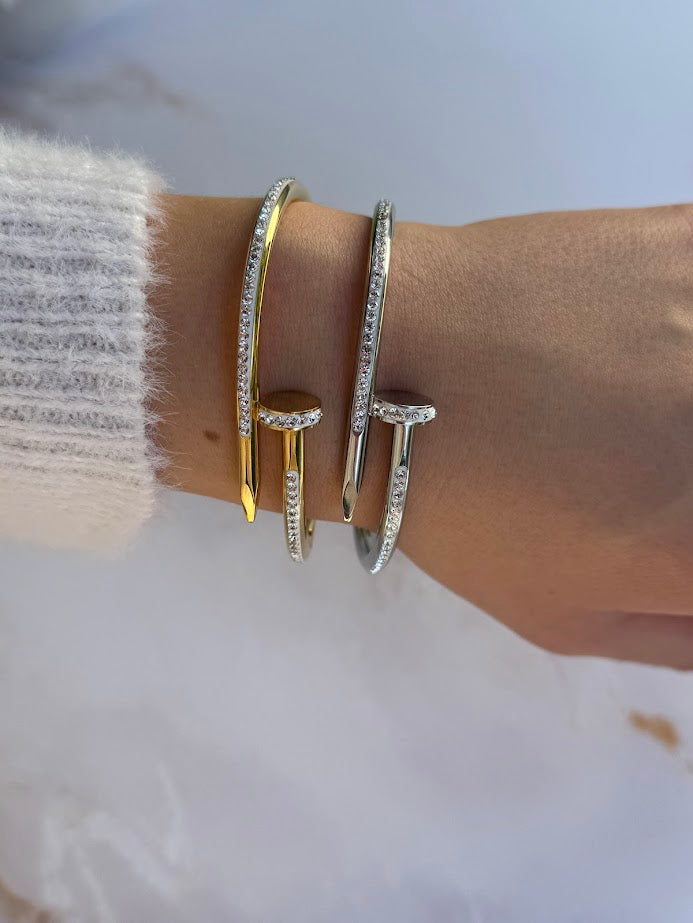Il bracciale Ecate dal design moderno e audace si ispirano alla forma di un chiodo, reinterpretato in chiave elegante grazie alla presenza di strass scintillanti. Disponibili in due tonalità, dorato e argentato, questi bracciali catturano la luce con eleganza grazie alla fila di strass lungo tutta la lunghezza, aggiungendo una brillantezza sofisticata al loro look industriale-chic.