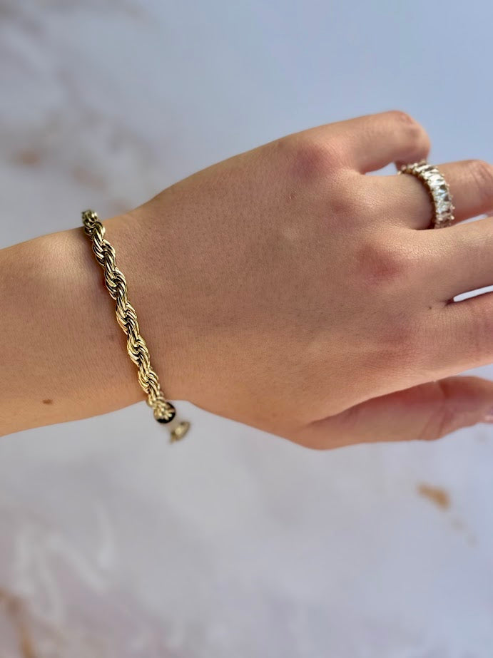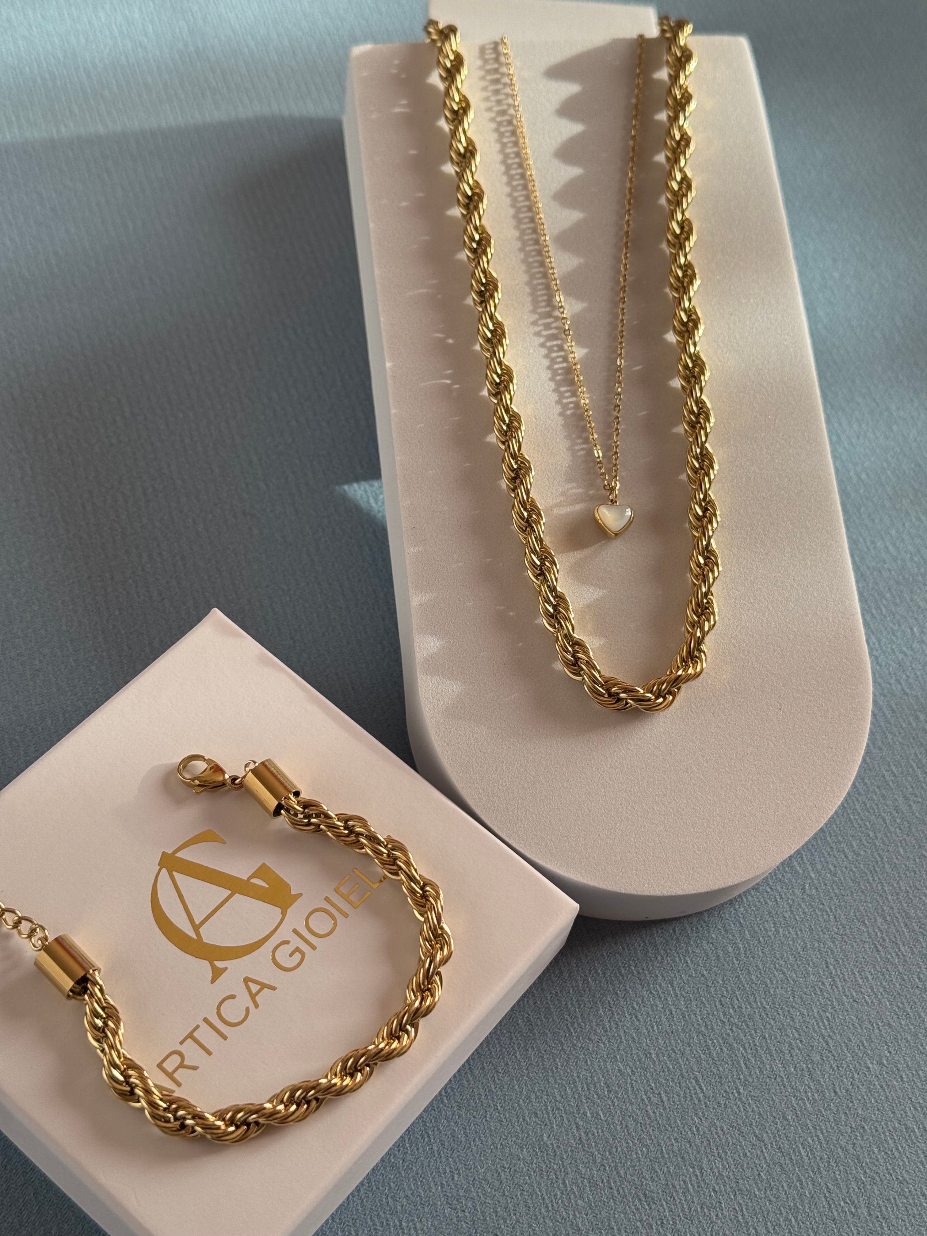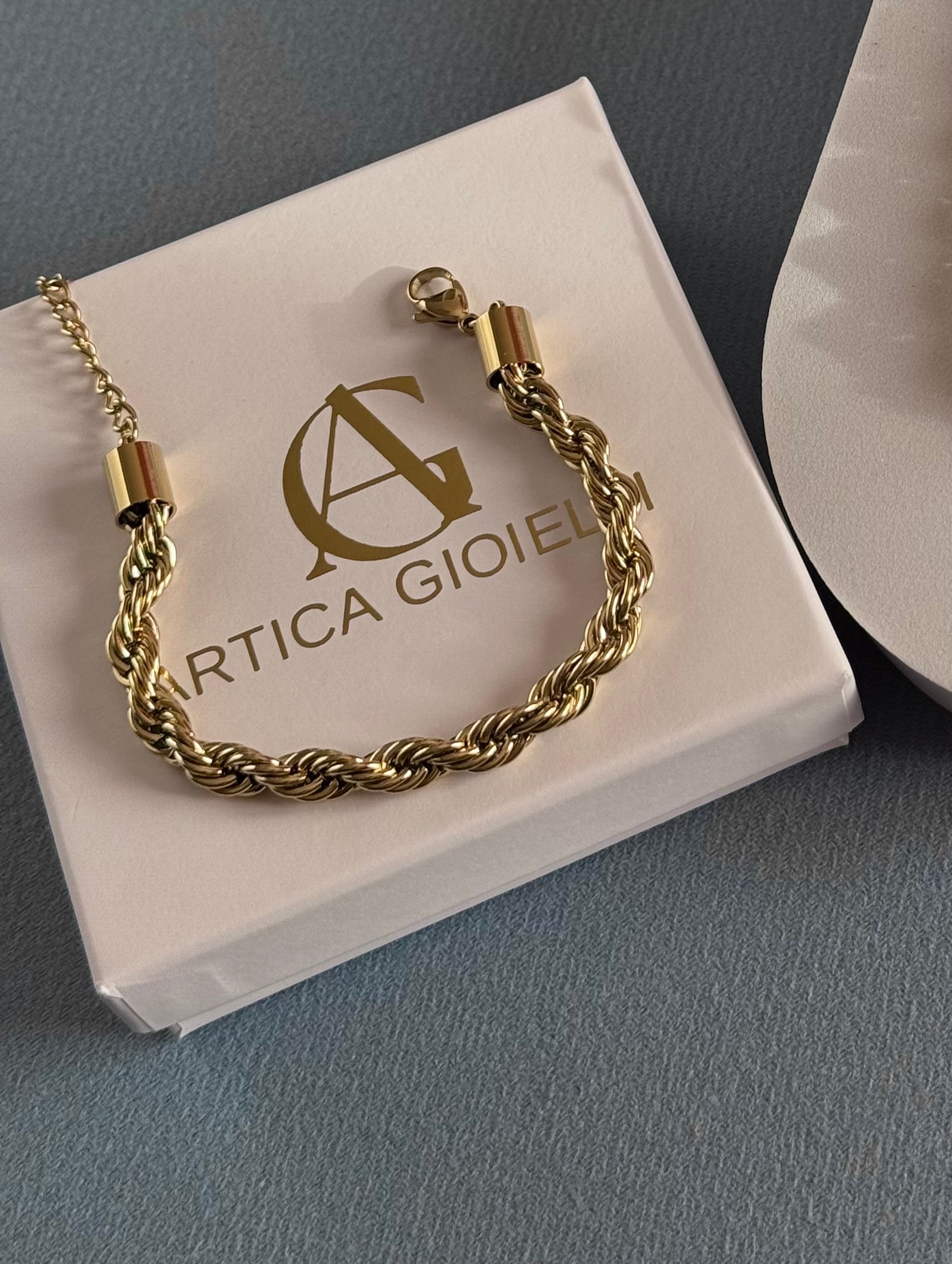 Il bracciale Coraline è caratterizzato da un design a corda intrecciata, che conferisce un aspetto robusto e raffinato allo stesso tempo. La finitura dorata aggiunge un tocco di lusso, mentre la texture intrecciata crea un effetto tridimensionale che cattura delicatamente la luce. Il motivo a corda, composto da maglie sottili e ben lavorate, offre un look classico e senza tempo, adatto sia a outfit formali che a quelli più casual.
