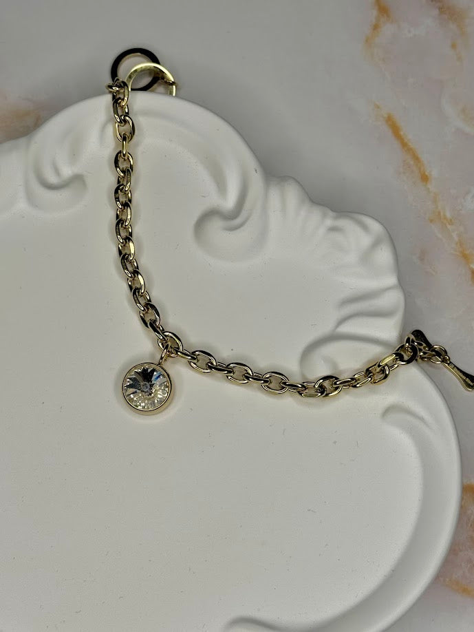 È un accessorio raffinato e versatile, che aggiunge un accento luminoso a qualsiasi look, sia per outfit casual che per serate eleganti. La combinazione tra la lucentezza del metallo dorato e lo splendore del ciondolo lo rende un pezzo distintivo ma delicato, perfetto per chi ama dettagli semplici ma di grande effetto.