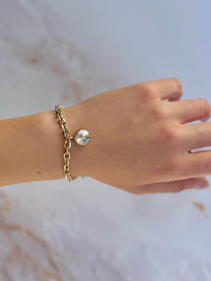 Al centro del bracciale, pende un piccolo ciondolo con un zircone scintillante incastonato, perfettamente lucidata e sfaccettata per catturare e riflettere la luce in modo affascinante. La pietra è racchiusa in una montatura circolare liscia e sobria, che esalta la sua brillantezza senza appesantire il design complessivo.