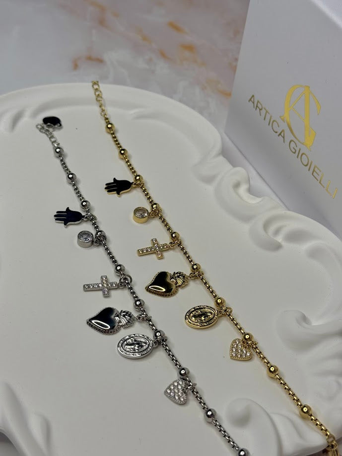 Ogni bracciale è decorato con una serie di ciondoli unici: una mano stilizzata, simbolo di protezione; una piccola pietra incastonata per un tocco di luce; una croce ornata di zirconi per un accento spirituale; un cuore sacro in rilievo che rappresenta amore e devozione; un medaglione con raffigurazioni religiose e infine un cuore tempestato di zirconi che aggiunge brillantezza e romanticismo.