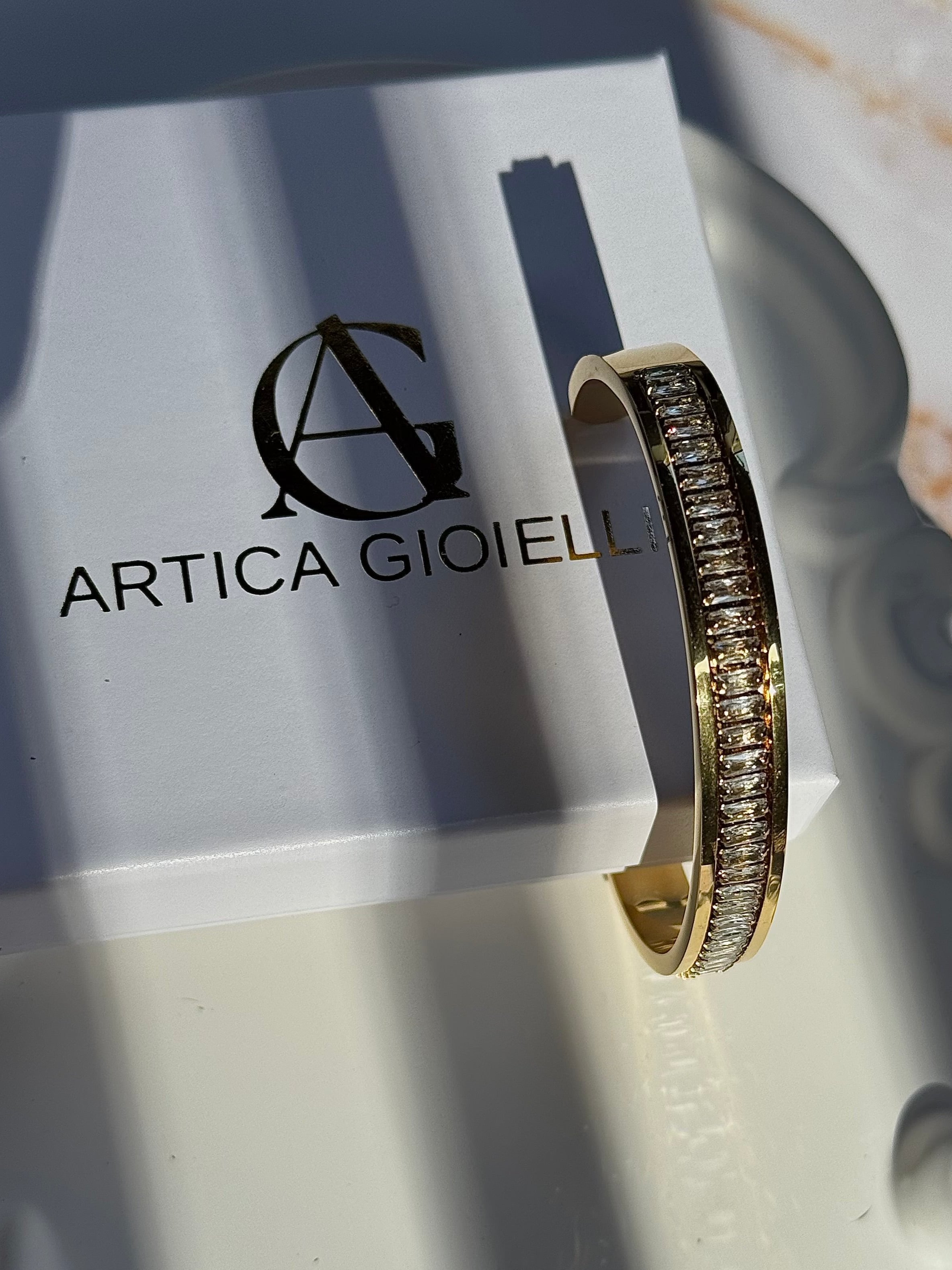 Il bracciale Splendor bracciale ha un design elegante e raffinato, realizzato in acciaio inossidabile con un rivestimento dorato. Impreziosito da una fila di zirconi brillanti taglio baguette, incastonati lungo tutta la superficie esterna, che aggiungono un tocco di lusso e luminosità. La struttura aperta lo rende facile da indossare e adatto per abbinamenti sia quotidiani che più formali.