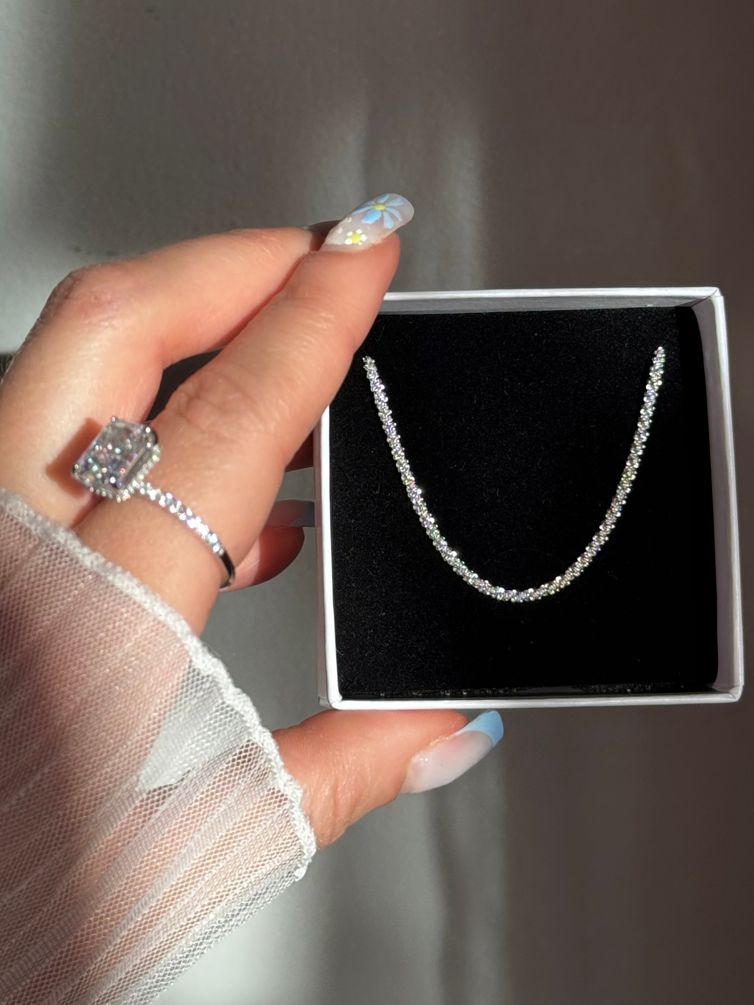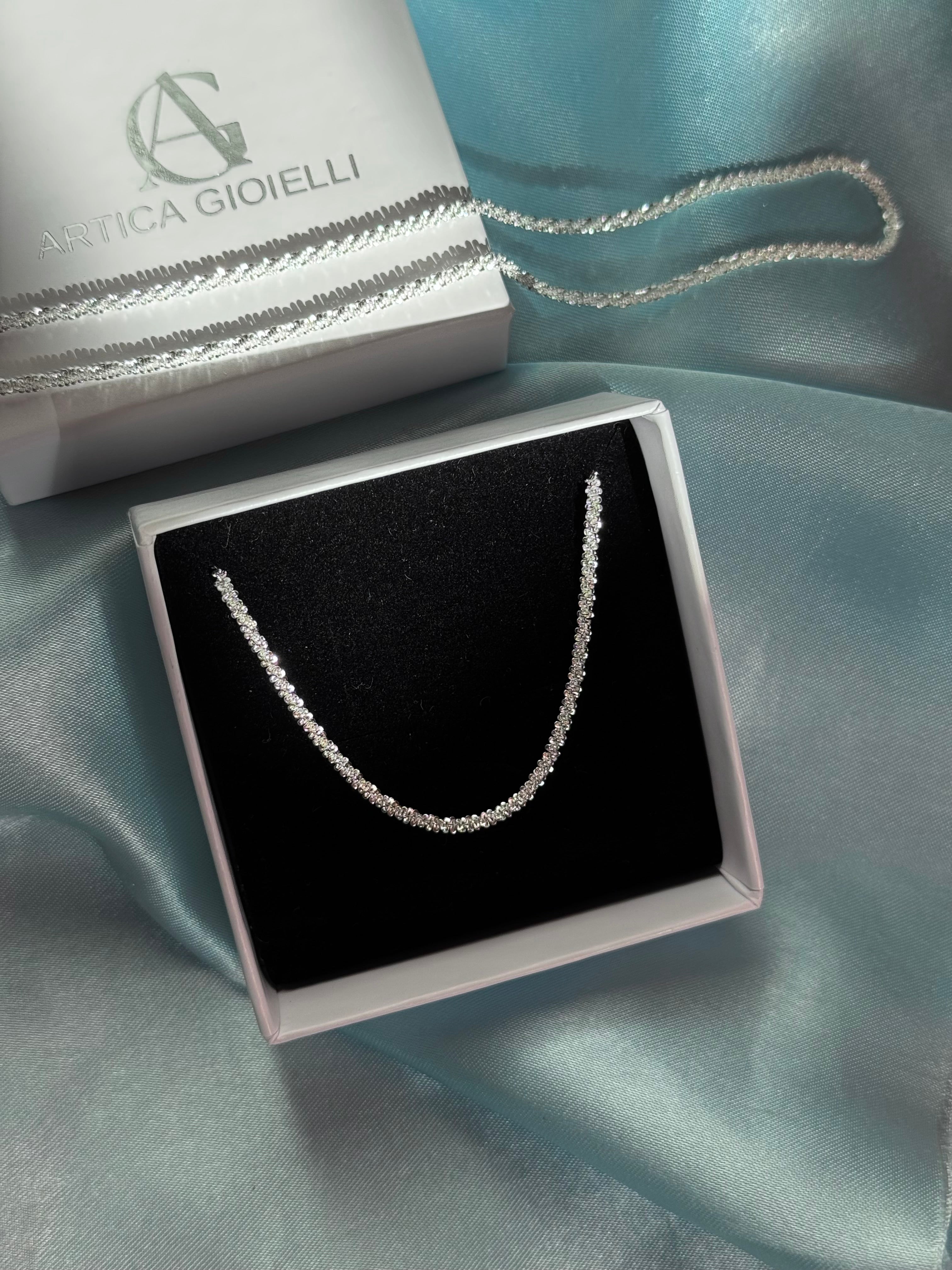 La collana Alea è realizzata in ottone di alta qualità, con una placcatura in argento 925 che dona una luminosità intensa e sofisticata, lavorata con effetto torchon, ovvero una torsione sottile e continua che crea un gioco di riflessi delicato ma deciso.