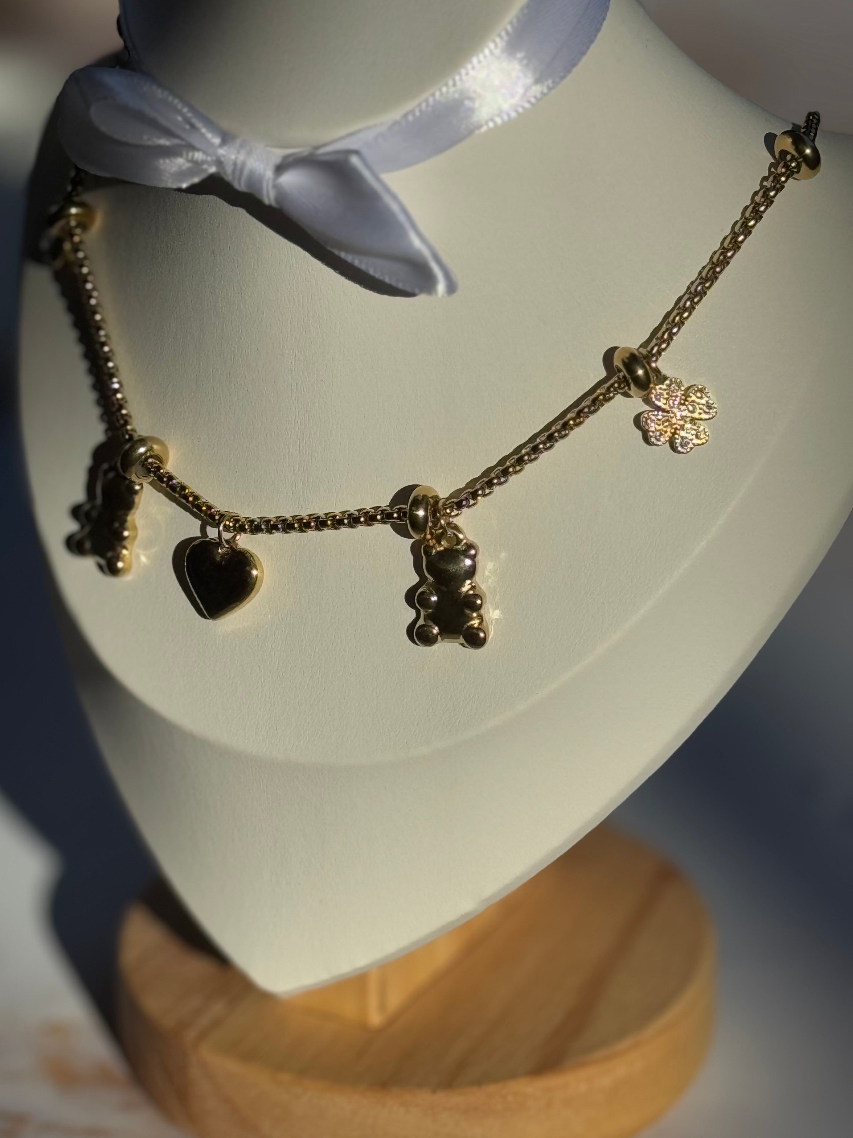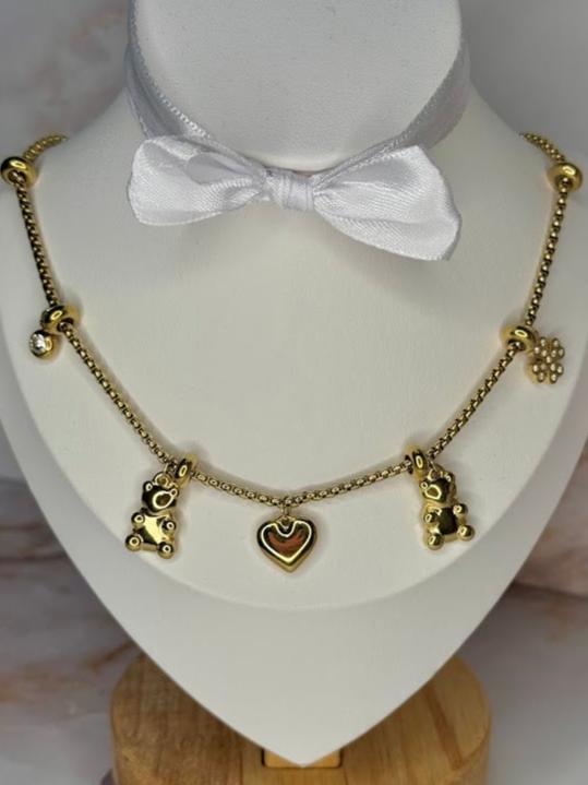Un design giocoso e adorabile, la collana baby caratterizzata da una catena decorata con una serie di ciondoli unici e ben distinti. Tra i ciondoli troviamo piccoli orsetti, un cuore e altri dettagli come un fiore e un piccolo brillante. Gli orsetti, simbolo di tenerezza e spensieratezza, si alternano lungo la catena, creando un look vivace e simpatico.