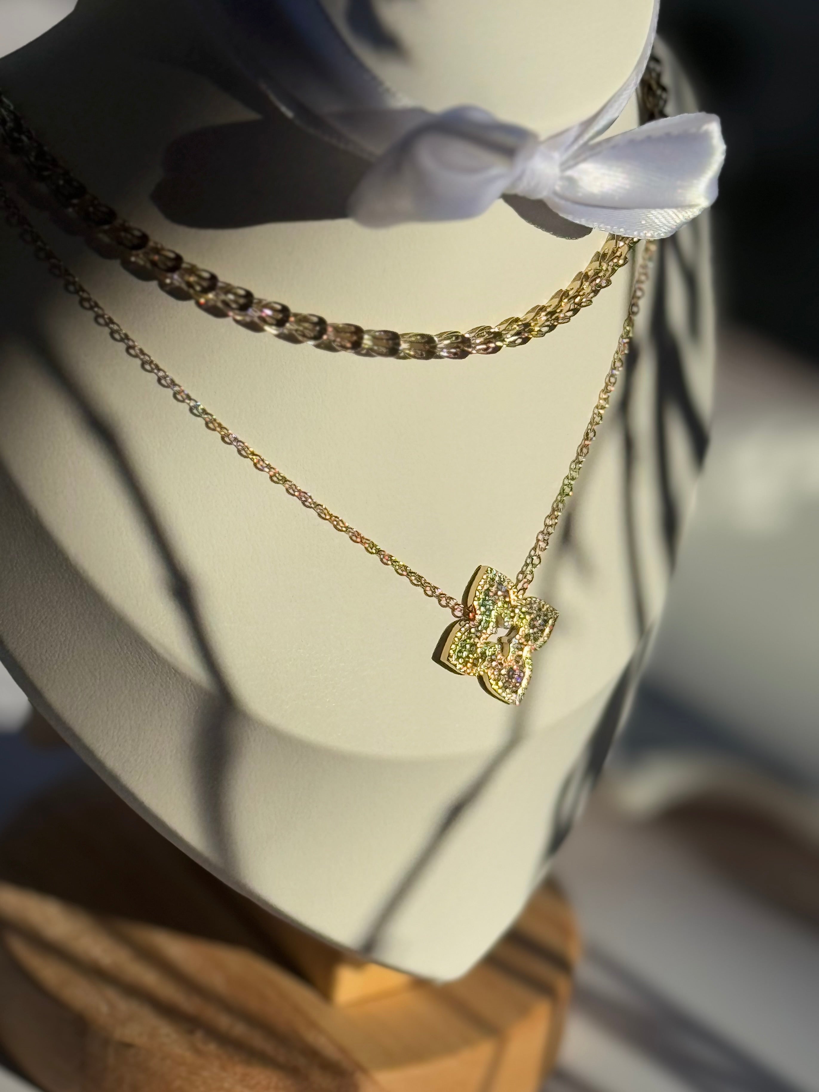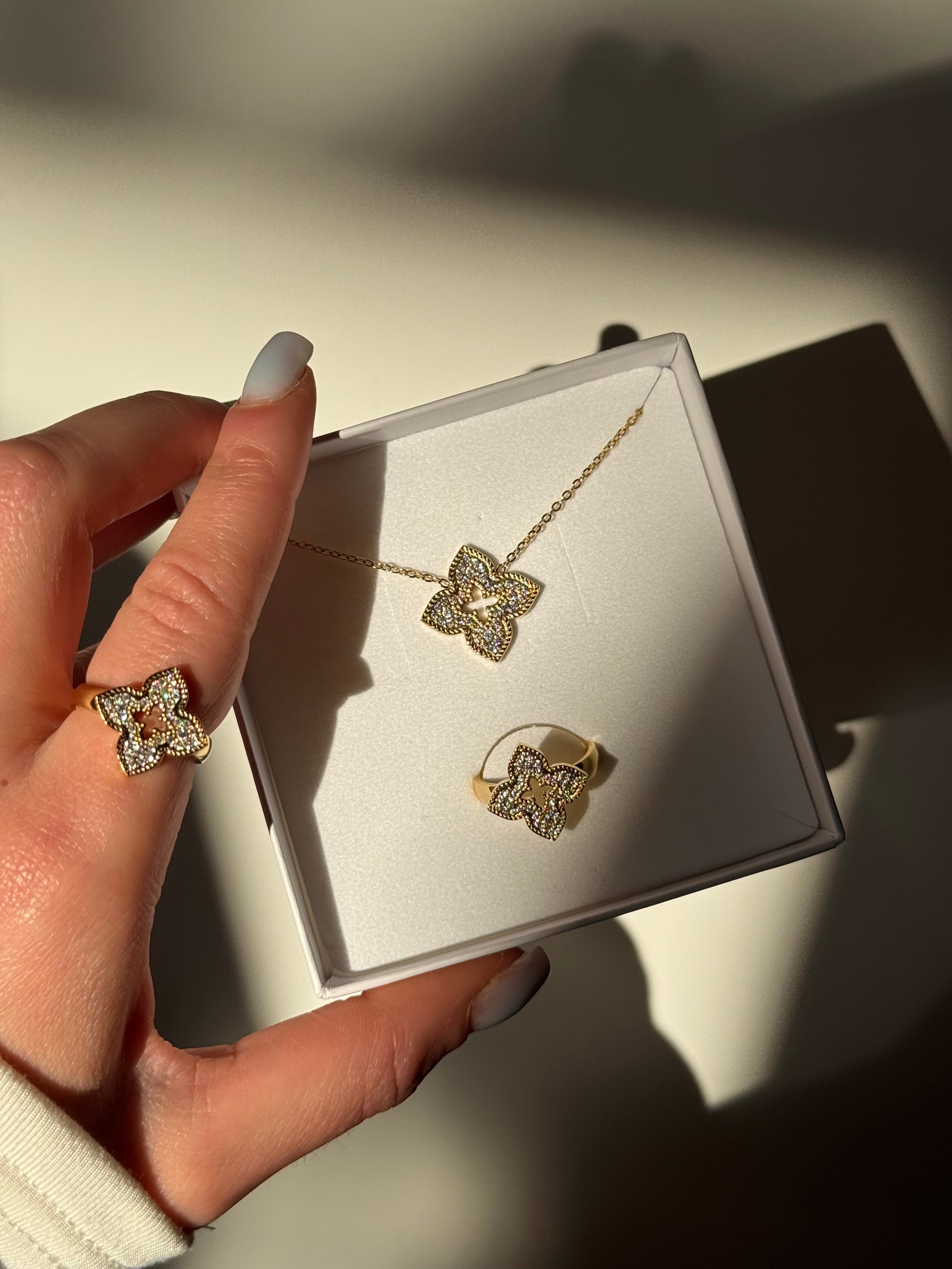 La collana Ophelia presenta un design elegante e raffinato. La catena è sottile e delicata, di colore dorato, e sostiene un pendente a forma di fiore stilizzato, conferendo un tocco di raffinatezza. Il pendente è caratterizzato da una struttura aperta e arricchita da piccoli zirconi incastonati, che aggiungono luminosità e riflessi scintillanti. Al centro del quadrifoglio, un dettaglio dorato richiama un piccolo motivo a forma di stella, aggiungendo profondità al design.