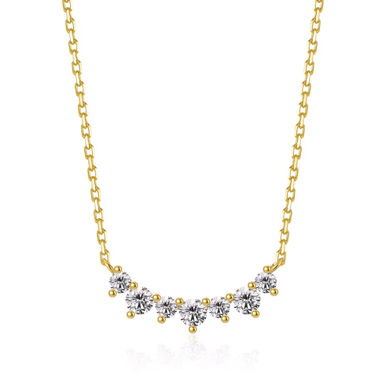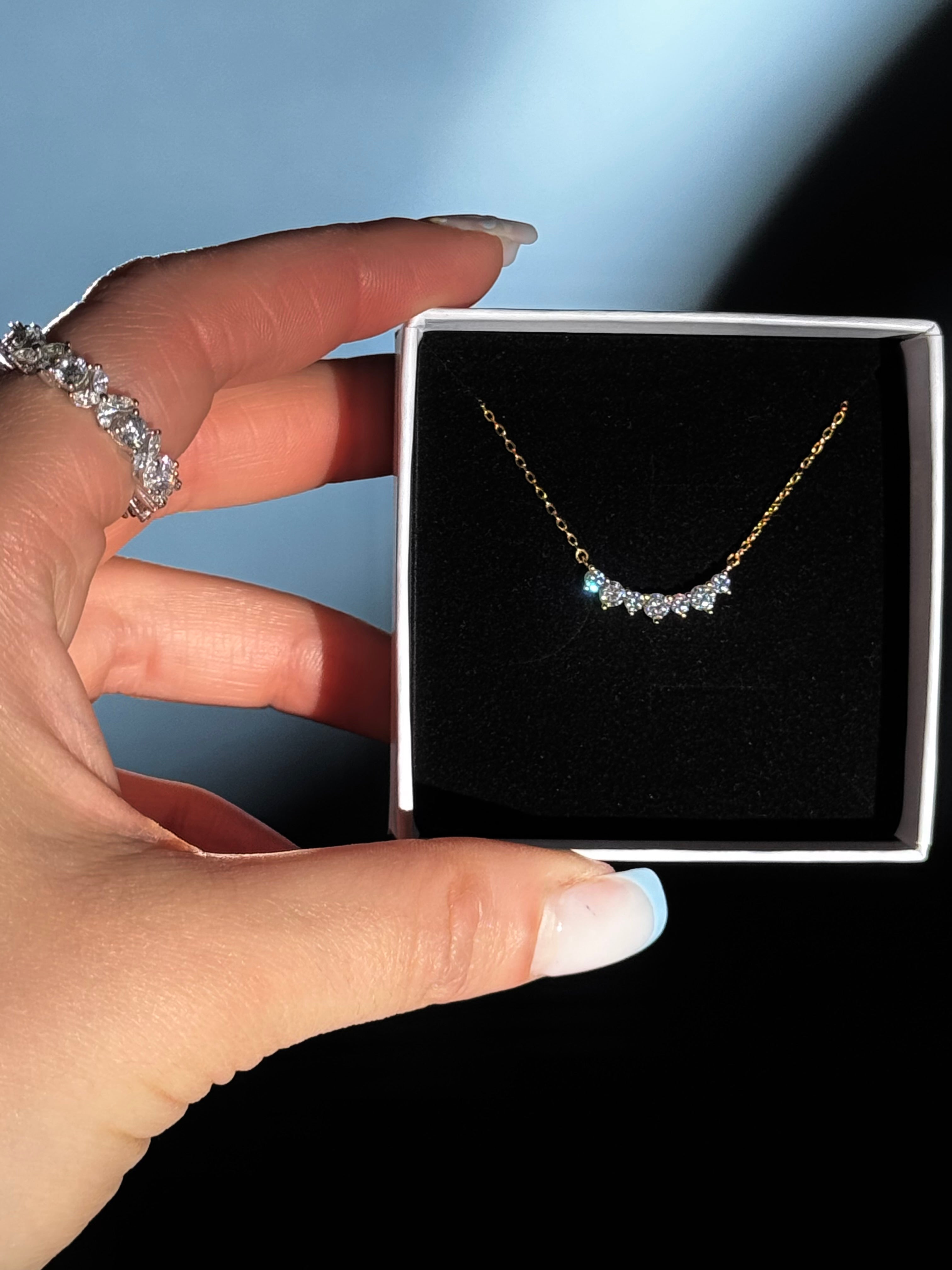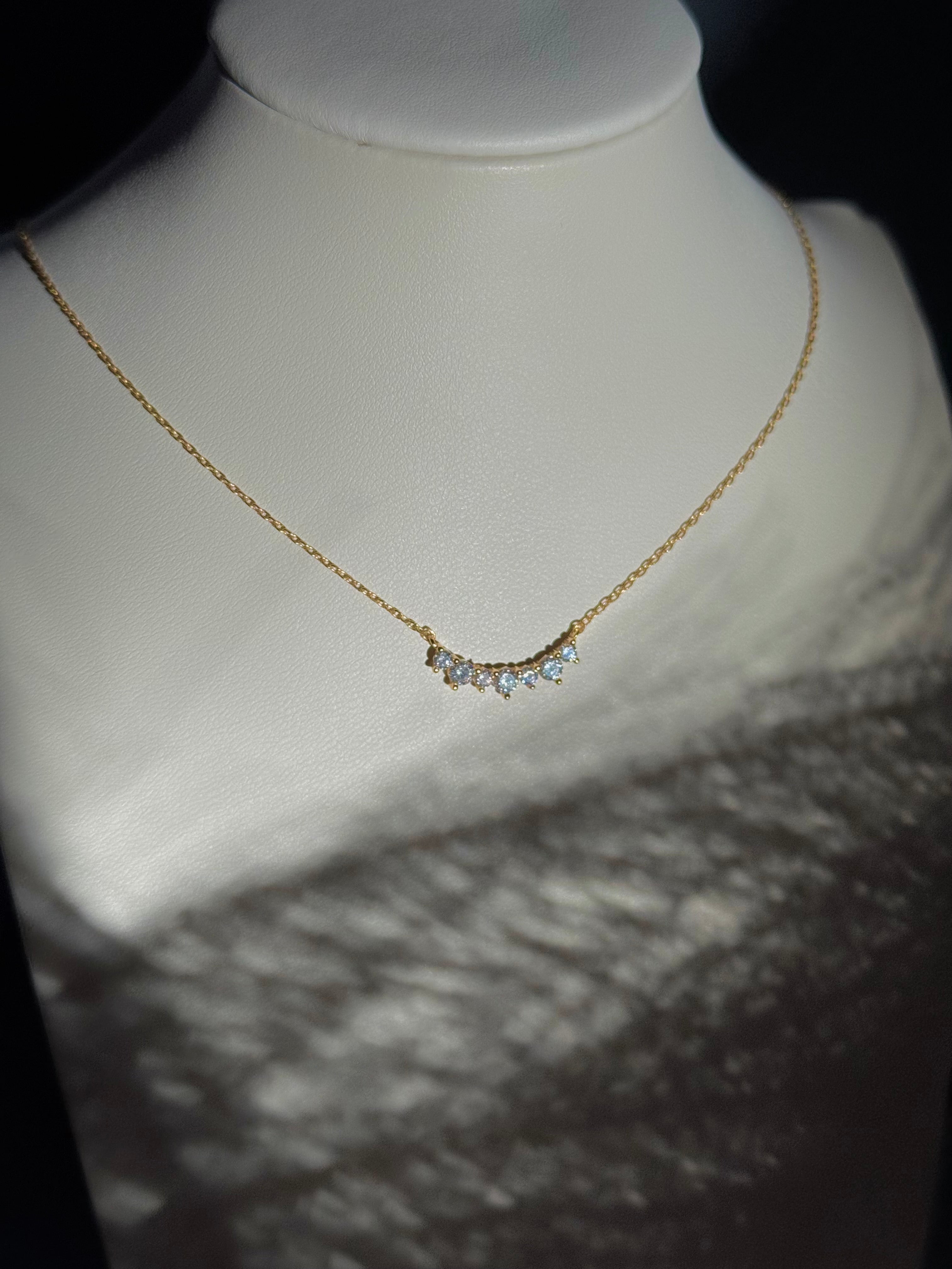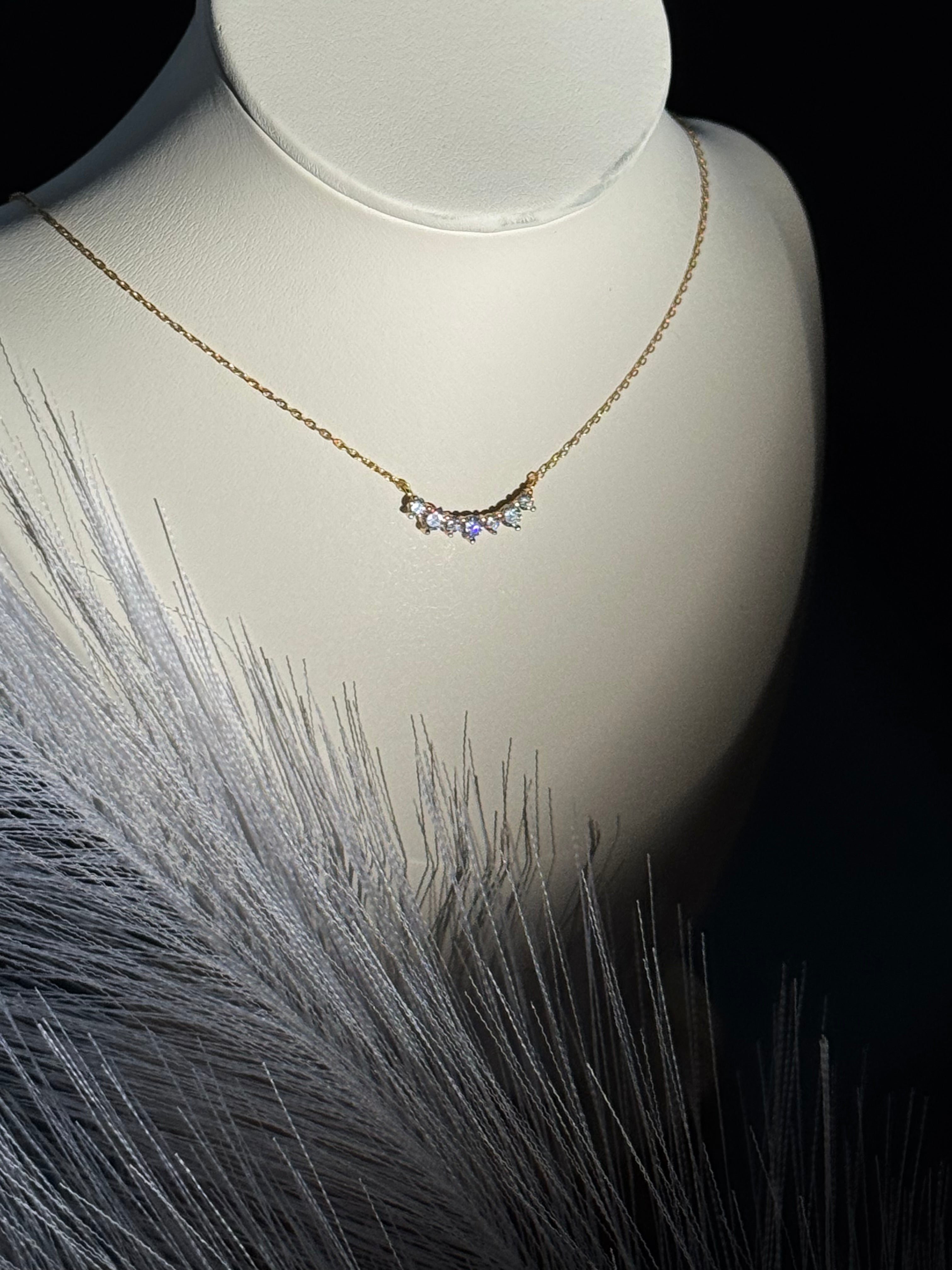 Un’eleganza delicata in formato minimal: questa collana in argento 925 illumina il décolleté con un pendente curvo composto da zirconi cubici bianchi, disposti in una dolce linea crescente.