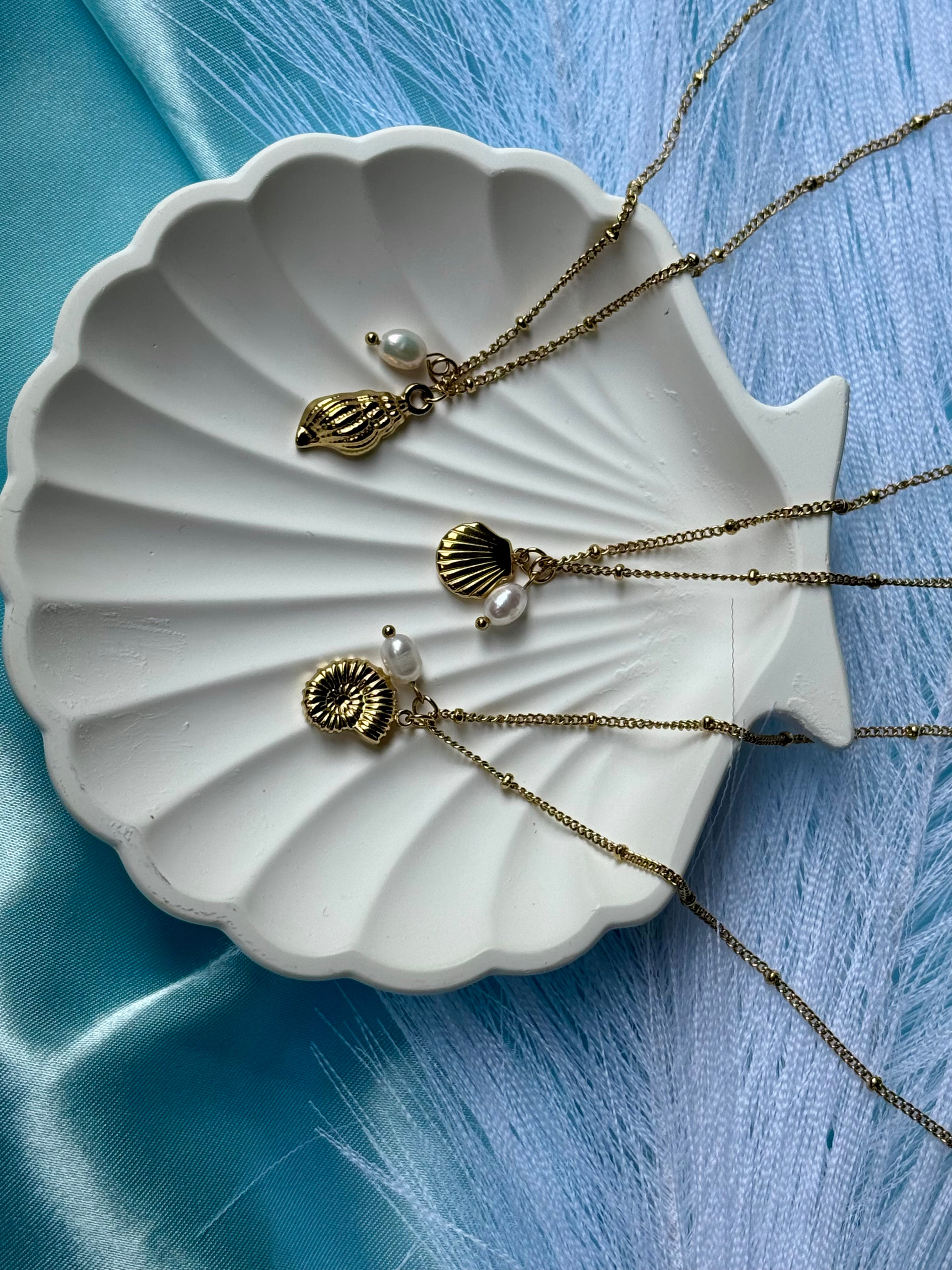 La collana Ocean, in acciaio inox dorato, è impreziosita da un piccolo ciondolo a tema marino, abbinato a una delicata perlina bianca. Perfette da indossare singolarmente o abbinate per un look estivo e luminoso.