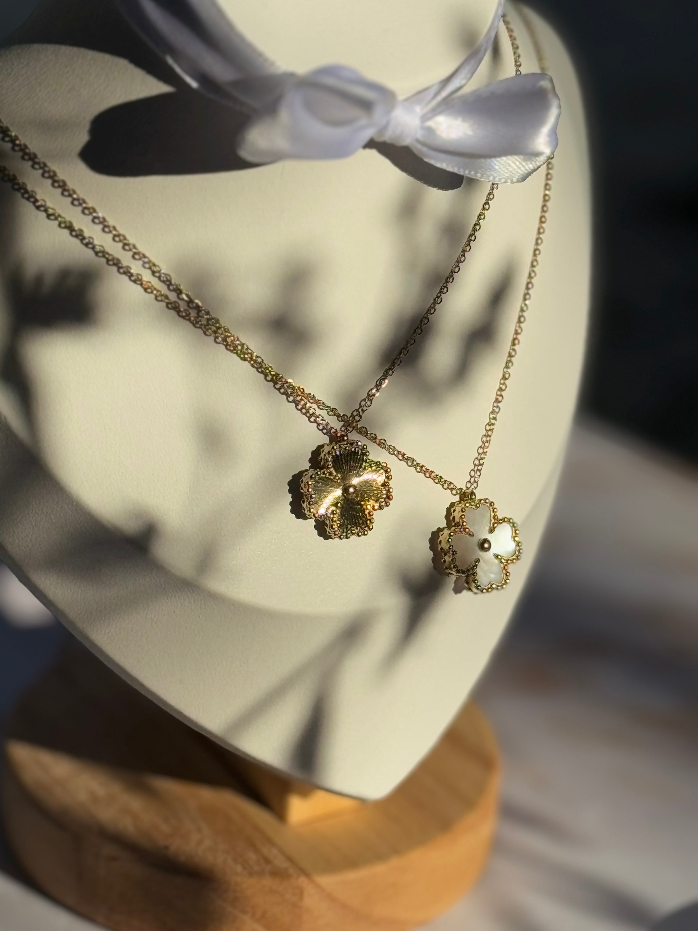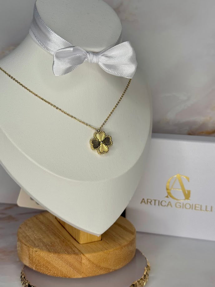 La collana Marygold a forma di quadrifoglio che emana un'eleganza naturale e raffinata. Il ciondolo ha una texture dettagliata che ricrea le delicate venature dei petali, donandogli un aspetto tridimensionale e realistico. Il design del ciondolo è impreziosito da un piccolo punto centrale che aggiunge un tocco di luminosità discreta, mantenendo al contempo uno stile minimalista. La catena sottile mette in risalto il ciondolo senza appesantirlo, rendendo questa collana perfetta per aggiungere un tocco di classe e freschezza a qualsiasi look, sia casual sia formale.