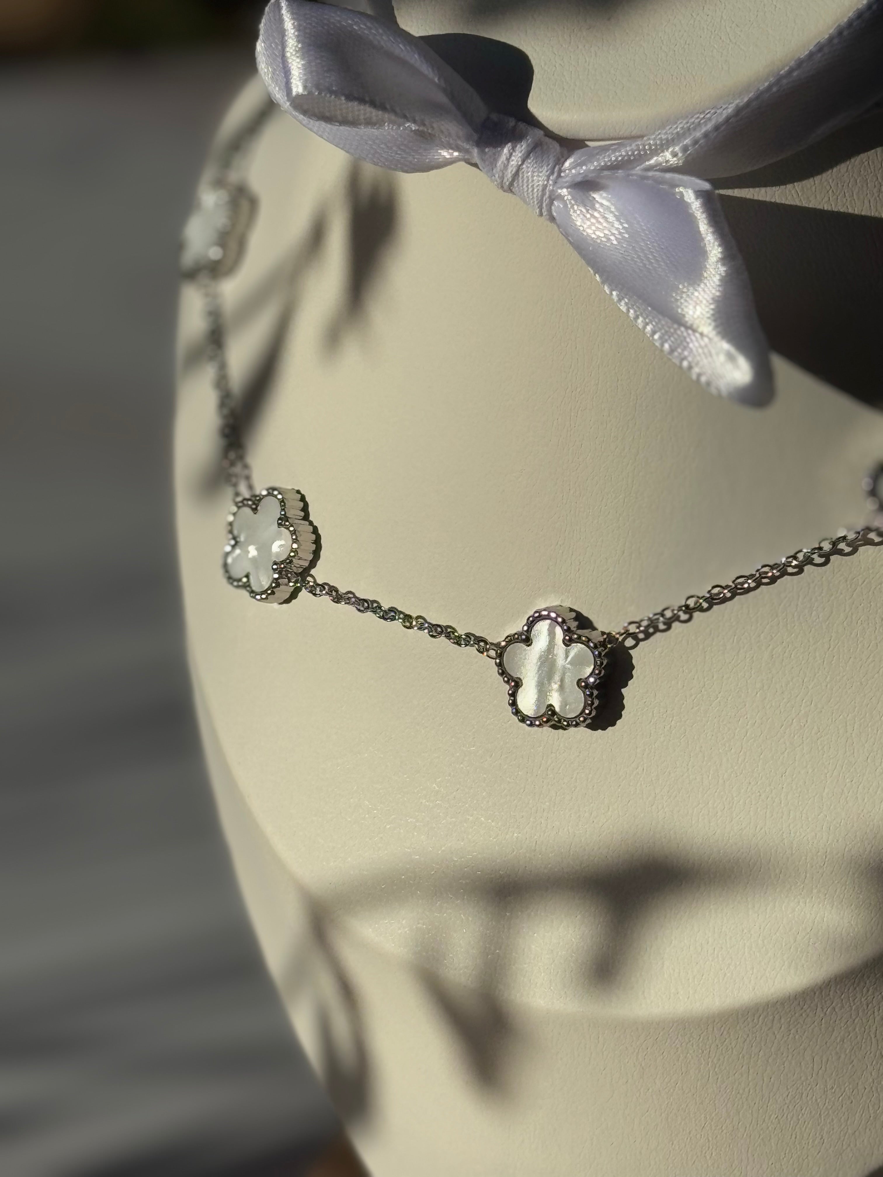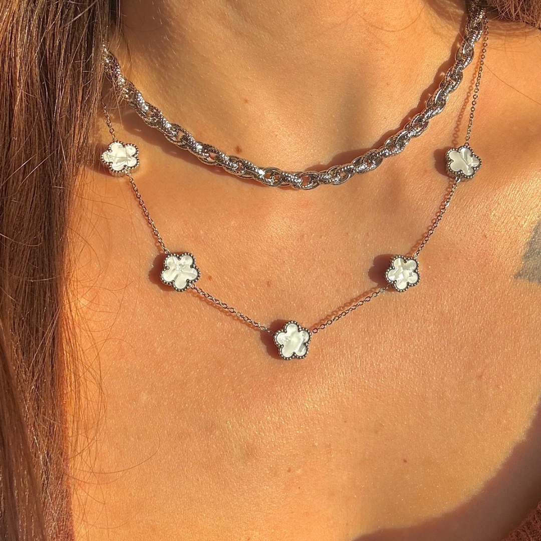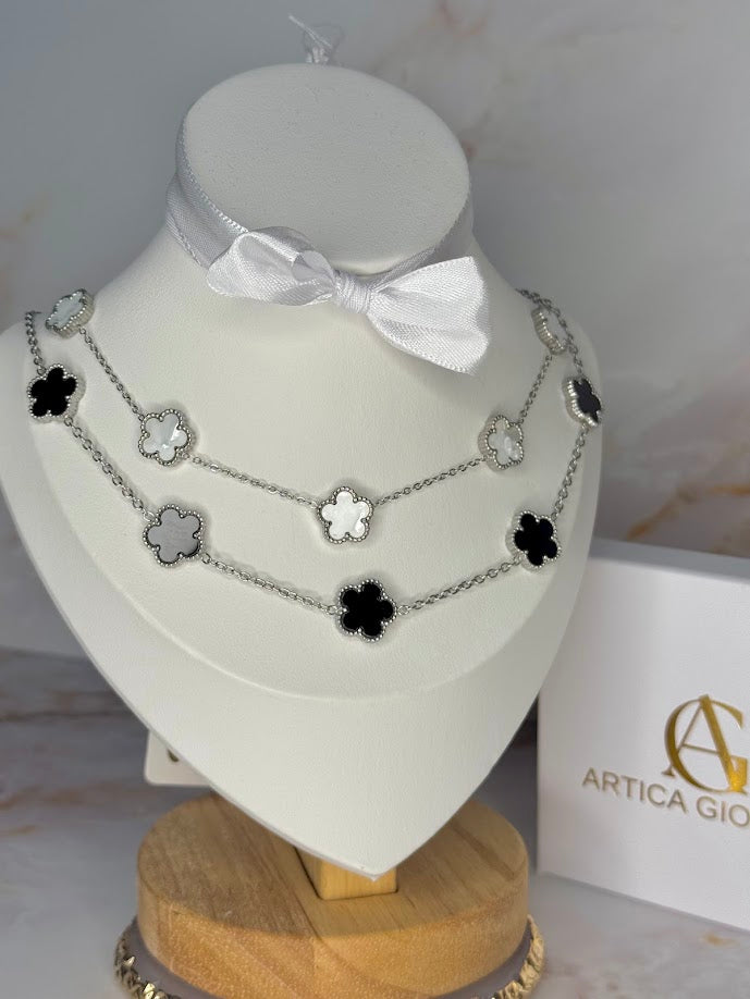 La collana Emily Silver presentano un design sofisticato e moderno, composto da 5 eleganti motivi floreali stilizzati in bianco madreperla o nero, distribuiti in modo alternato su due catene argentate. I fiori sono incorniciati da una finitura argentata che conferisce ulteriore eleganza e contrasto ai colori bianco e nero dei ciondoli, dando un effetto di raffinatezza e versatilità.