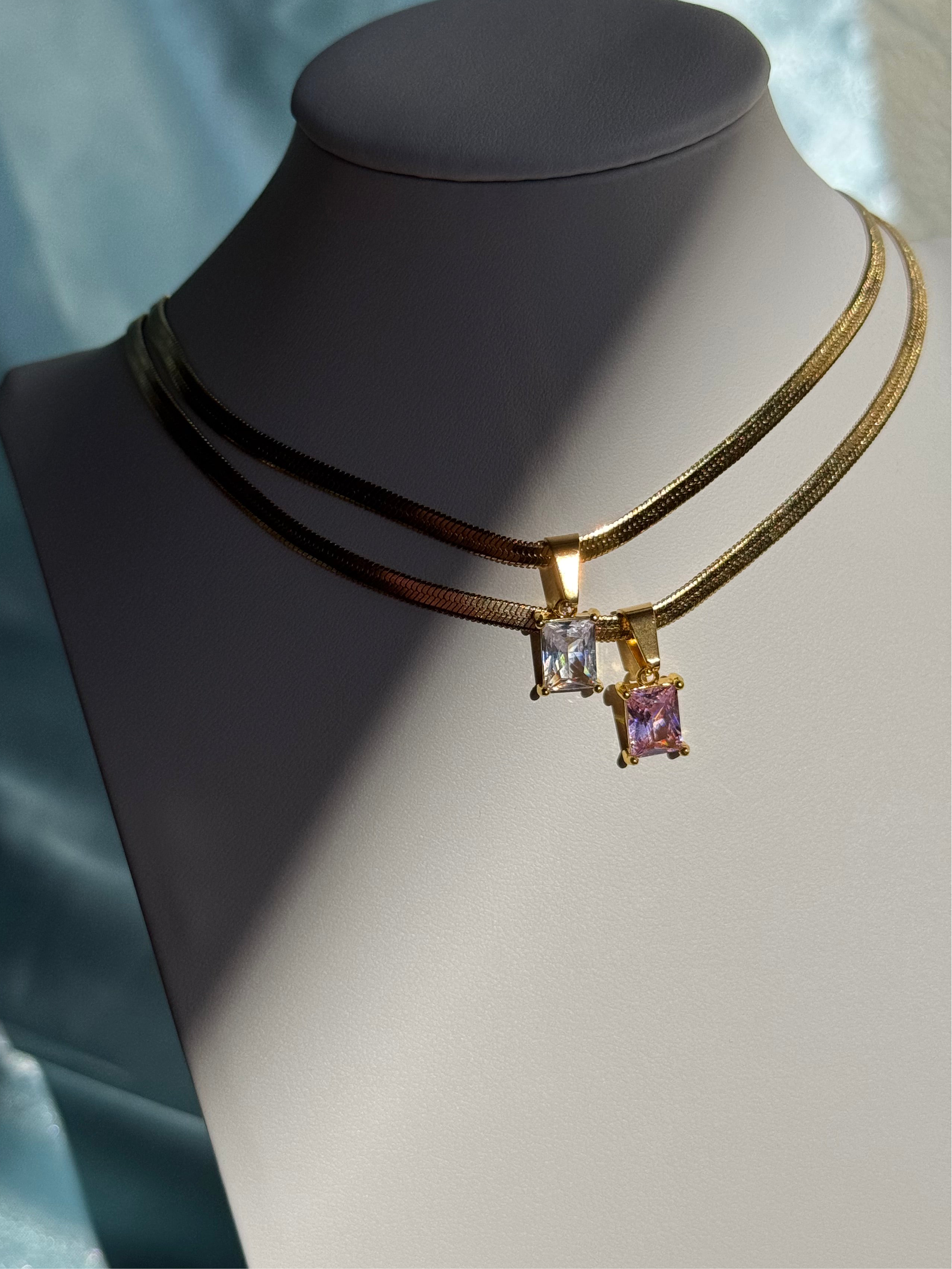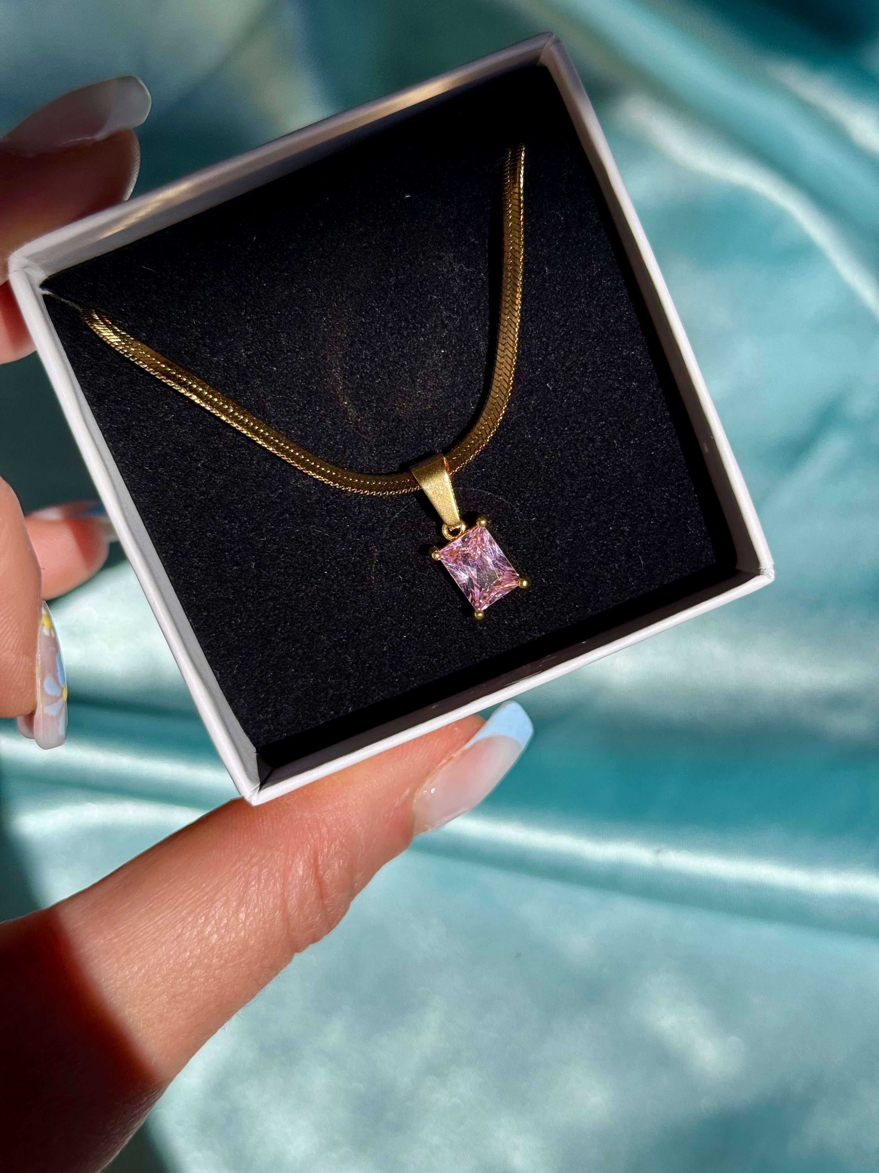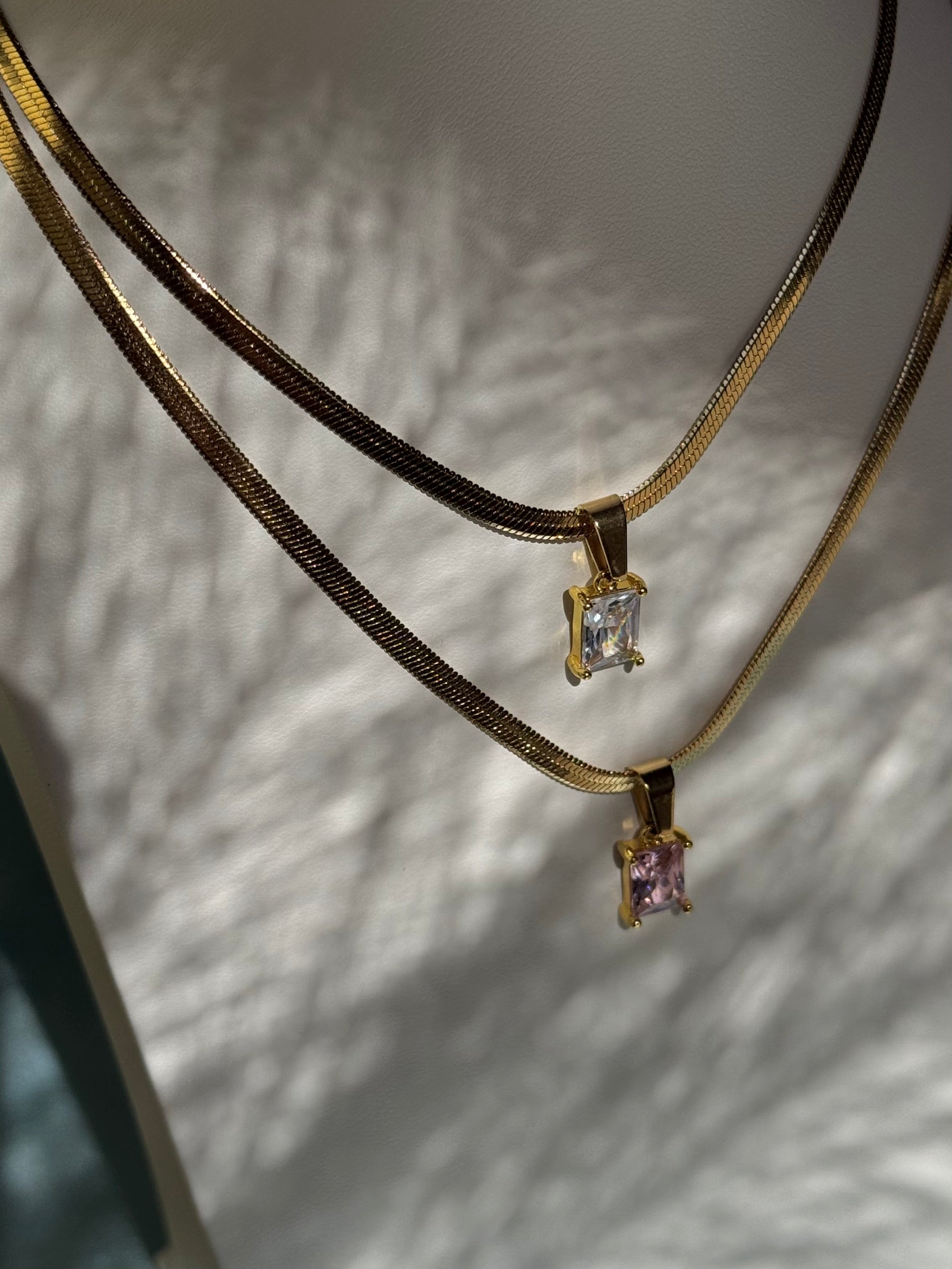 La collana Solea, realizzata in acciaio inossidabile, è caratterizzata da una catena snake dorata e ciondolo in zirconia cubica rosa o bianco taglio rettangolare. Elegante e luminosa, è perfetta per dare un tocco raffinato sia a look casual che più eleganti.