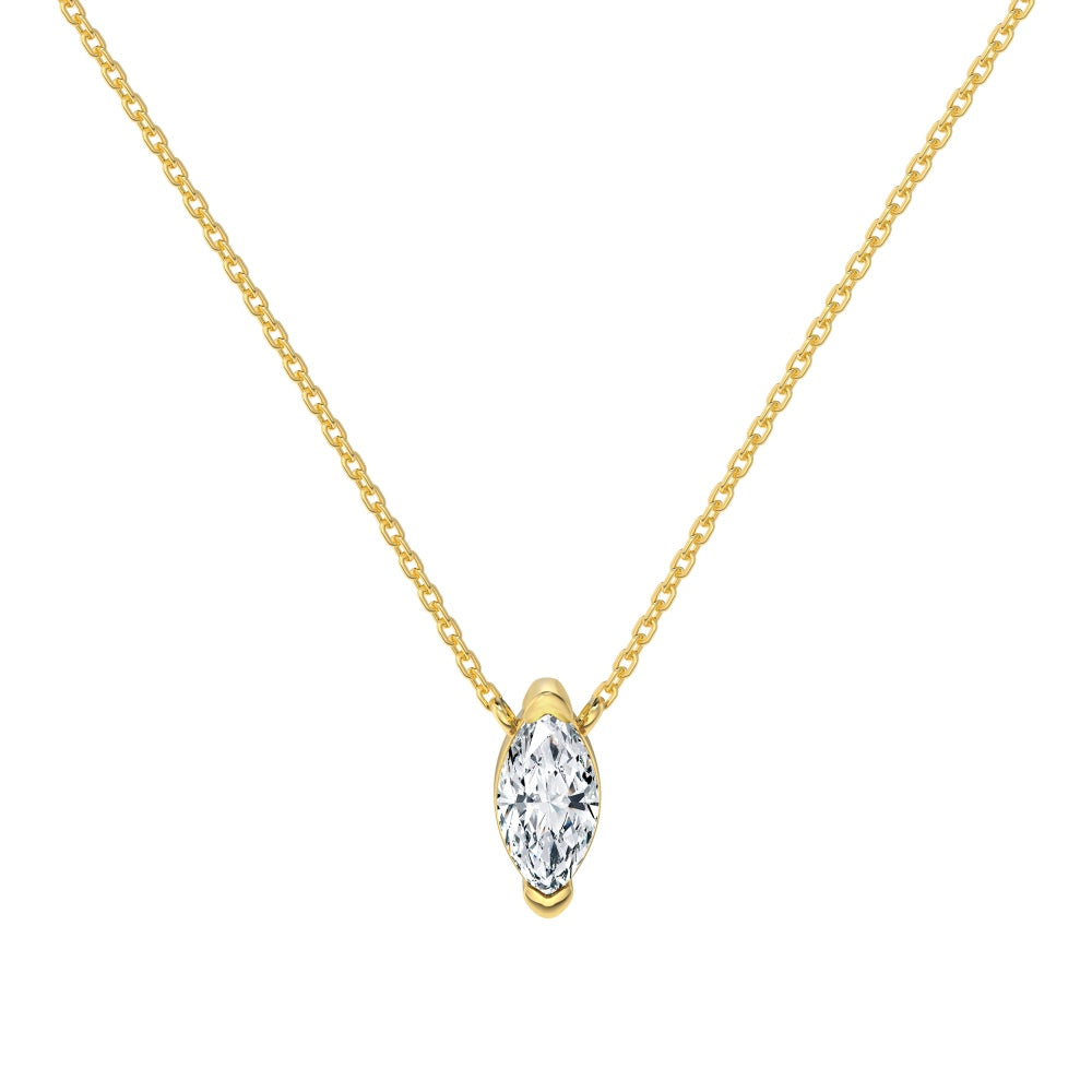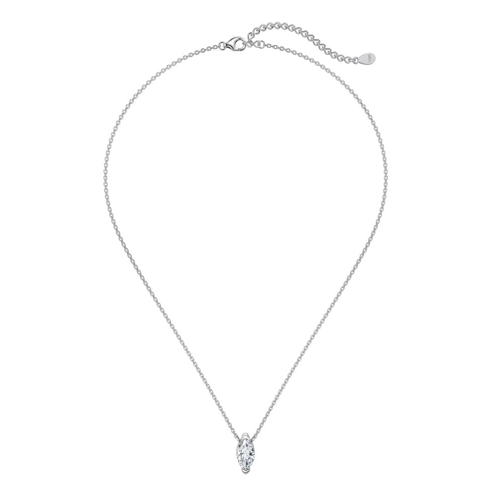 La collana Eira è realizzata in argento 925 con una luminosa zirconia taglio marquise montata verticalmente come pendente solitario. Catena finissima e regolabile che dona eleganza minimal chic, perfetta sia per il giorno che per occasioni speciali.