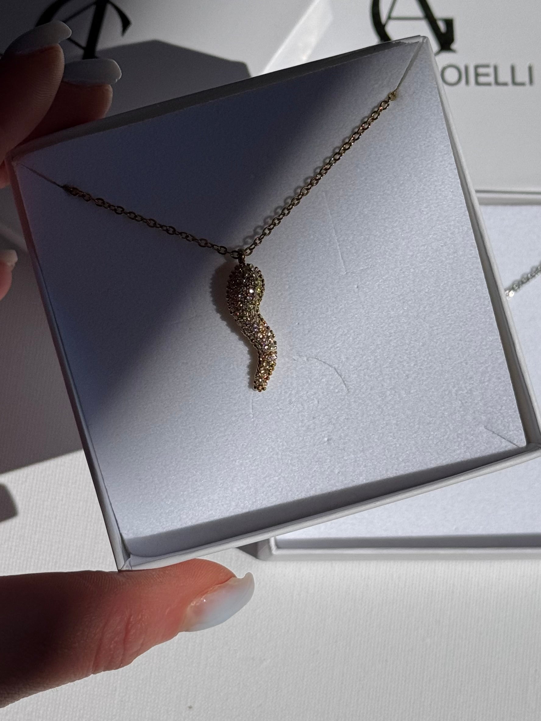 Collana con ciondolo a forma di cornetto portafortuna in acciaio inossidabile. Il ciondolo è impreziosito da zirconi solo sul lato frontale, che aggiungono un tocco di luce ed eleganza.