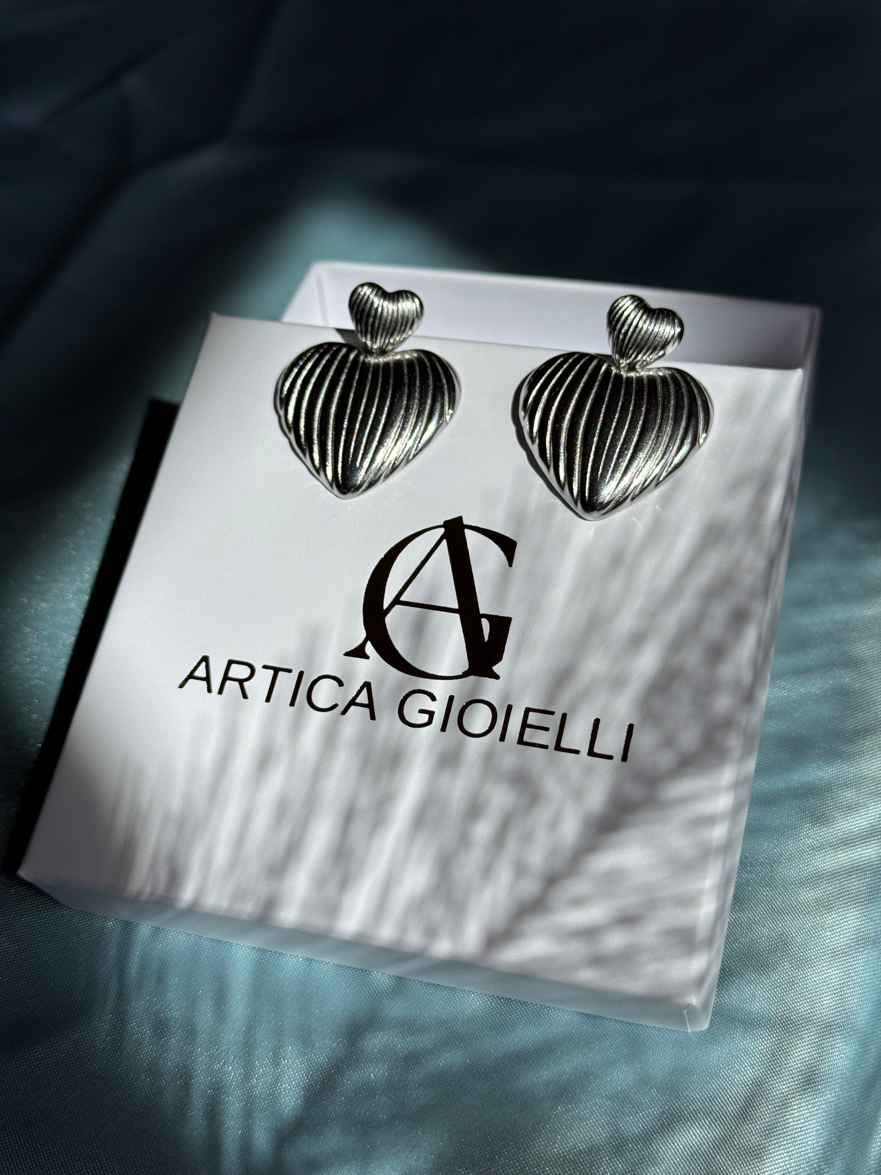 Al di sopra del cuore principale, un elemento più piccolo a forma di cuore completa il design, unendo l’orecchino al perno. Questo piccolo dettaglio riflette e richiama la forma principale, dando continuità al disegno e aggiungendo un tocco sofisticato.