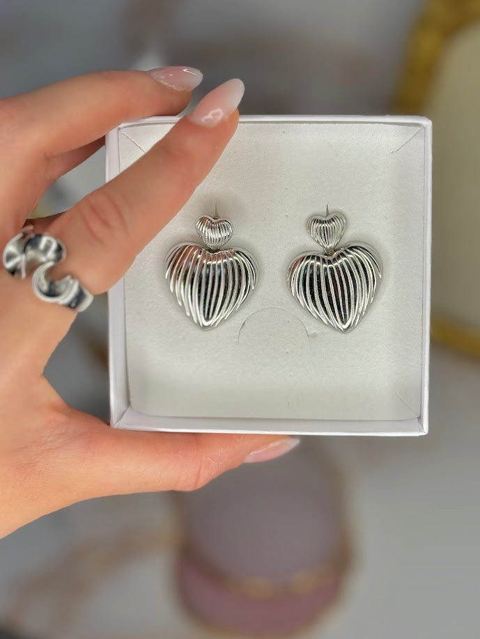 Gli orecchini Linnet hanno un design a forma di cuore con un’estetica moderna e ariosa, realizzati in una finitura argentata lucida. Ogni cuore è formato da sottili linee che si curvano seguendo la sagoma del cuore, creando una struttura cava e tridimensionale che dà leggerezza e movimento al pezzo.