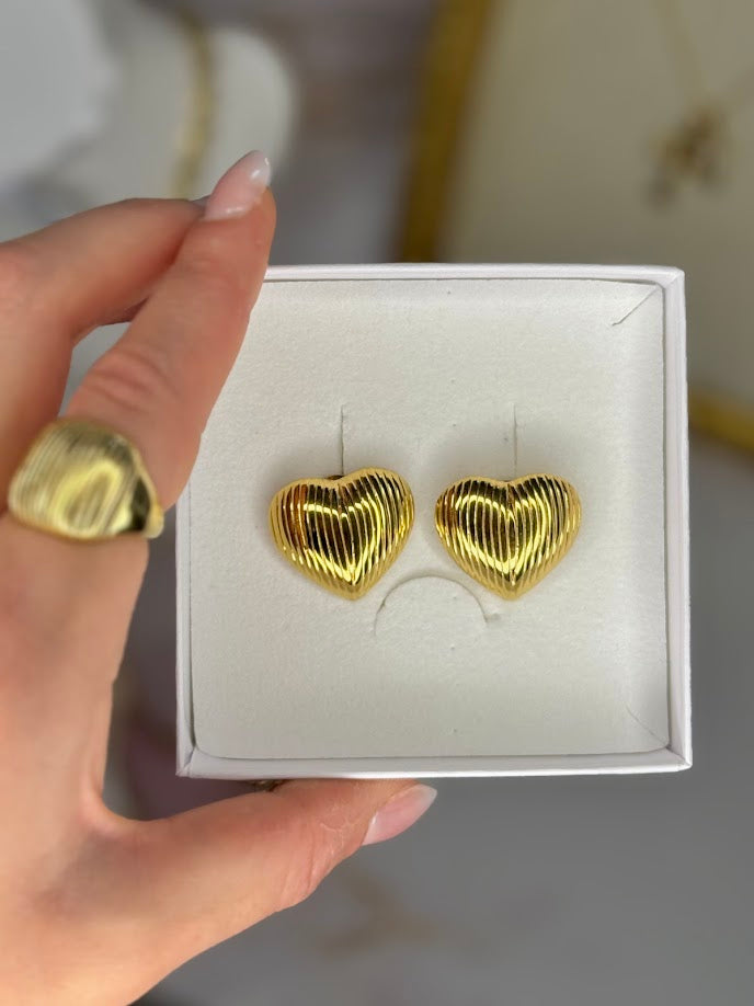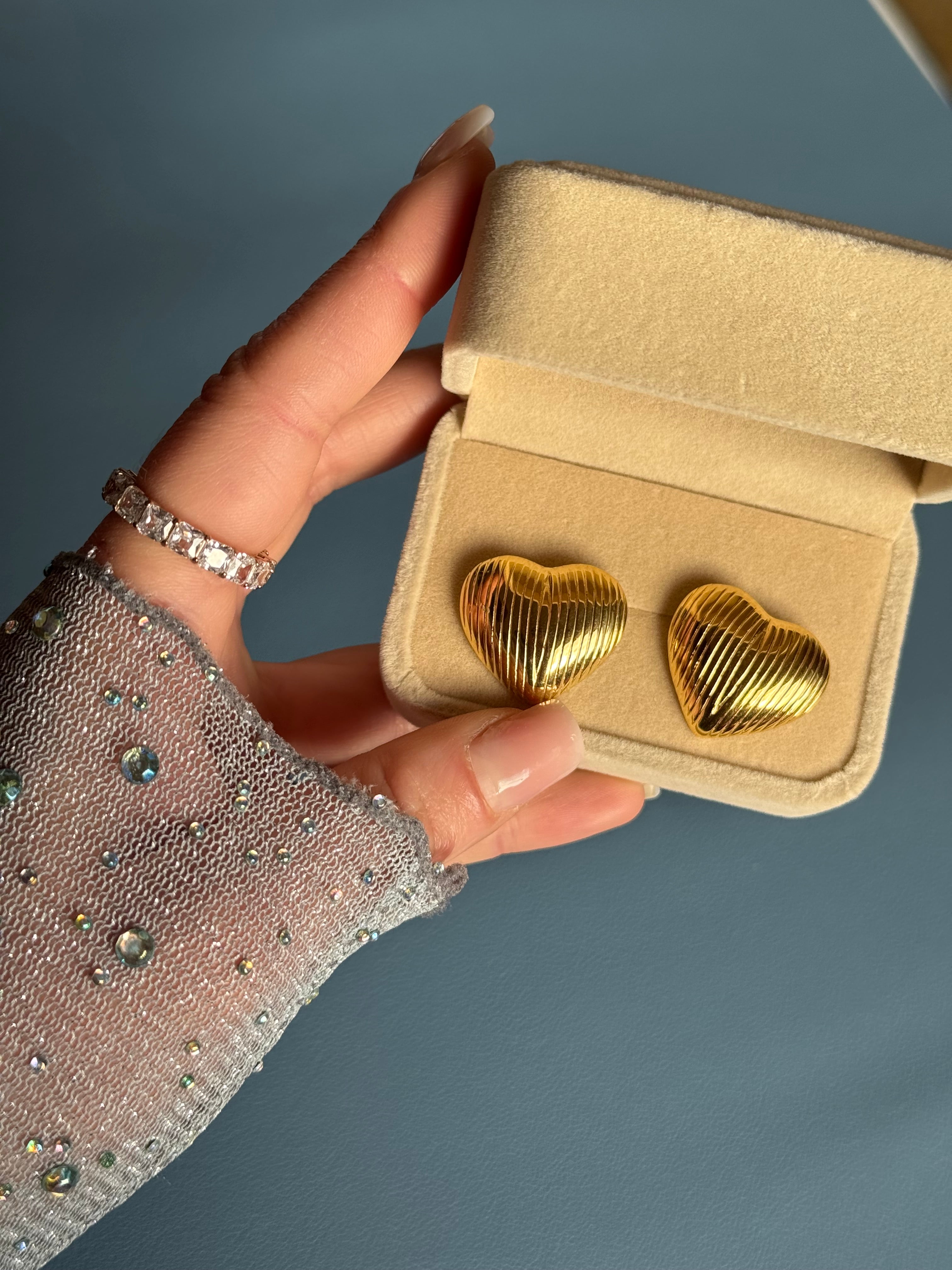 Gli orecchini Love a forma di cuore sono caratterizzati da un design elegante e accattivante. Realizzati in una finitura dorata lucida, presentano una texture a righe verticali che attraversa tutta la superficie, creando un effetto di rilievo che cattura la luce in modo sofisticato. La forma bombata dei cuori dona tridimensionalità, facendo risaltare i dettagli del motivo a righe.