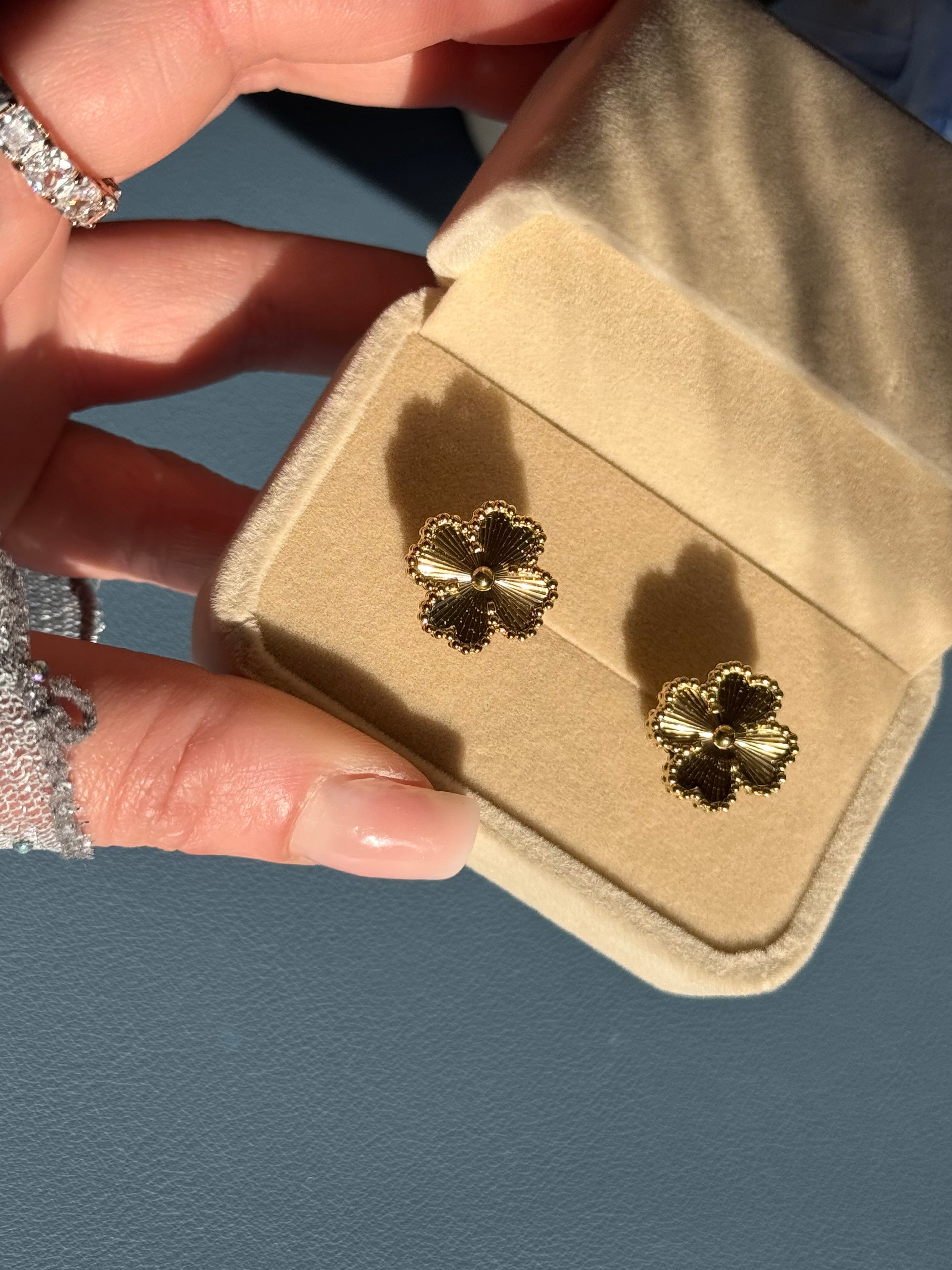 Gli orecchini Marygold sono eleganti e presentano un design a forma di quadrifoglio dorato. Ogni petalo ha una texture incisa, con linee sottili che convergono verso il centro, creando un effetto di luce riflessa che dona profondità al pezzo. Attorno ai bordi dei petali, vi sono piccoli dettagli puntinati che aggiungono un tocco di raffinatezza. Al centro di ogni quadrifoglio c’è un piccolo punto in rilievo che funge da fulcro del design, richiamando la semplicità e l’eleganza del gioiello.