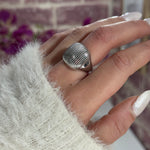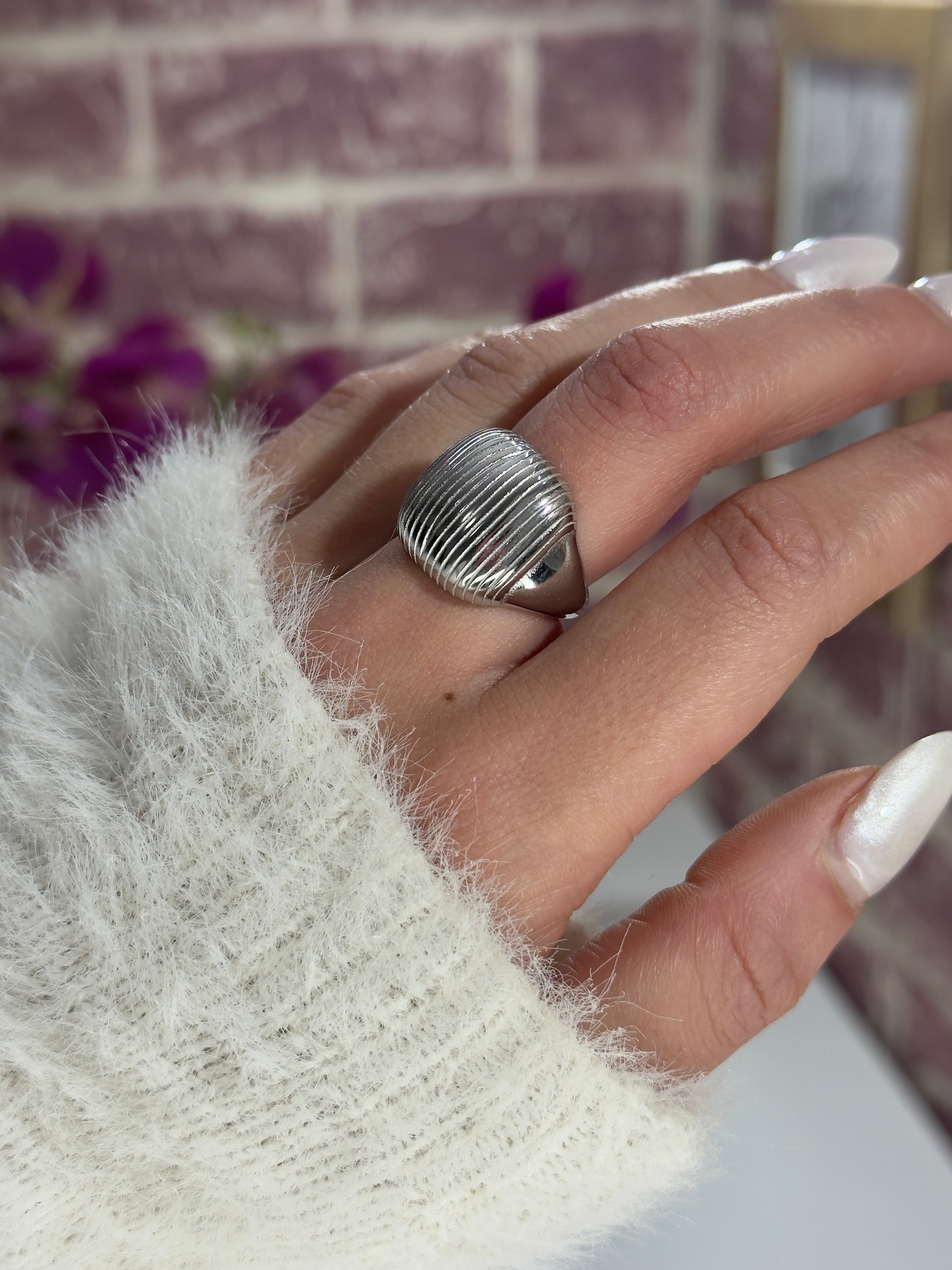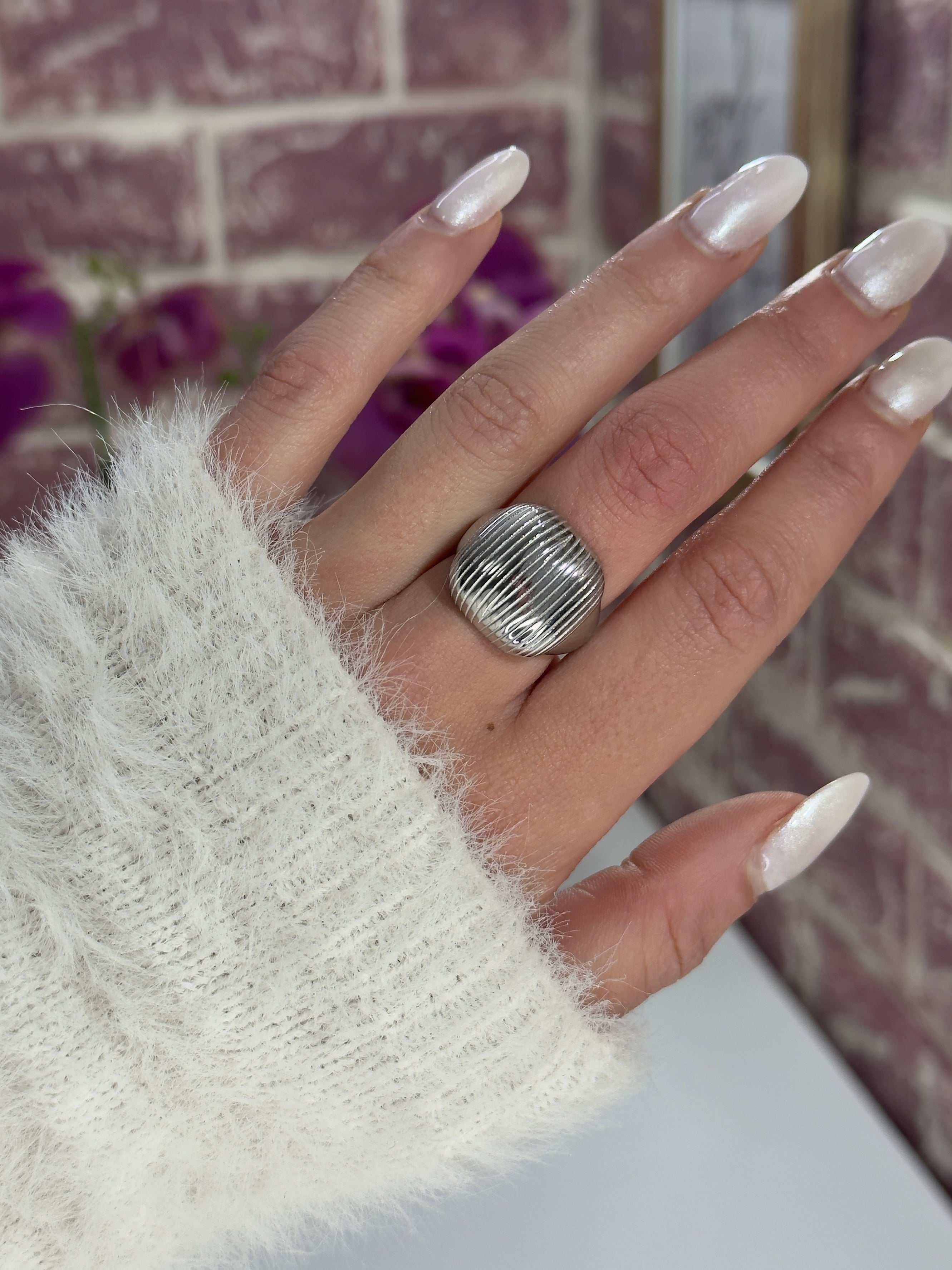 L'anello Eloise presenta un design audace e moderno, caratterizzato da una texture a righe che aggiunge profondità e un tocco distintivo al gioiello. Disponibile in versione dorata e argentata, l’anello ha una superficie lucida che riflette la luce in modo elegante, mettendo in risalto i dettagli della lavorazione. La sua forma aperta sul retro permette una facile regolazione per adattarsi comodamente a varie misure di dito. Perfetto per chi cerca un accessorio sofisticato e di tendenza, ideale per un look contemporaneo