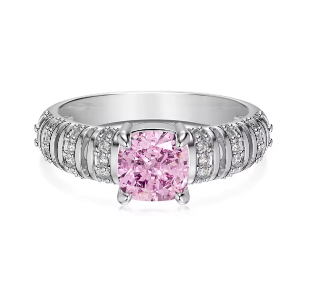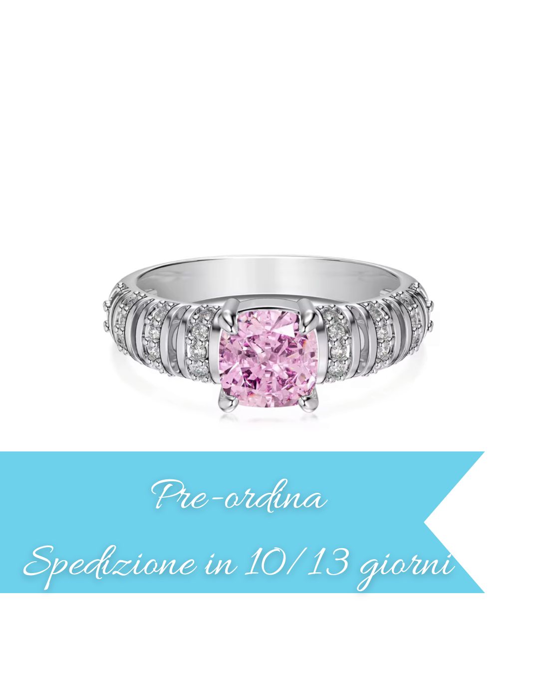 Un anello dal fascino sofisticato e luminoso, caratterizzato da una brillante zirconia rosa centrale che cattura la luce con riflessi intensi. La fascia, impreziosita da una fila di zirconie bianche solo nella parte frontale, crea un equilibrio elegante tra colore e brillantezza. Perfetto per chi ama distinguersi con classe.