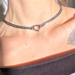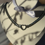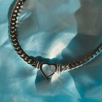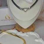 En el centro del collar, como elemento principal, se encuentra un sencillo y refinado colgante hueco en forma de corazón, con contornos suaves y ligeramente redondeados que lo hacen delicado pero al mismo tiempo con un fuerte impacto visual. Este colgante se integra a la cadena con dos pequeñas barras cilíndricas doradas a cada lado, que conectan armoniosamente el corazón con la estructura del collar.