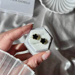Los pendientes Emily se caracterizan por un refinado diseño en forma de flor. Presentan un inserto negro brillante que contrasta elegantemente con el marco dorado, dando un aspecto sofisticado y chic. El borde dorado está decorado con pequeños detalles de esferas, que añaden un toque de delicadeza y realzan la forma de la flor.