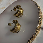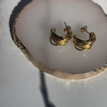 Los pendientes de aro Kelly , en color dorado, presentan un diseño entrelazado, casi como una serie de anillos superpuestos que crean un efecto tridimensional elegante y moderno. La superficie es brillante y refleja la luz de una forma muy sofisticada. La estructura de los pendientes asemeja un nudo trenzado, lo que aporta sensación de movimiento y profundidad.