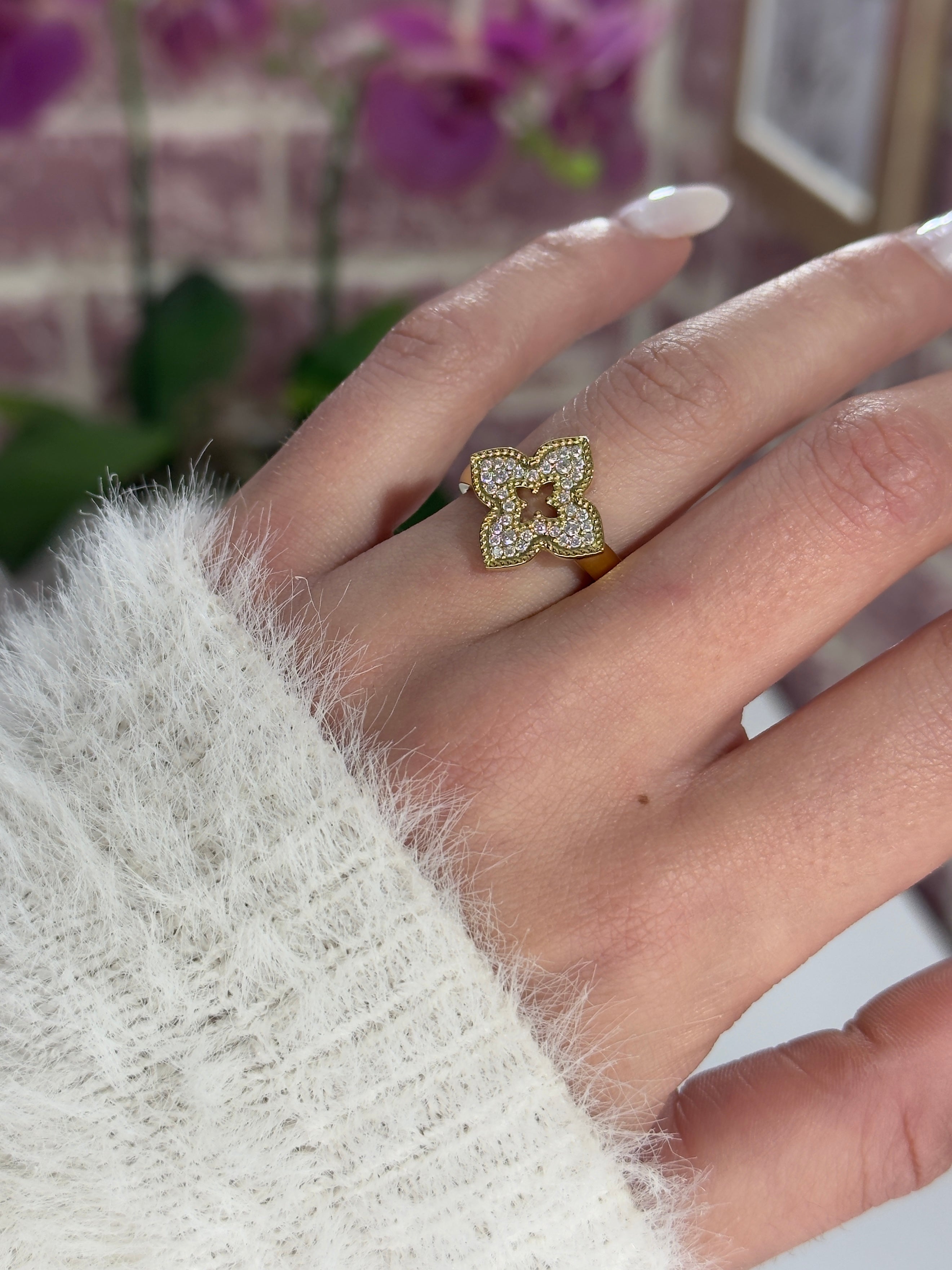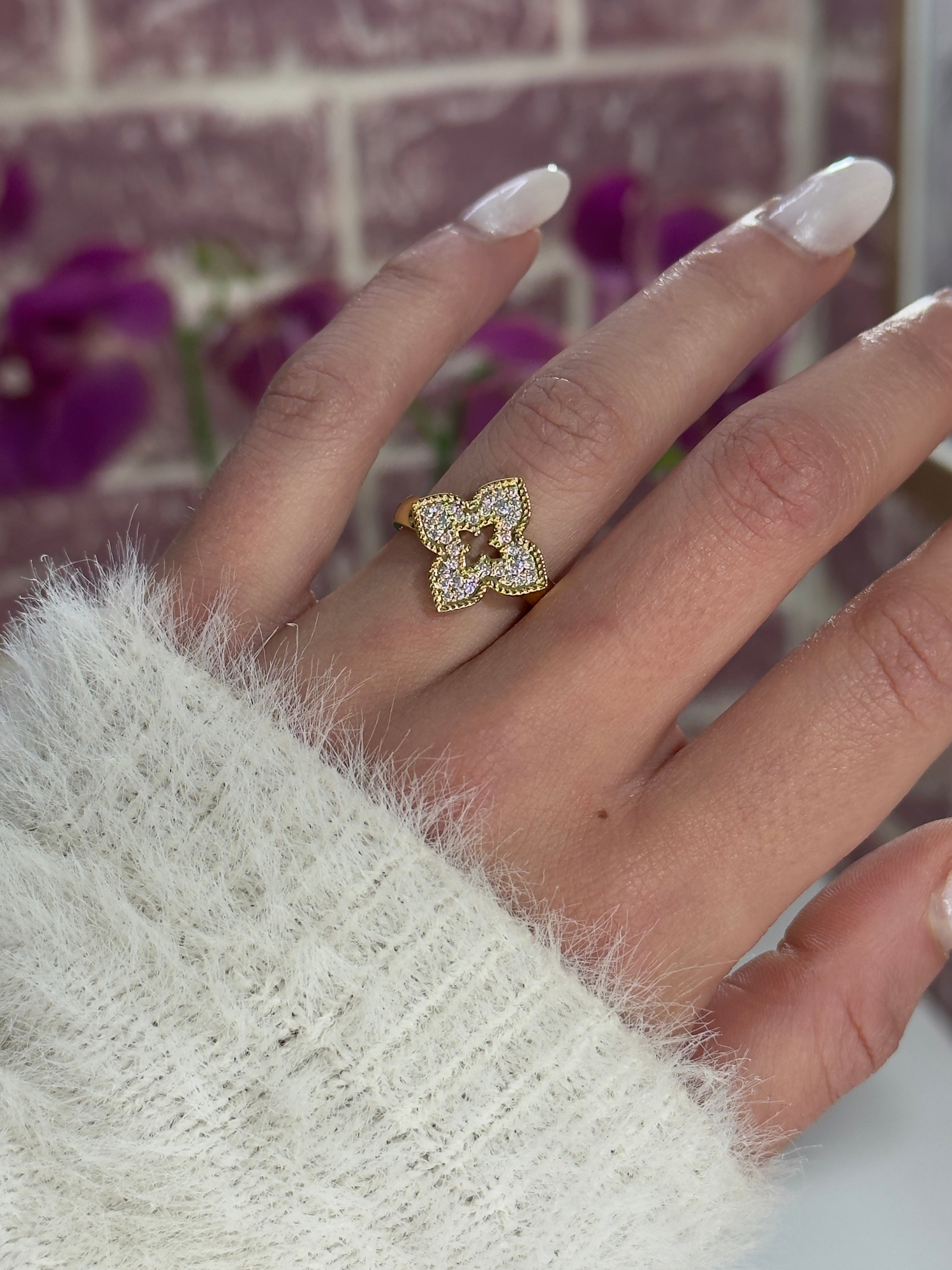 El anillo Ofelia de diseño sofisticado presenta una estructura de acero dorado que realza el brillo de las numerosas circonitas engastadas. La forma central recuerda un motivo floral estilizado o una cruz floral, con líneas sinuosas y delicadas que forman una figura simétrica y refinada. Cada lado está decorado con brillantes circonitas, dispuestas para crear un efecto de brillo intenso y continuo.