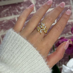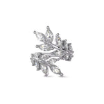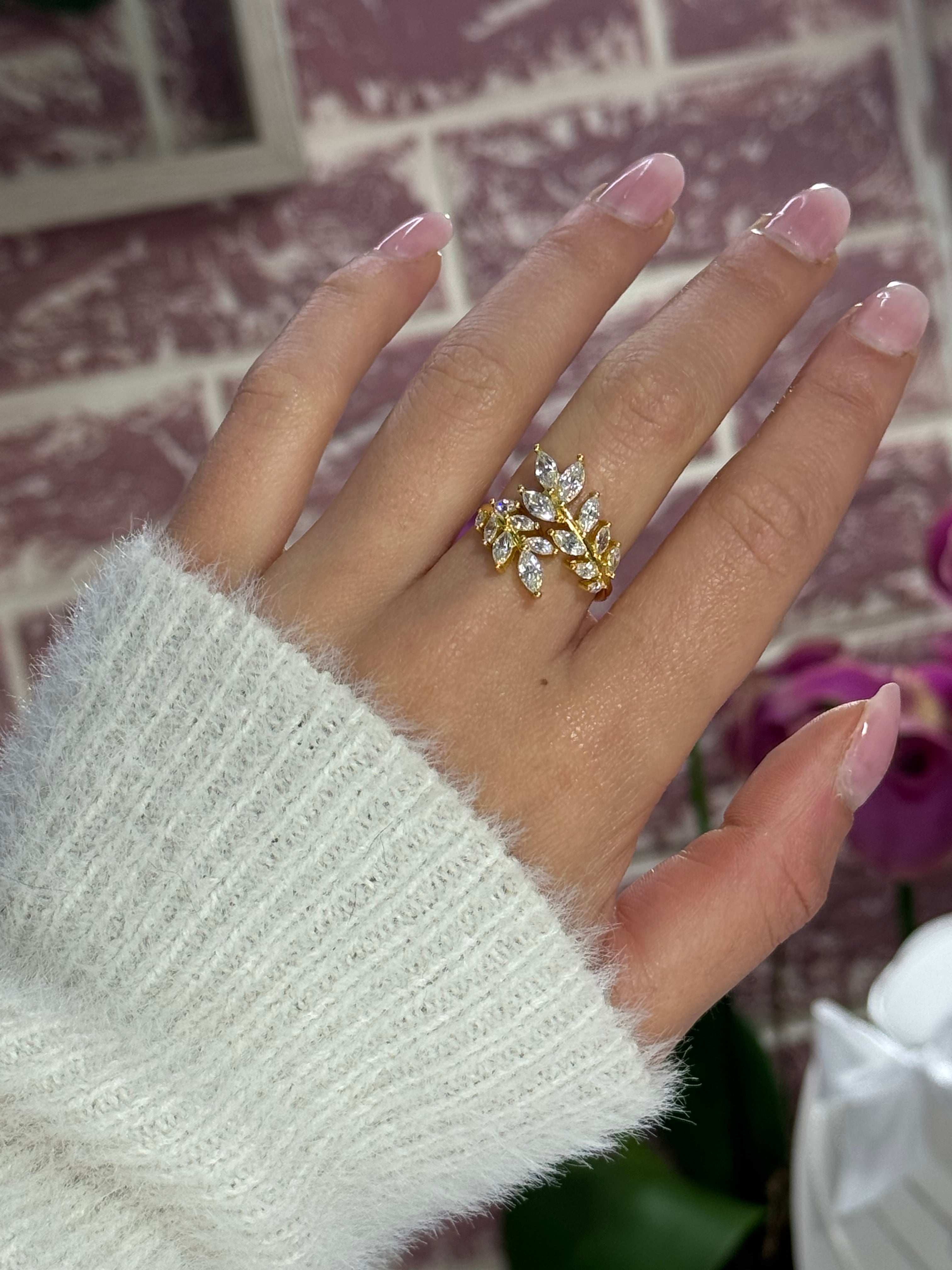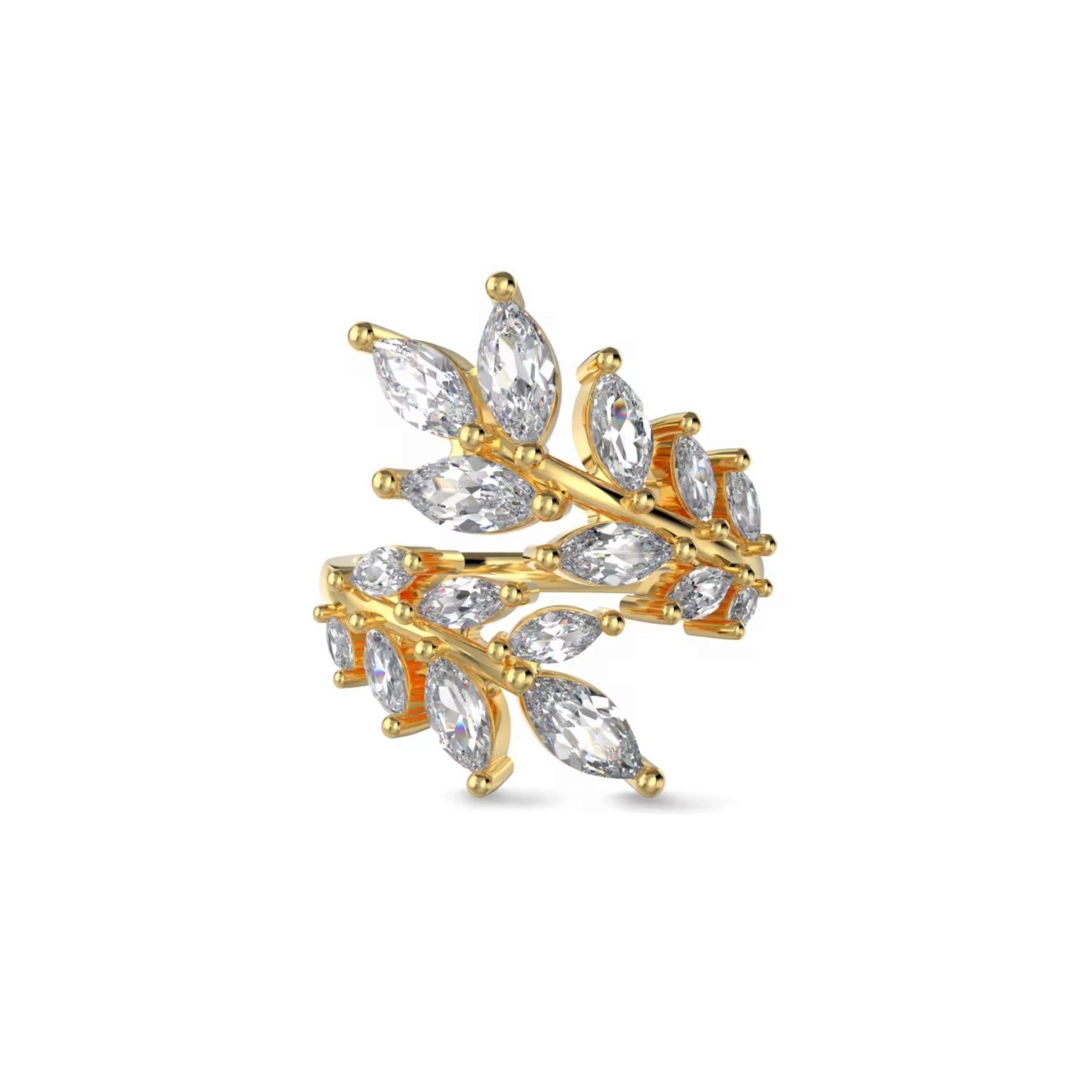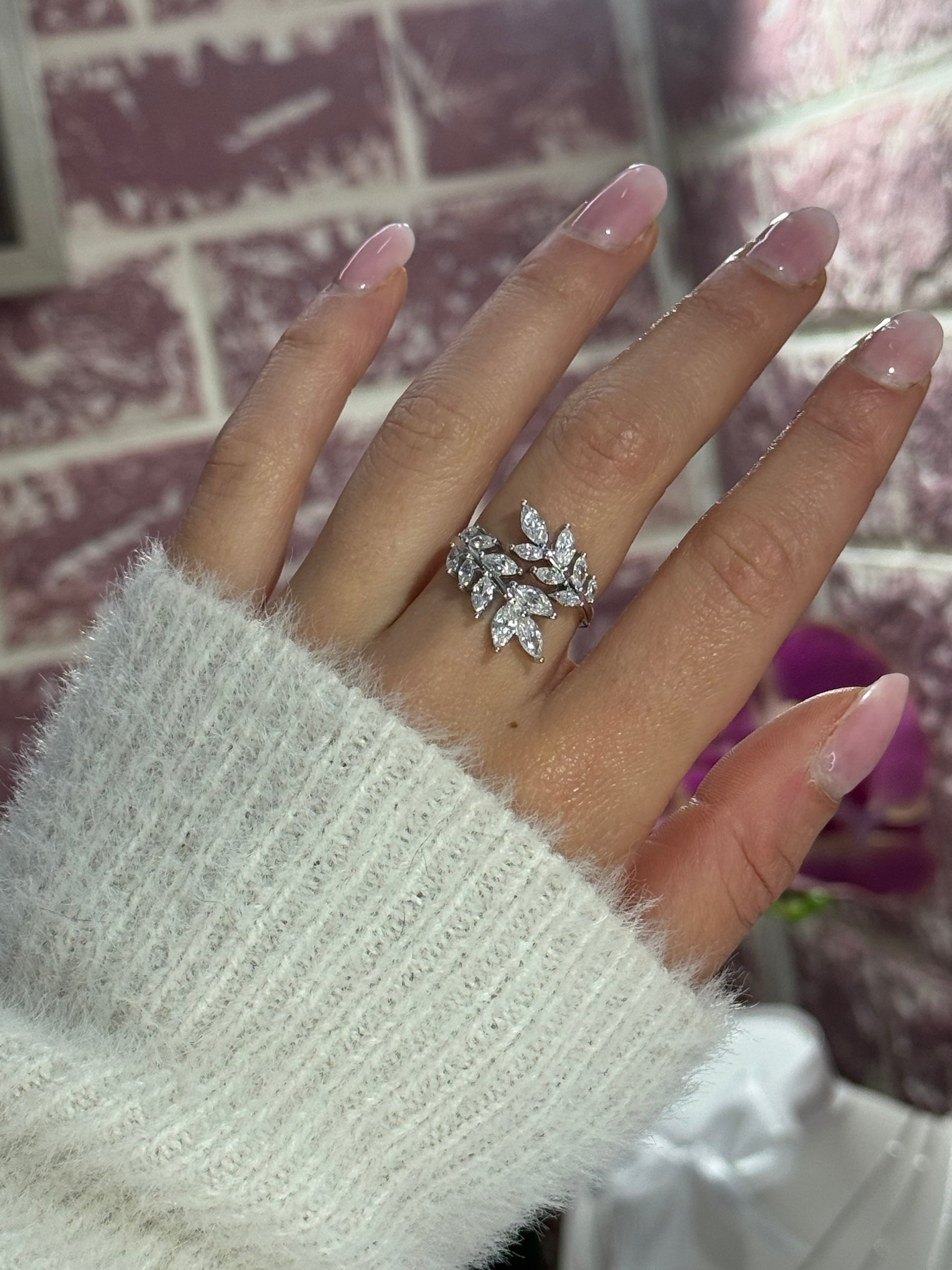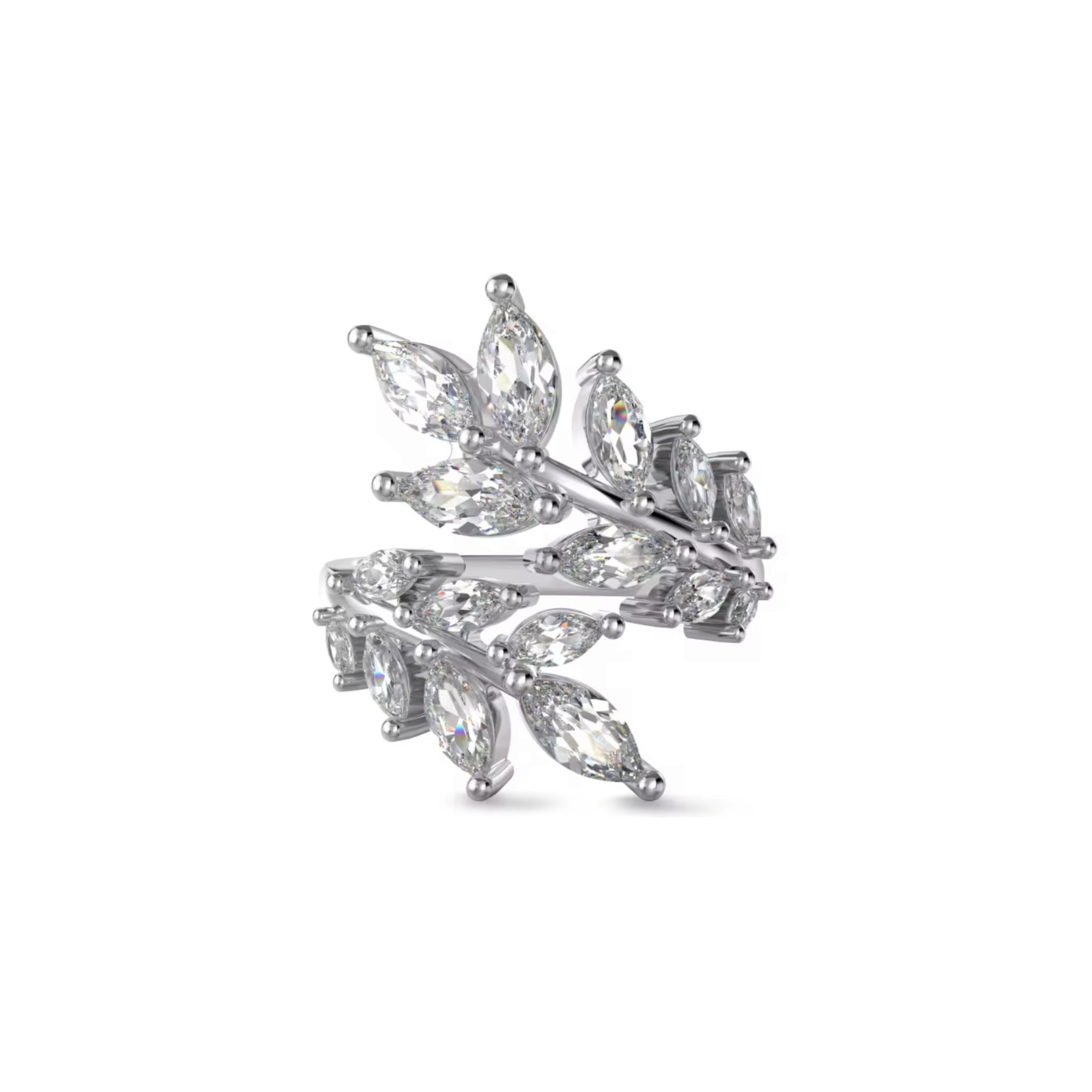 Un raffinato intreccio di foglie che si abbracciano con armonia, illuminato da splendide zirconie cubiche taglio marquise di grado 5A, caratterizzate da una brillantezza paragonabile ai diamanti. Ogni dettaglio è pensato per catturare la luce e valorizzare le mani con eleganza.