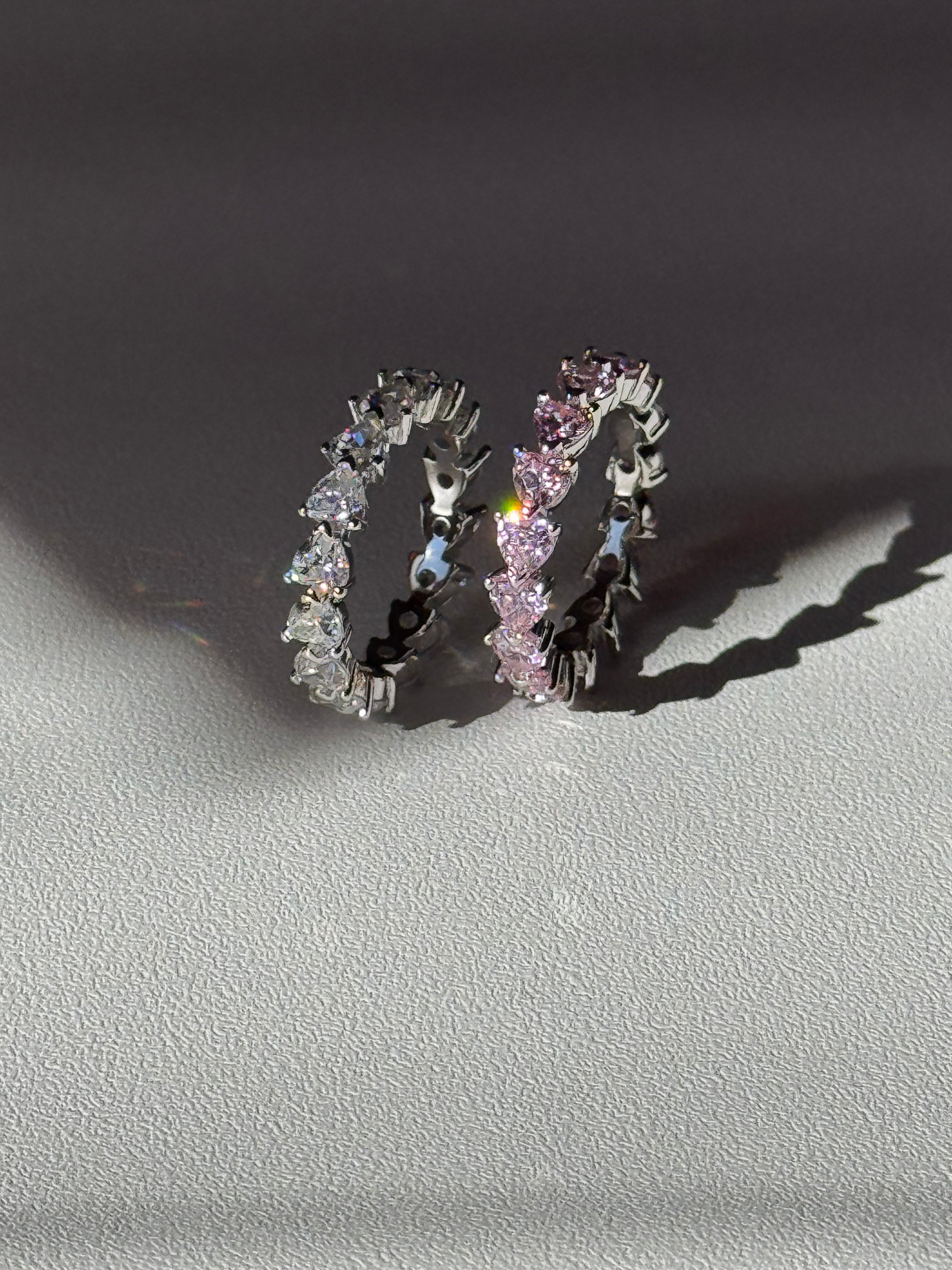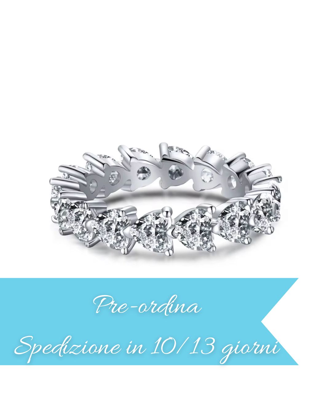Un design luminoso e senza tempo, impreziosito da una fila continua di pietre tagliate a cuore che catturano la luce da ogni angolazione. Realizzato in argento 925 e rifinito con placcatura in rodio , questo anello mantiene nel tempo la sua lucentezza e resiste all'ossidazione, garantendo un'eleganza e durata.