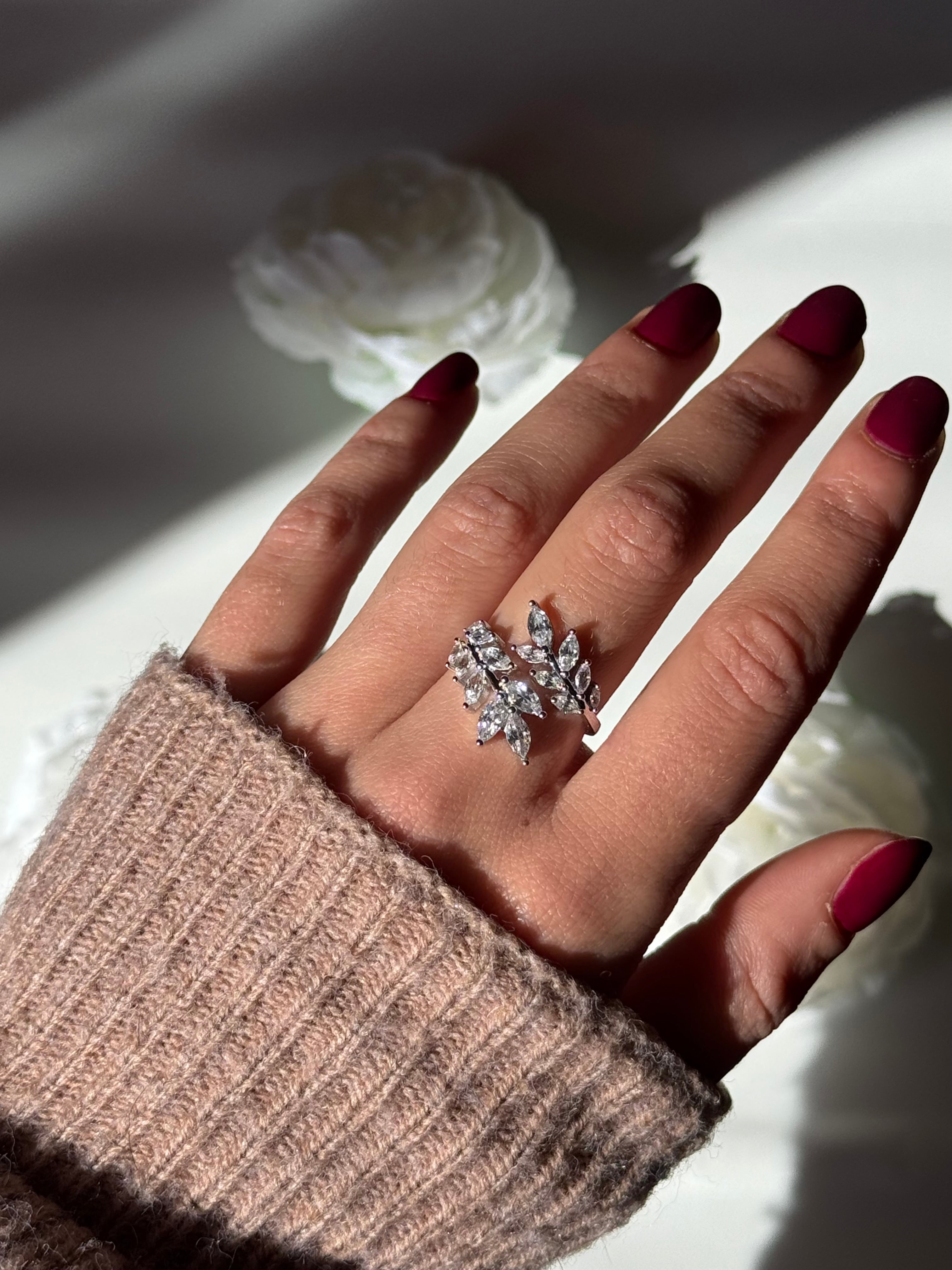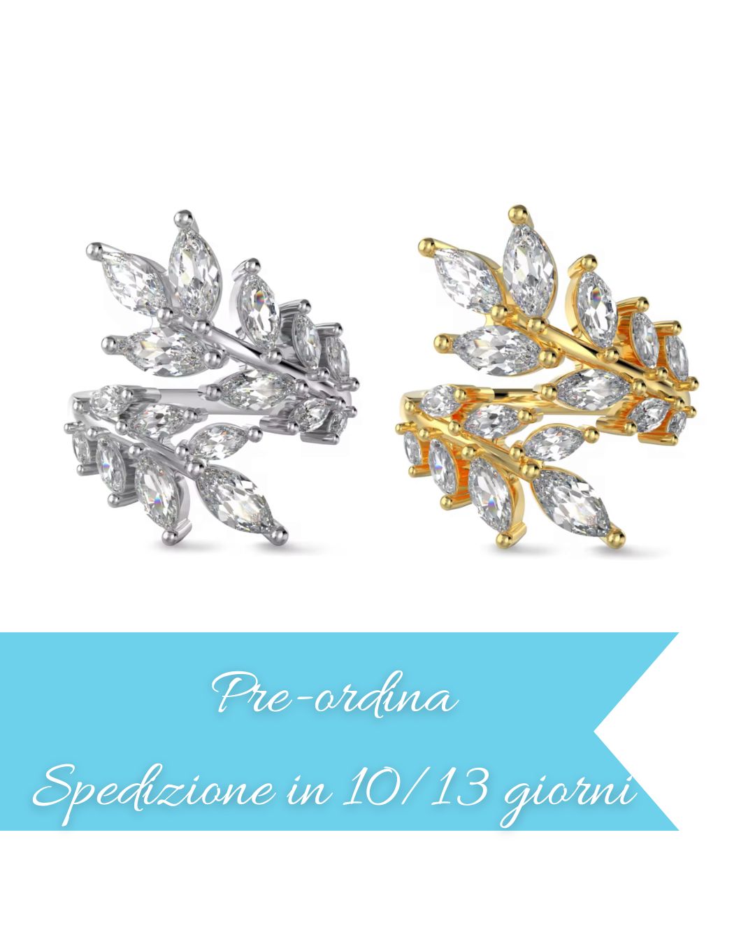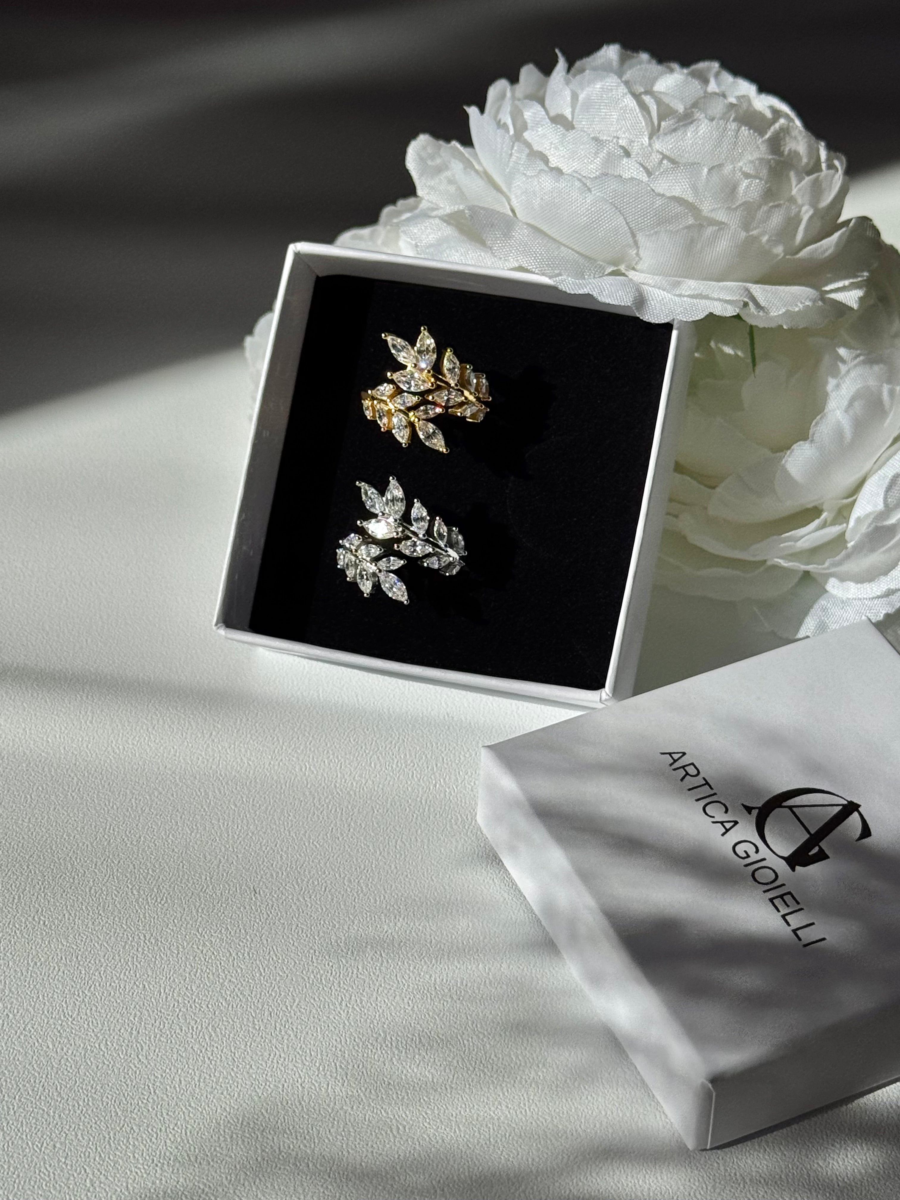 Un raffinato intreccio di foglie che si abbracciano con armonia, illuminato da splendide zirconie cubiche taglio marquise di grado 5A, caratterizzate da una brillantezza paragonabile ai diamanti. Ogni dettaglio è pensato per catturare la luce e valorizzare le mani con eleganza.