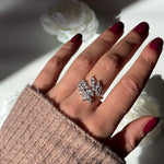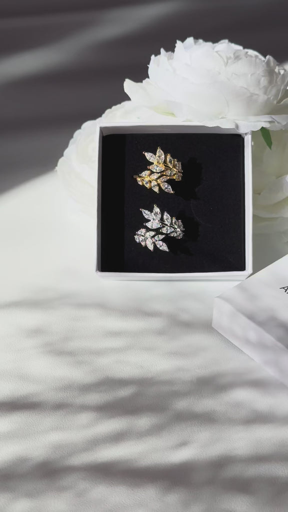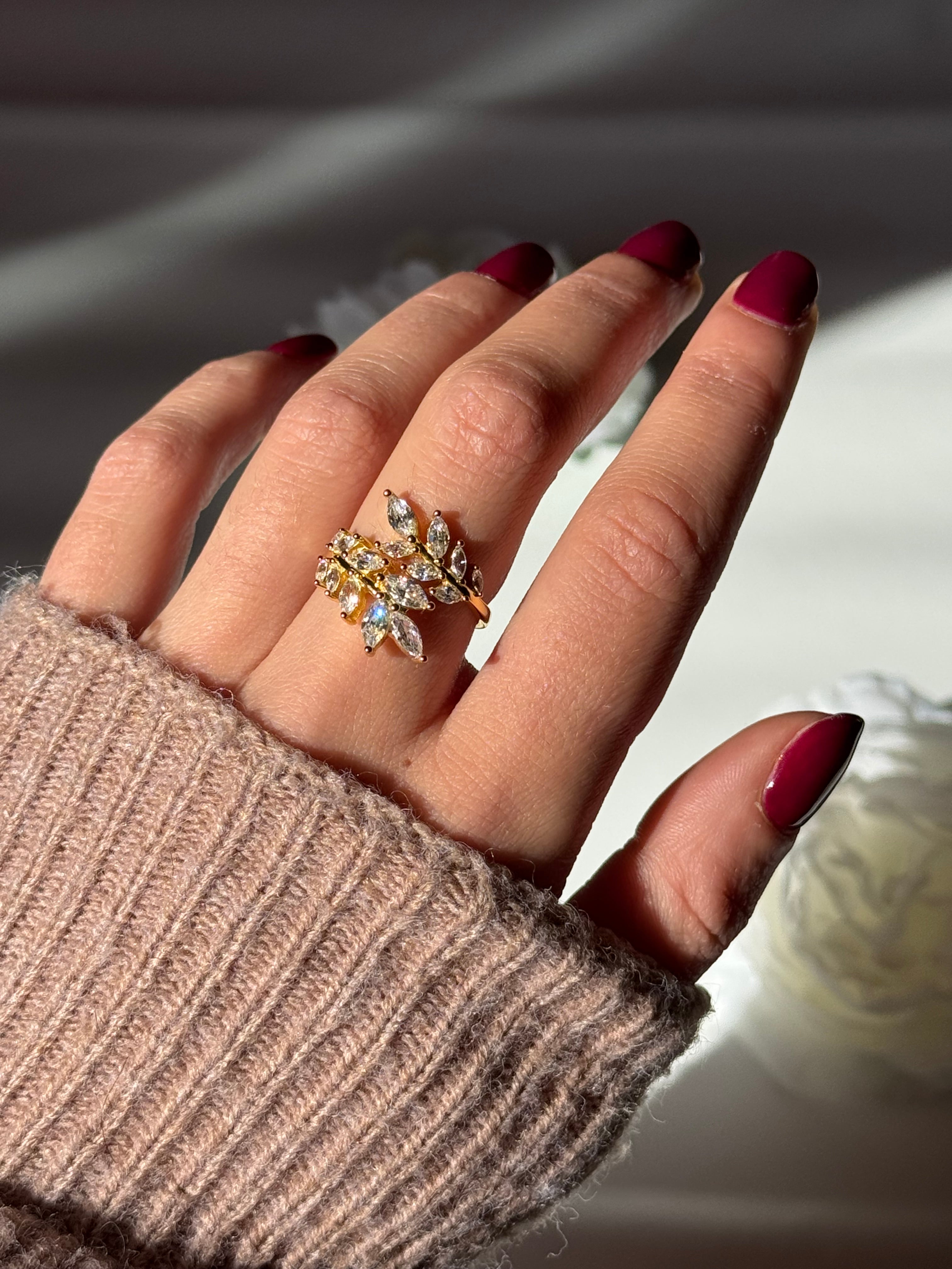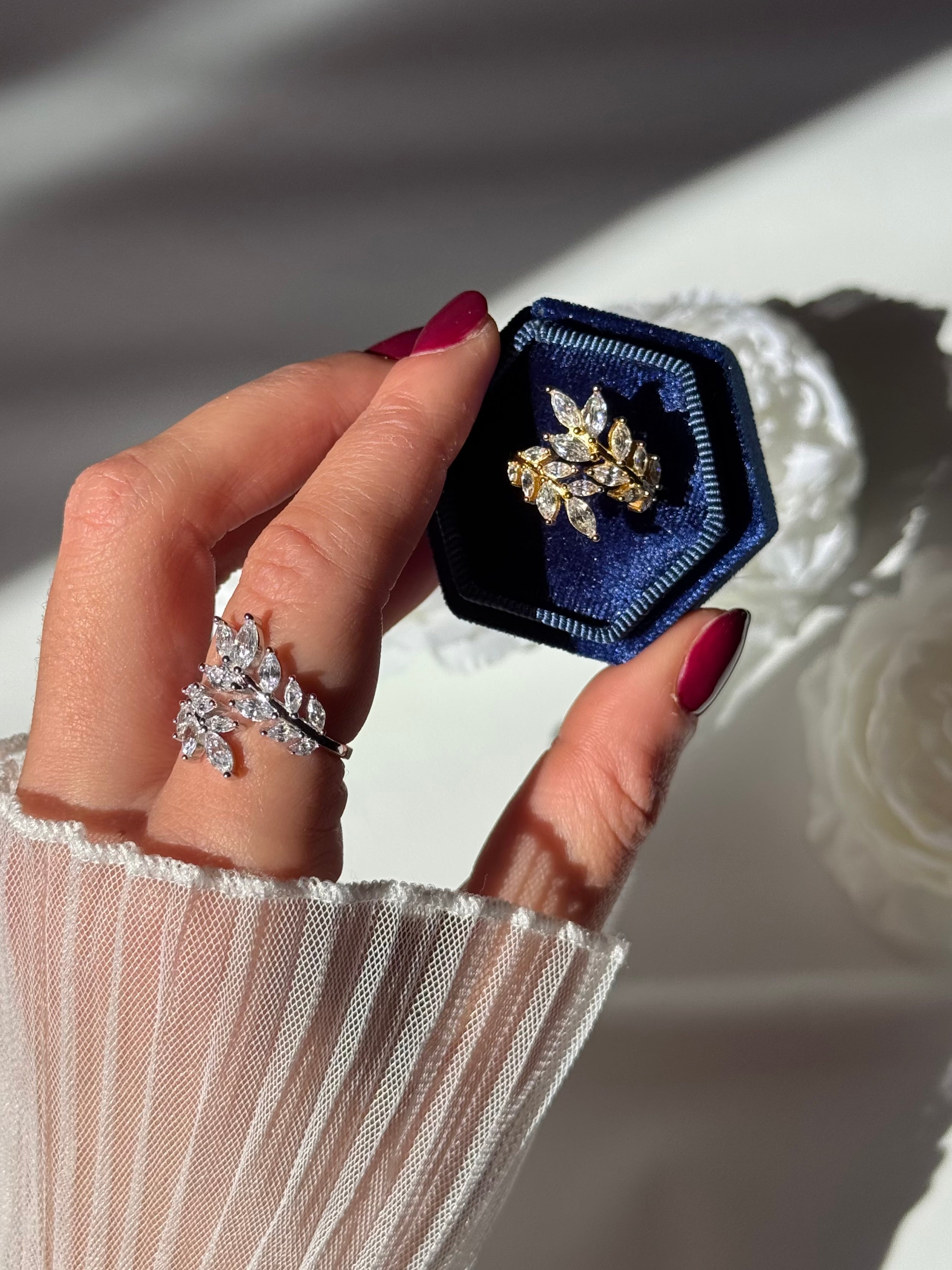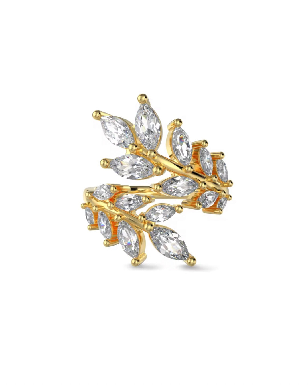Un raffinato intreccio di foglie che si abbracciano con armonia, illuminato da splendide zirconie cubiche taglio marquise di grado 5A, caratterizzate da una brillantezza paragonabile ai diamanti. Ogni dettaglio è pensato per catturare la luce e valorizzare le mani con eleganza.