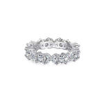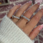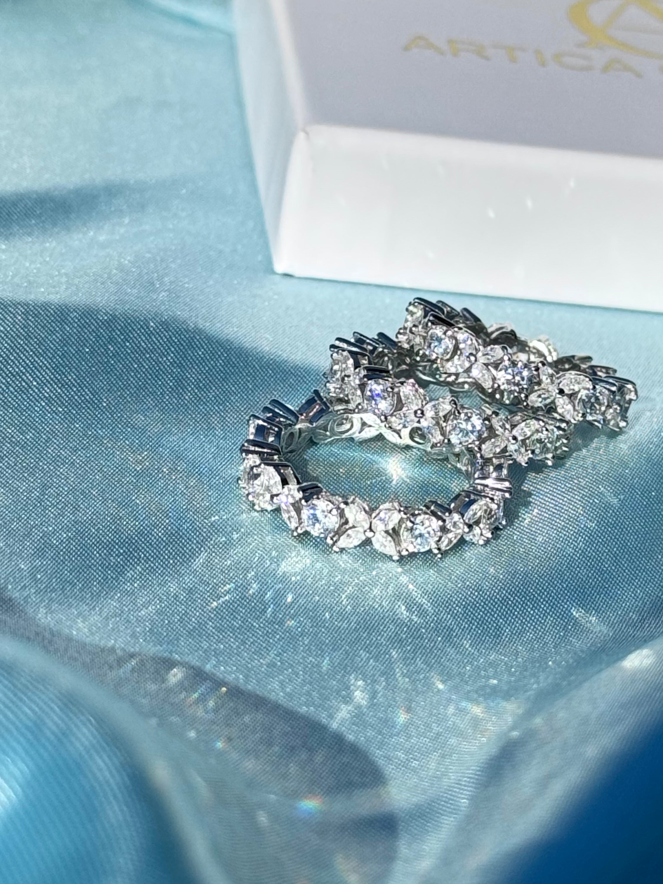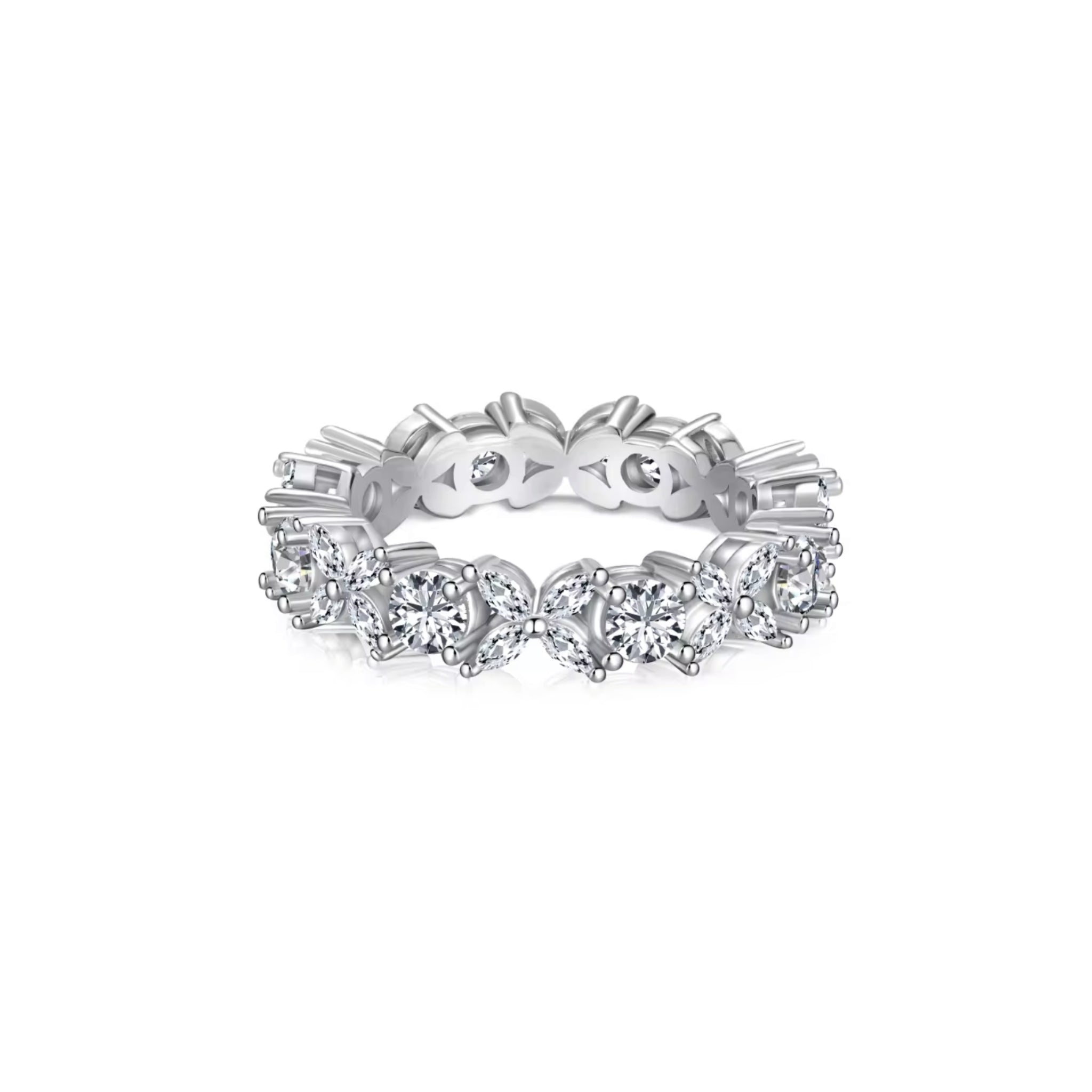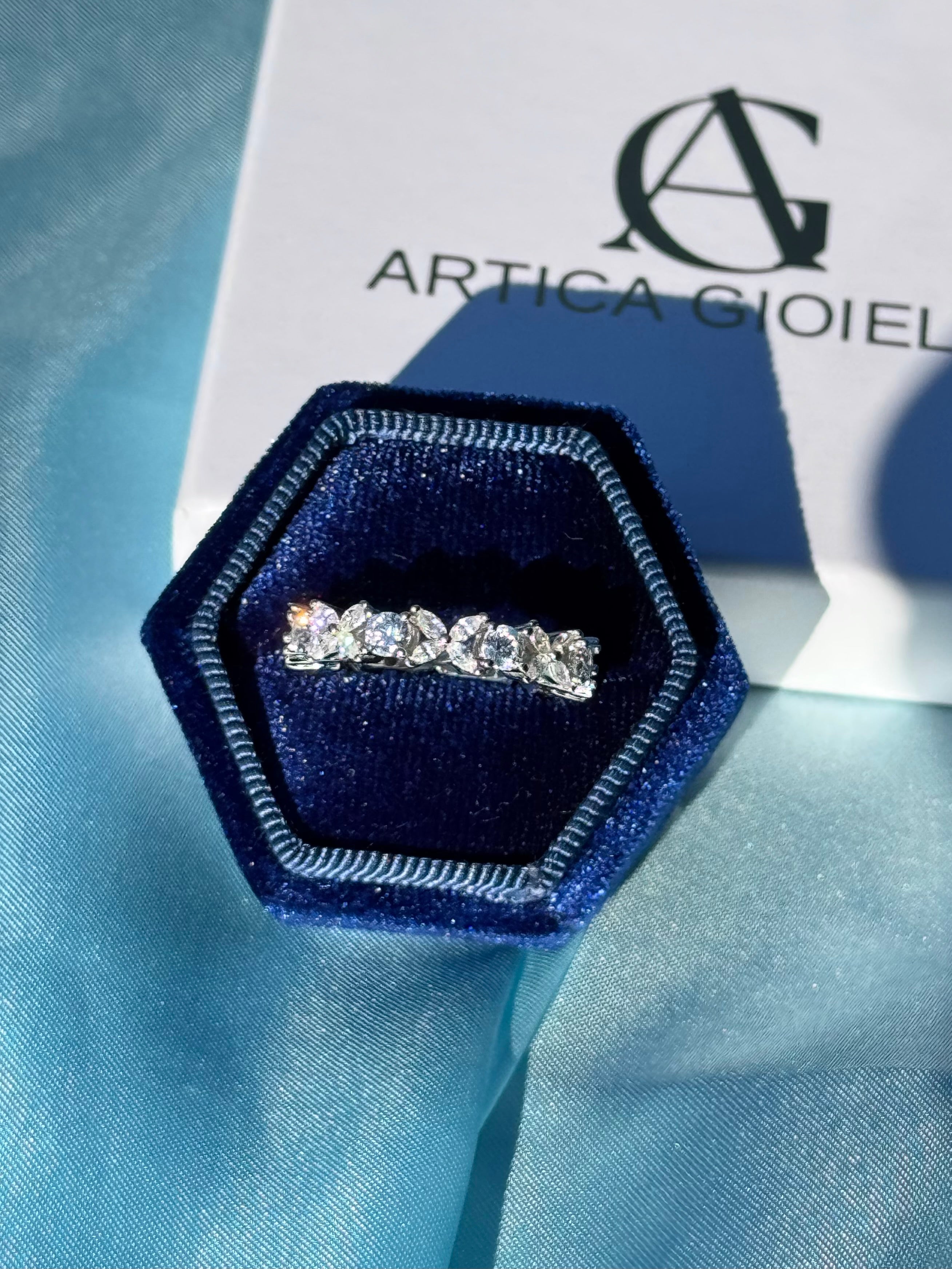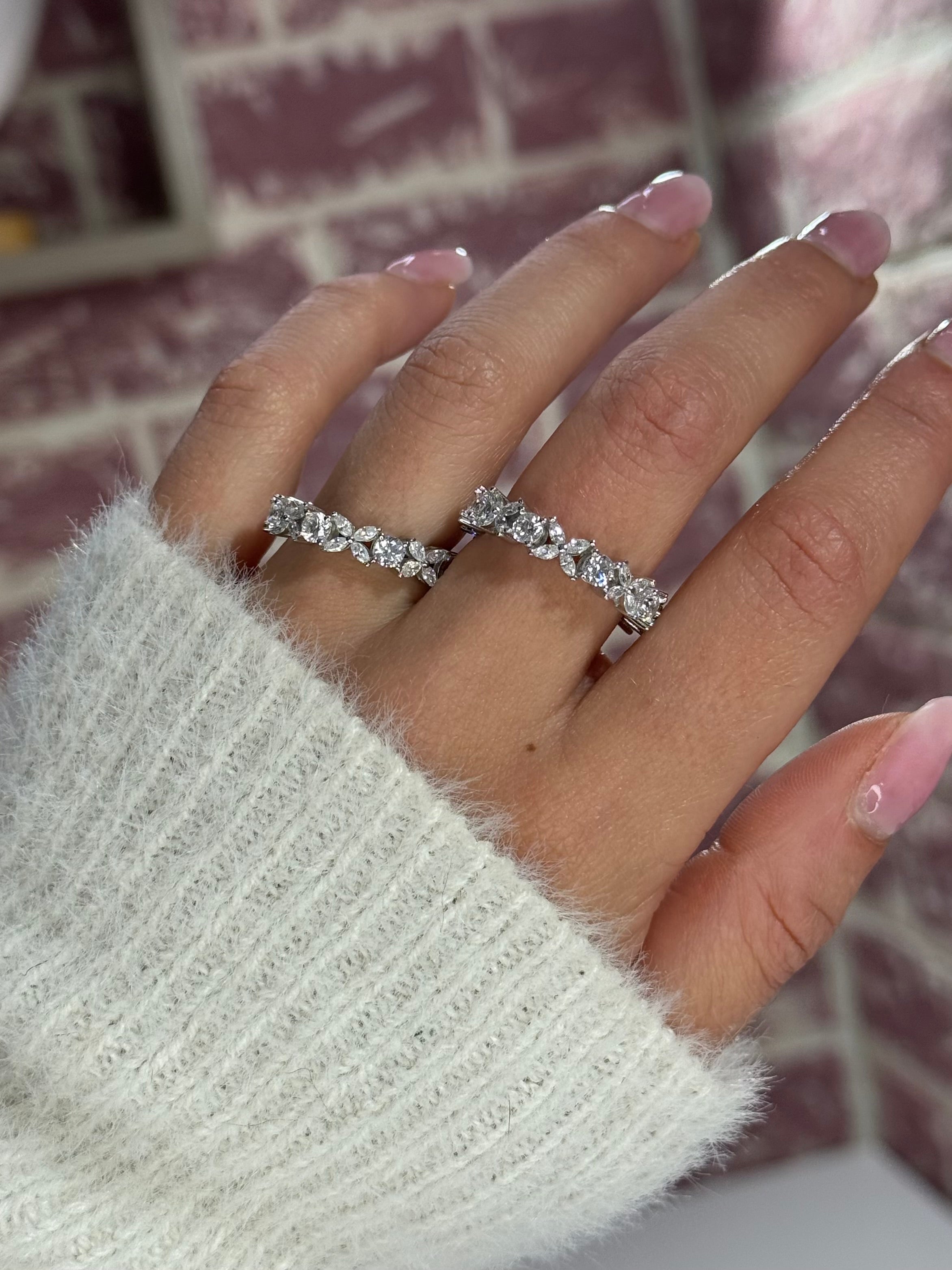 L'anello Diana realizzato in argento 925 è decorato con zirconie cubiche 5A di diverse forme: le pietre rotonde, esposte alla luce del sole, riflettono delicati bagliori celestini, mentre quelle a forma di fiore mantenendo una brillantezza trasparente e cristallina. Un design elegante e ricercato, perfetto per ogni occasione.