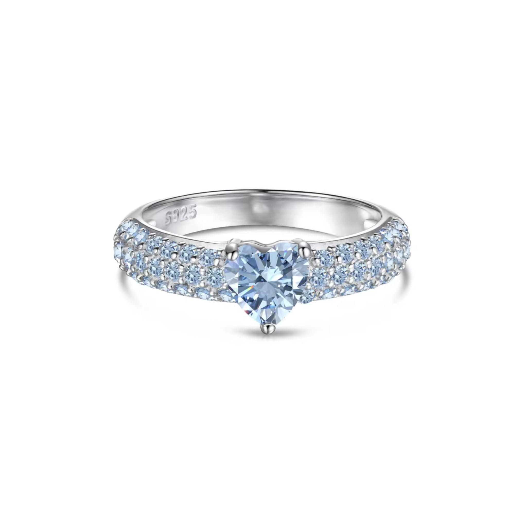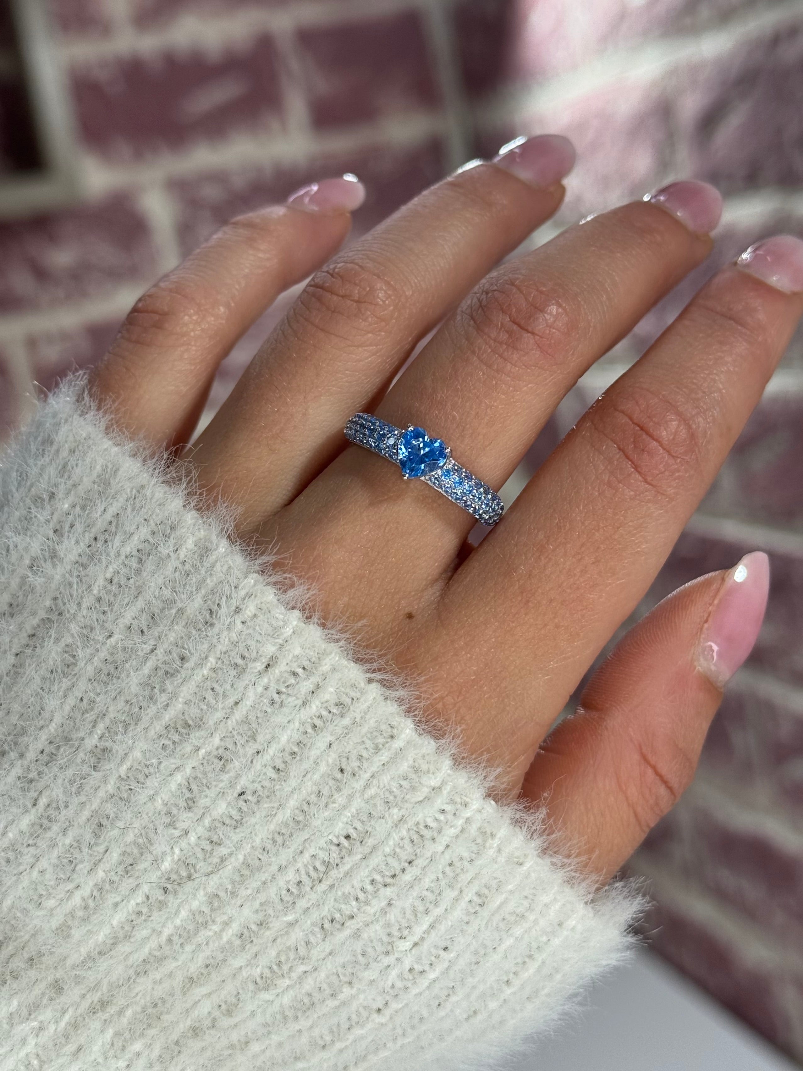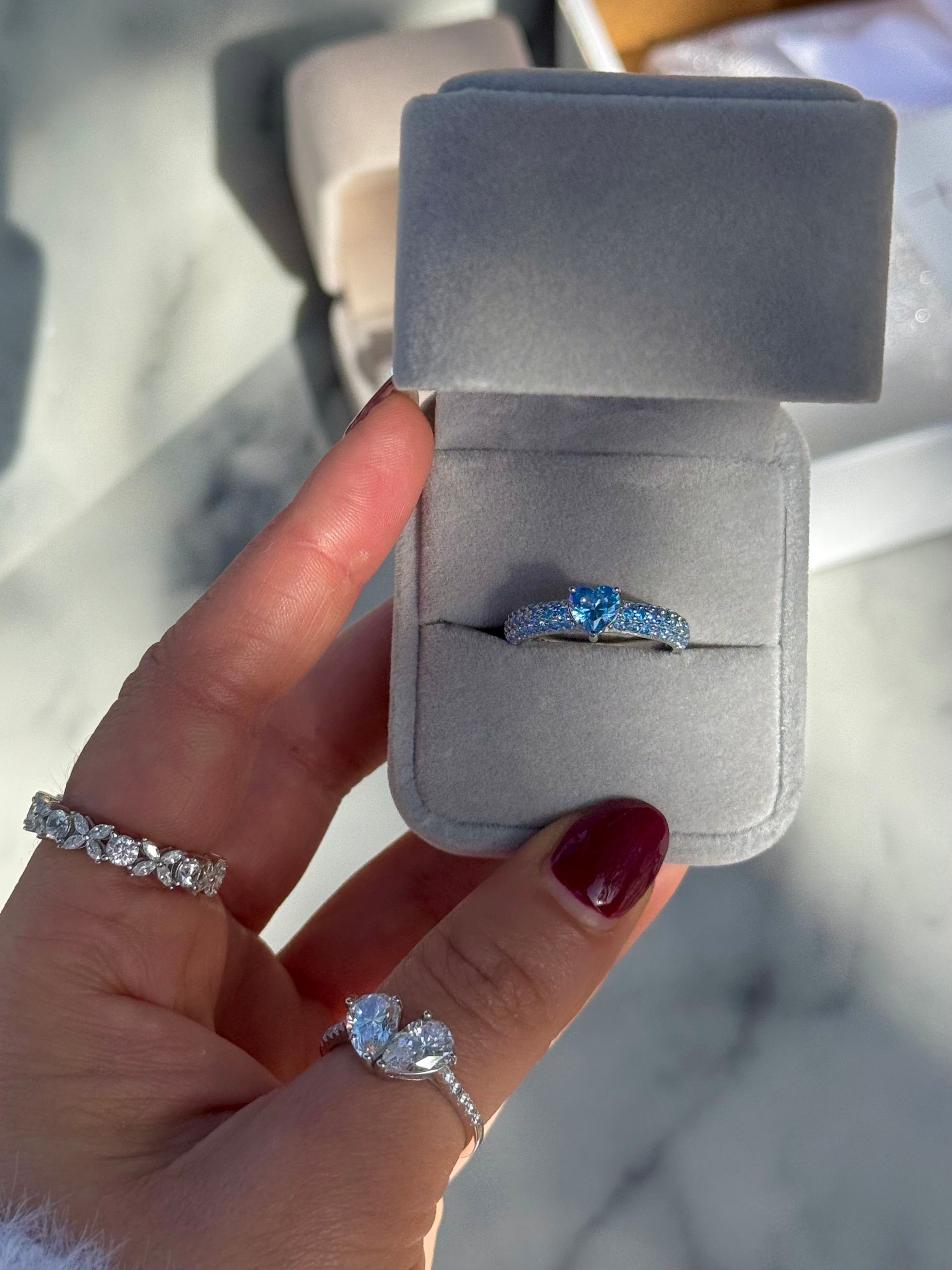 Un anello romantico e luminoso, caratterizzato da una brillante zirconia cubica azzurra a forma di cuore che cattura la luce ad ogni movimento. Il design è impreziosito da una fascia di piccoli zirconi che ne esaltano la lucentezza, creando un effetto sofisticato e senza tempo.