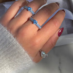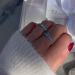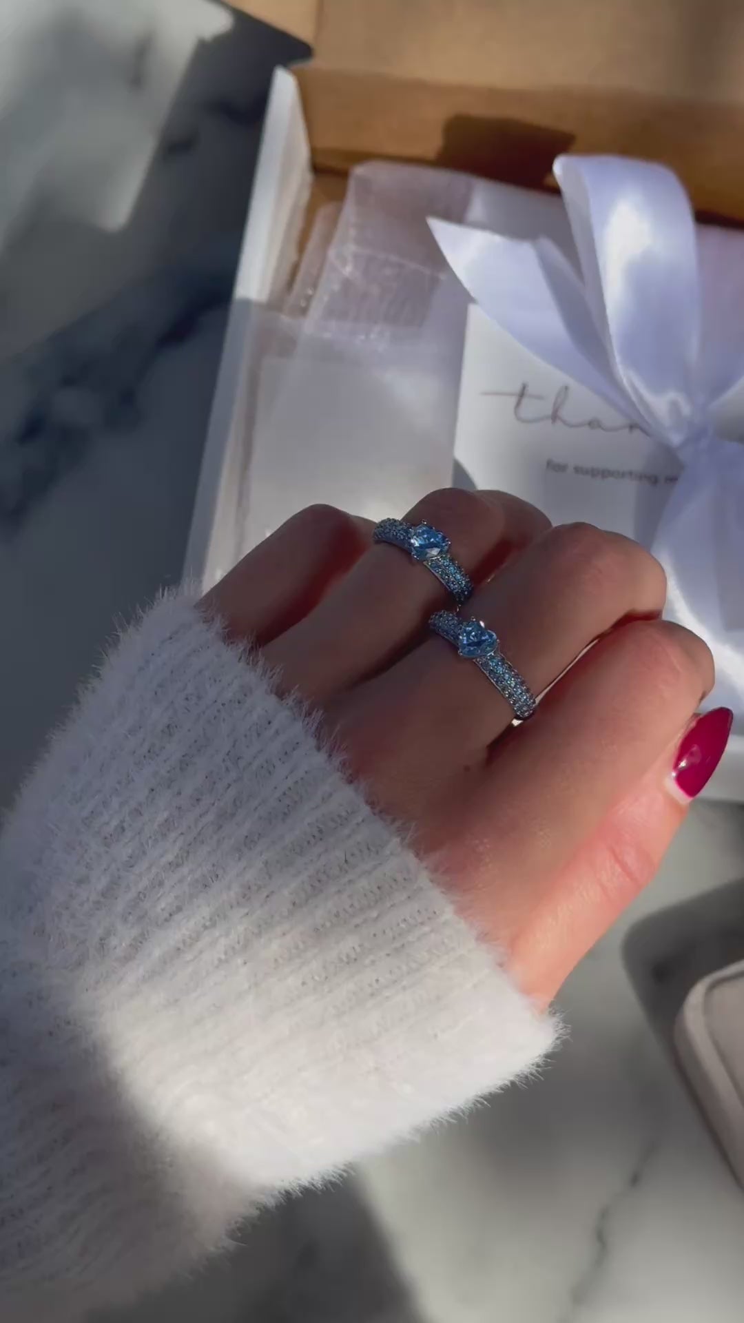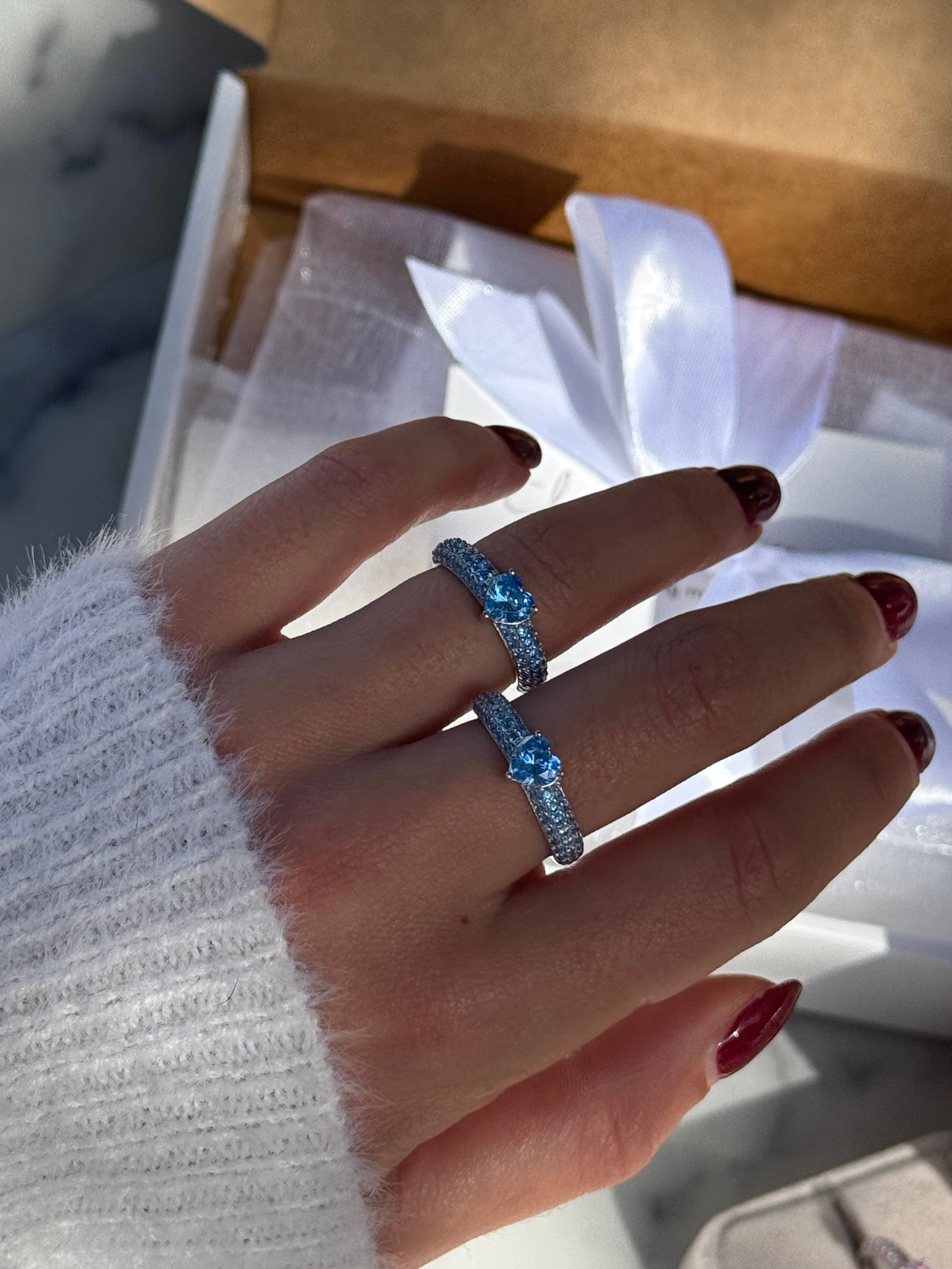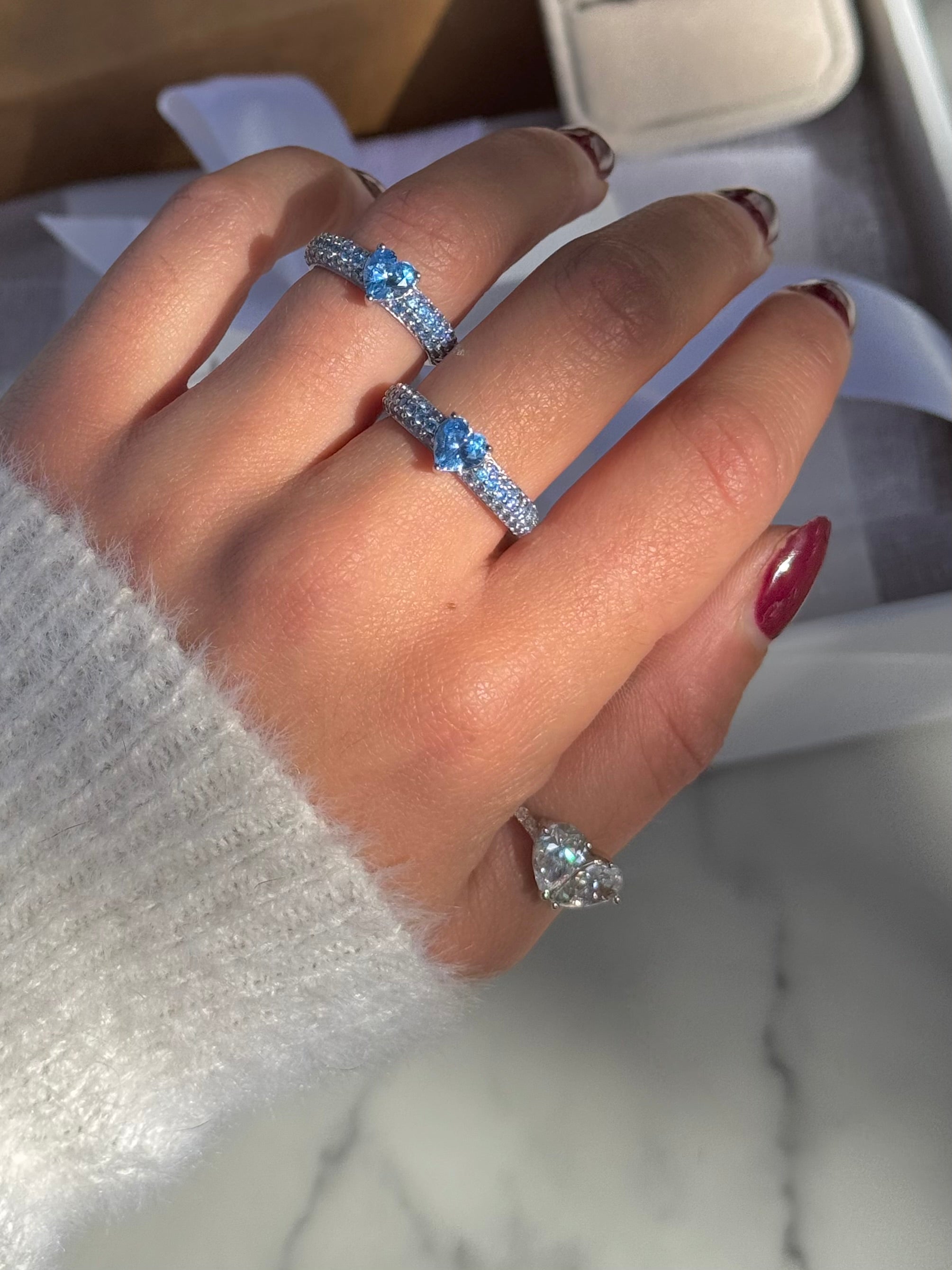 Un anello romantico e luminoso, caratterizzato da una brillante zirconia cubica azzurra a forma di cuore che cattura la luce ad ogni movimento. Il design è impreziosito da una fascia di piccoli zirconi che ne esaltano la lucentezza, creando un effetto sofisticato e senza tempo.