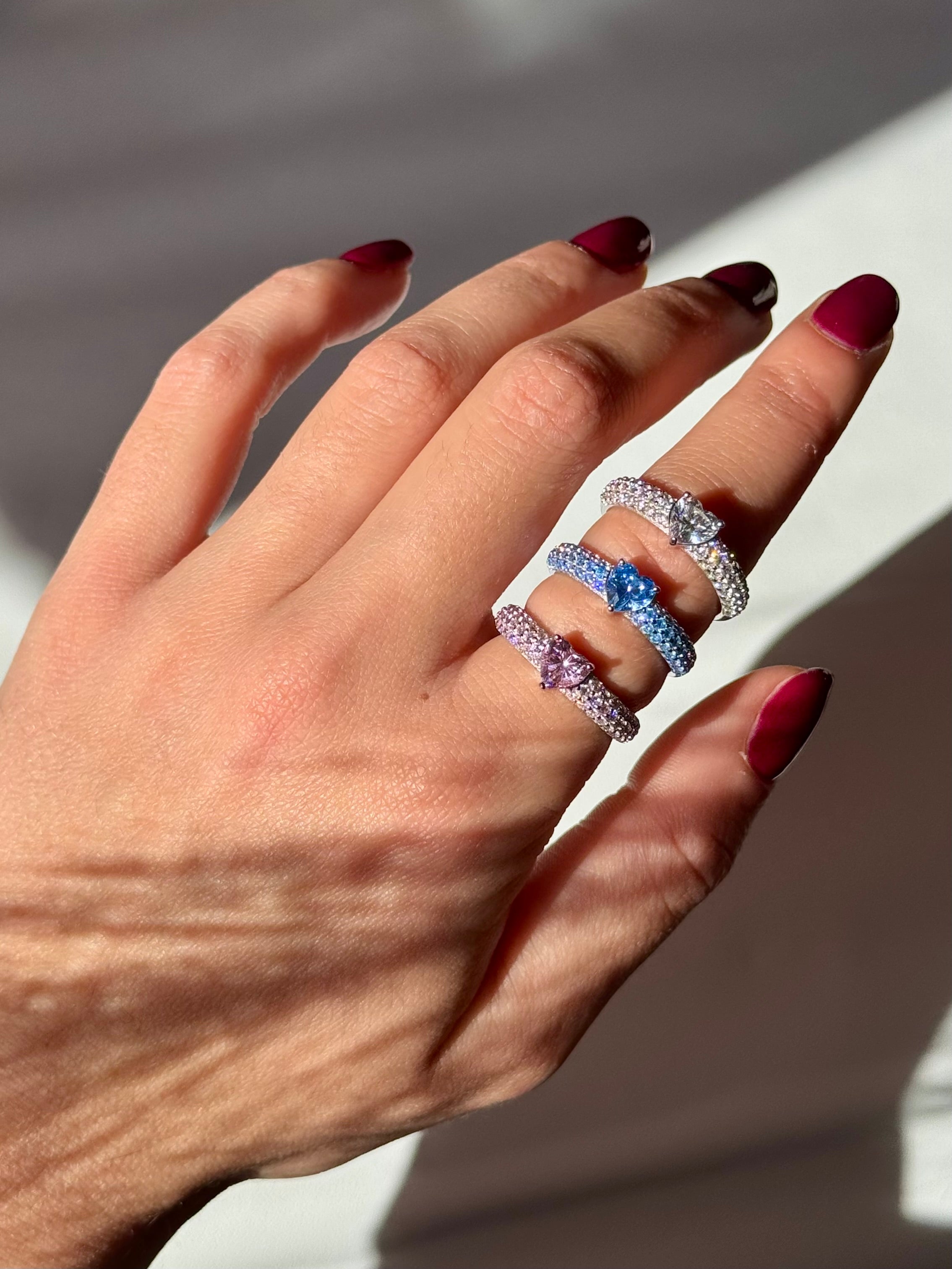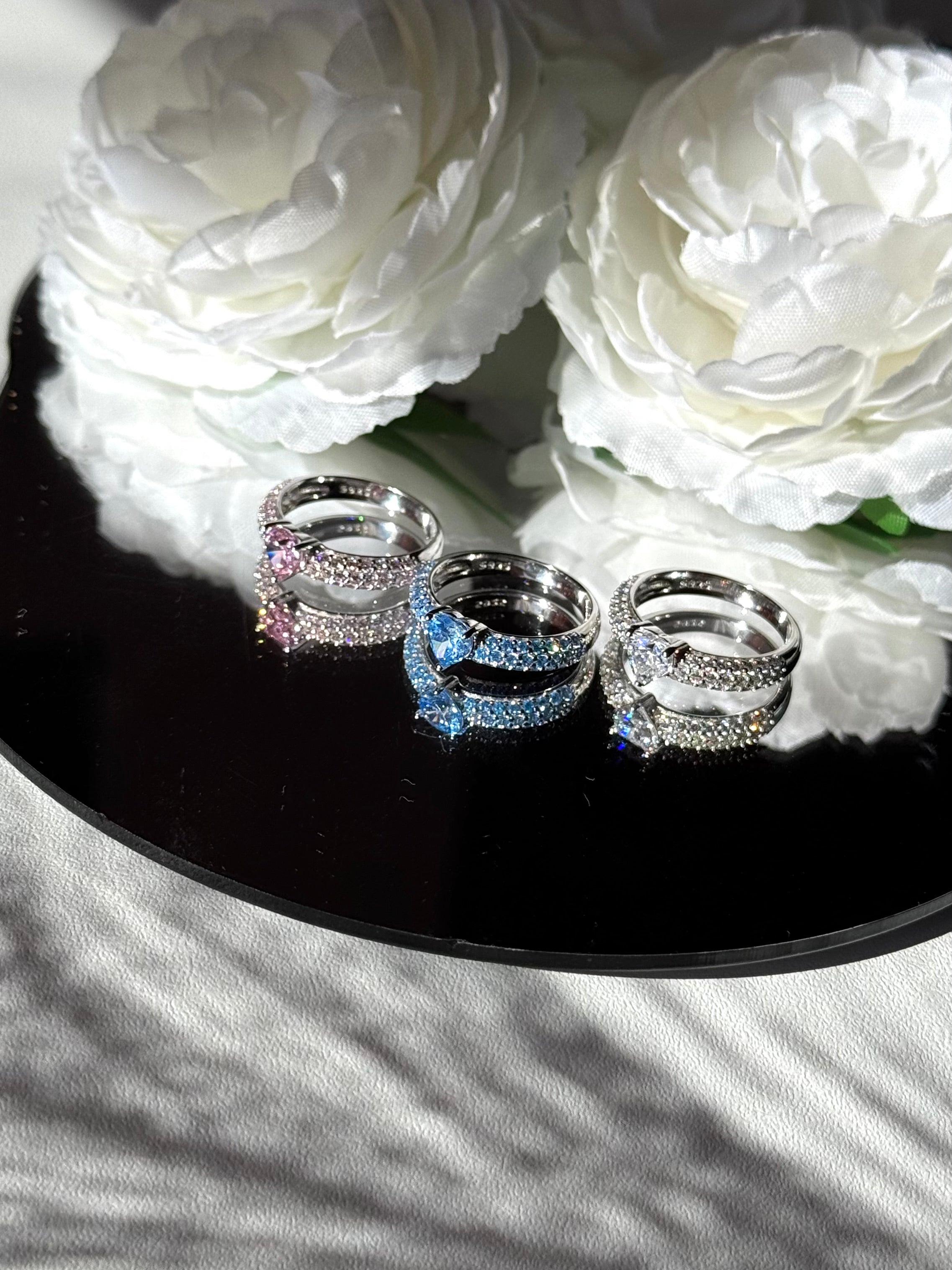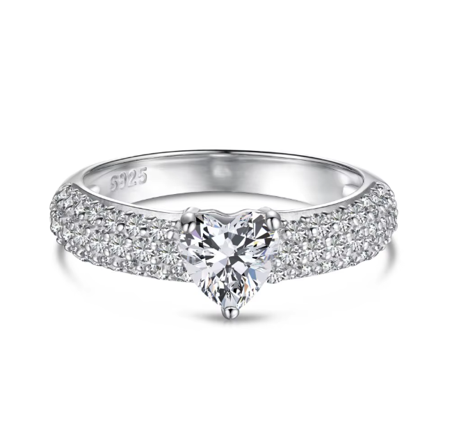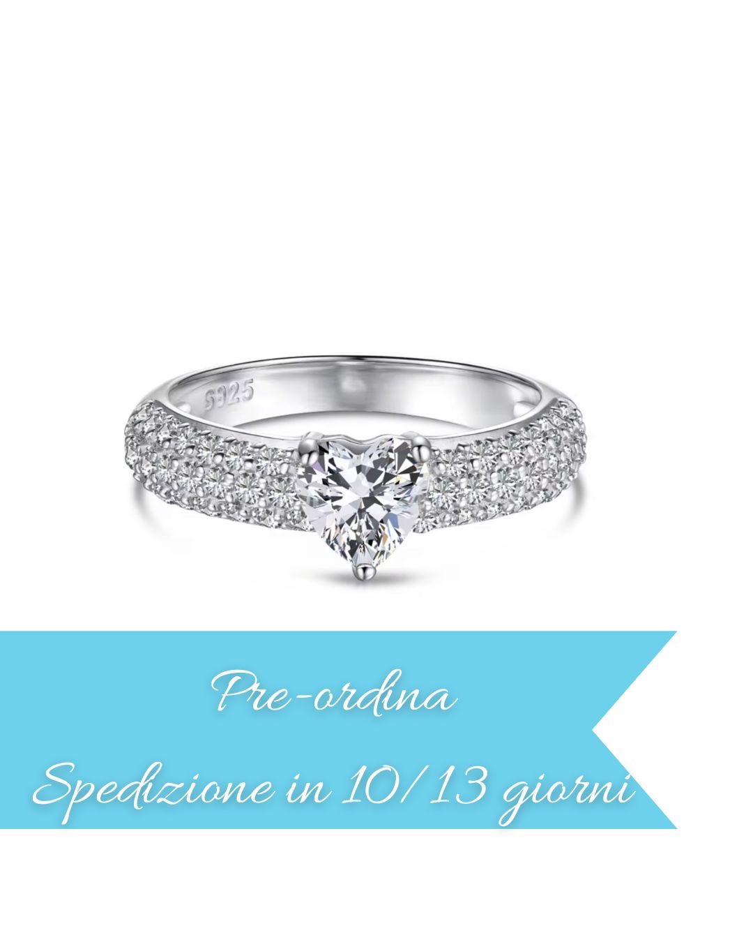 Un anello romantico e luminoso, caratterizzato da una brillante zirconia cubica a forma di cuore che cattura la luce ad ogni movimento. Il design è impreziosito da una fascia di piccoli zirconi che ne esaltano la lucentezza, creando un effetto sofisticato e senza tempo.