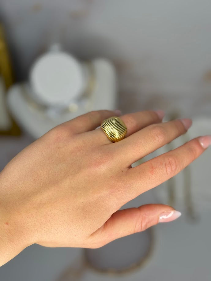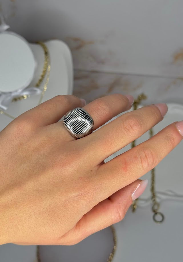 L'anello Eloise presenta un design audace e moderno, caratterizzato da una texture a righe che aggiunge profondità e un tocco distintivo al gioiello. Disponibile in versione dorata e argentata, l’anello ha una superficie lucida che riflette la luce in modo elegante, mettendo in risalto i dettagli della lavorazione. La sua forma aperta sul retro permette una facile regolazione per adattarsi comodamente a varie misure di dito. Perfetto per chi cerca un accessorio sofisticato e di tendenza, ideale per un look contemporaneo
