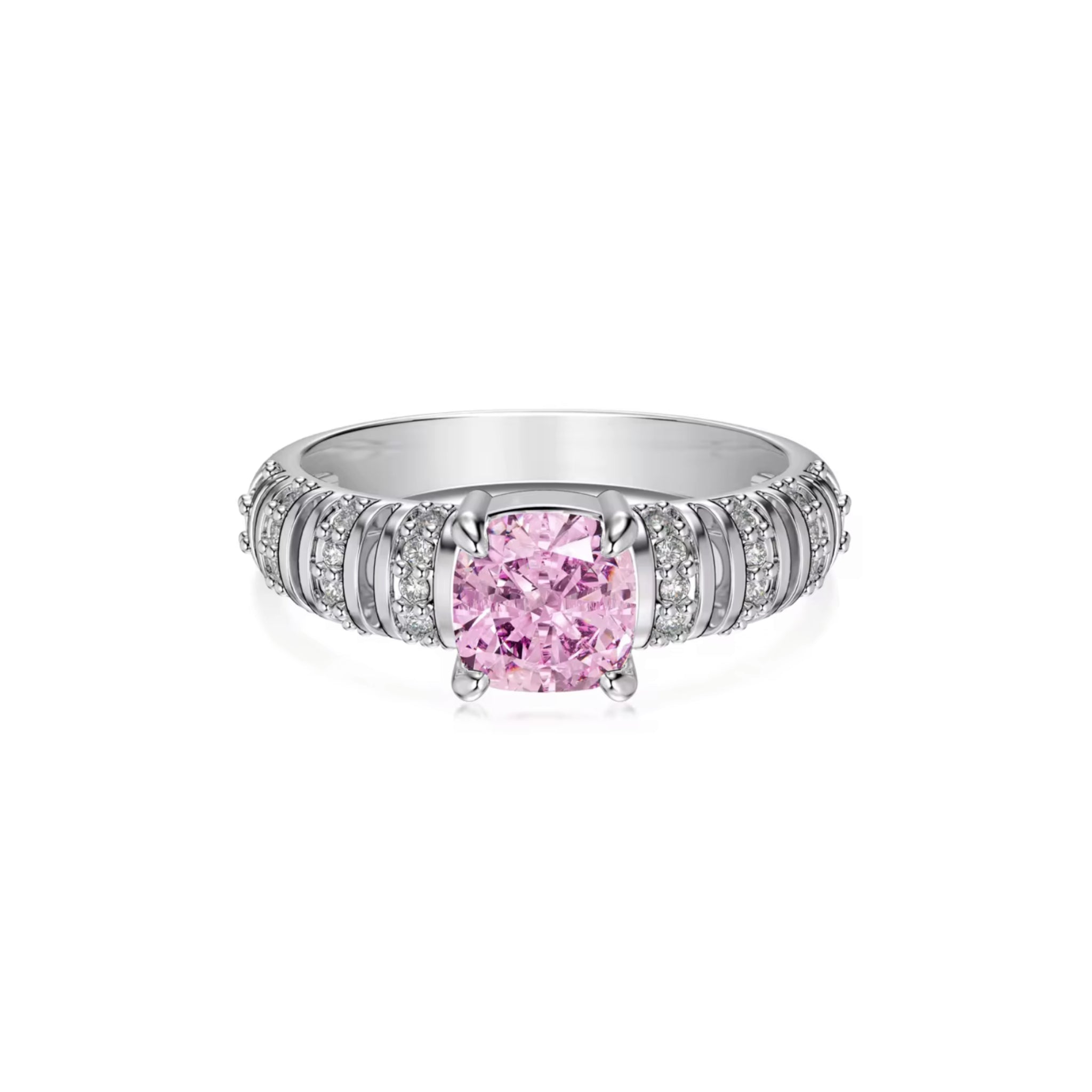 Un anello dal fascino sofisticato e luminoso, caratterizzato da una brillante zirconia rosa centrale che cattura la luce con riflessi intensi. La fascia, impreziosita da una fila di zirconie bianche solo nella parte frontale, crea un equilibrio elegante tra colore e brillantezza. Perfetto per chi ama distinguersi con classe.