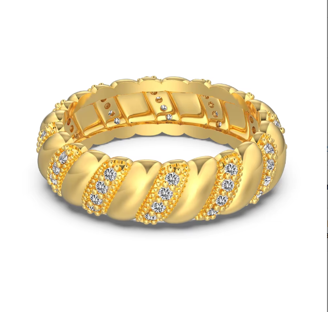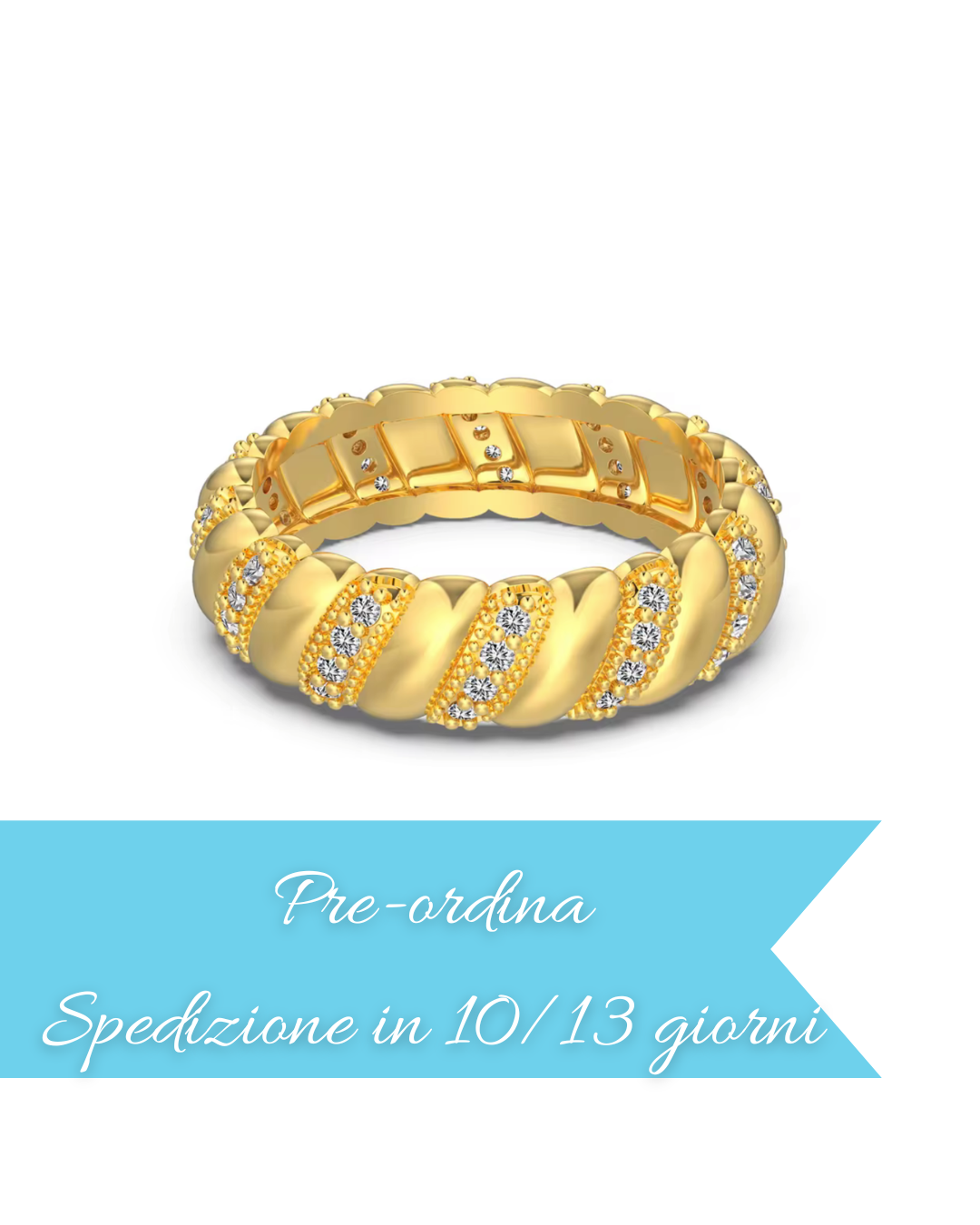 Un intreccio di luce e raffinatezza. Questo anello in argento 925 avvolge il dito con un design a spirale elegante, completamente ricoperto da zirconie cubiche scintillanti che catturano ogni riflesso di luce. La finitura in oro 18K dona un tocco lussuoso e rende la brillantezza ancora più intensa, perfetto per chi ama distinguersi con eleganza.