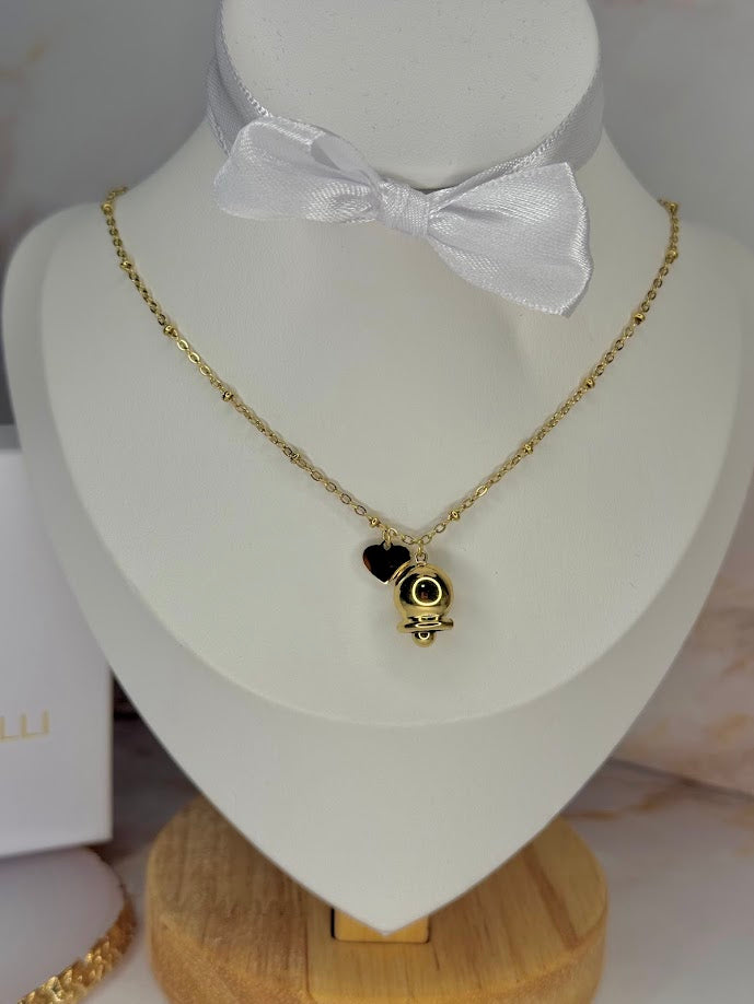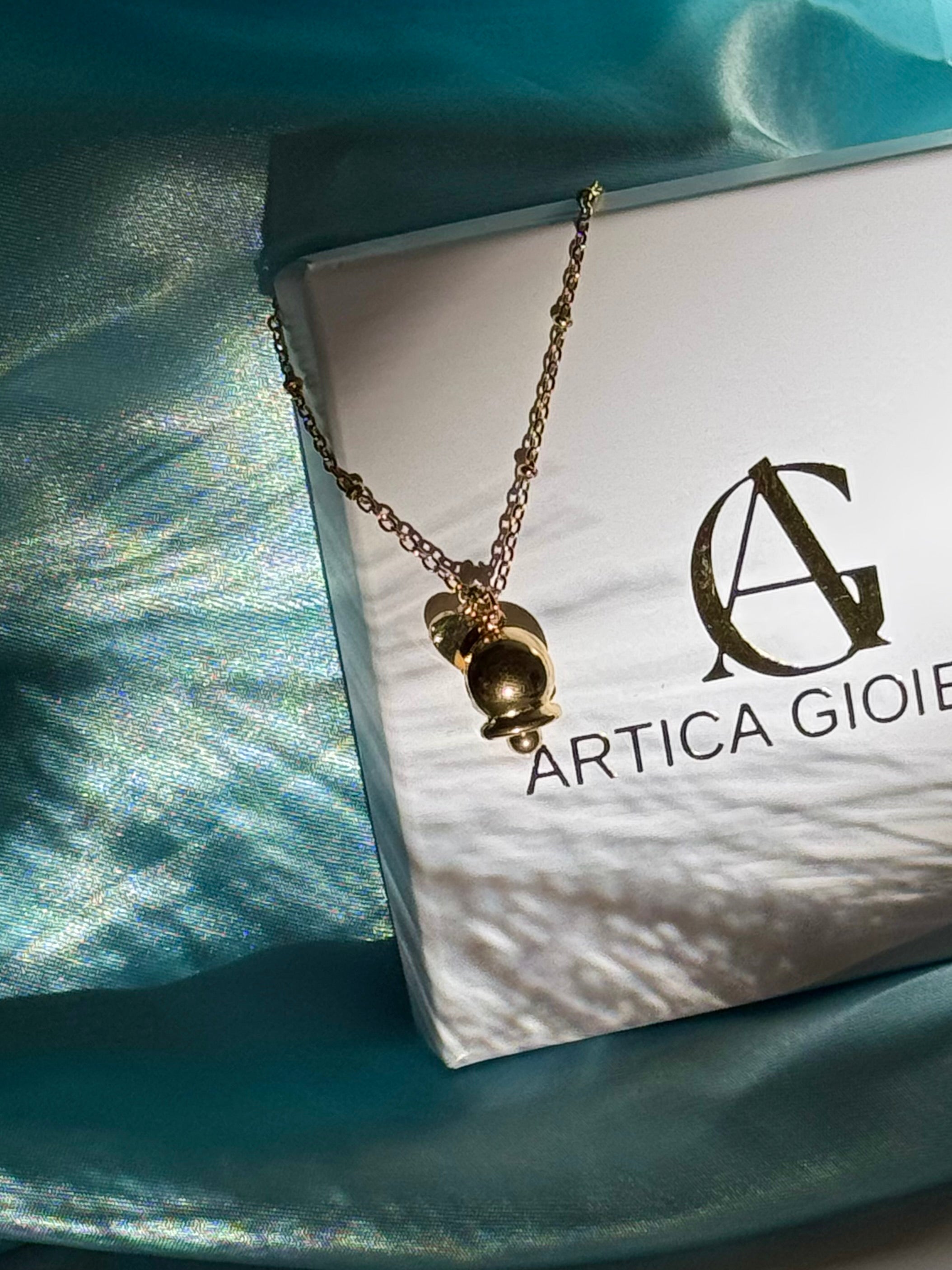 La collana Bell ha una catena dorata fine con piccoli dettagli sferici, che le conferiscono eleganza e leggerezza. Al centro, è presente un ciondolo dorato a forma di campanella, completa di un piccolo sonaglio che crea un delicato tintinnio quando viene mosso. Il ciondolo è arricchito da un charm a forma di cuore, aggiungendo un tocco di contrasto e modernità al design.