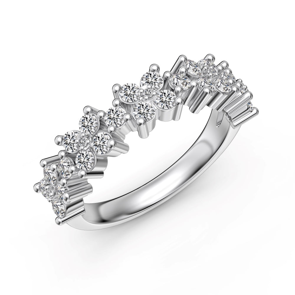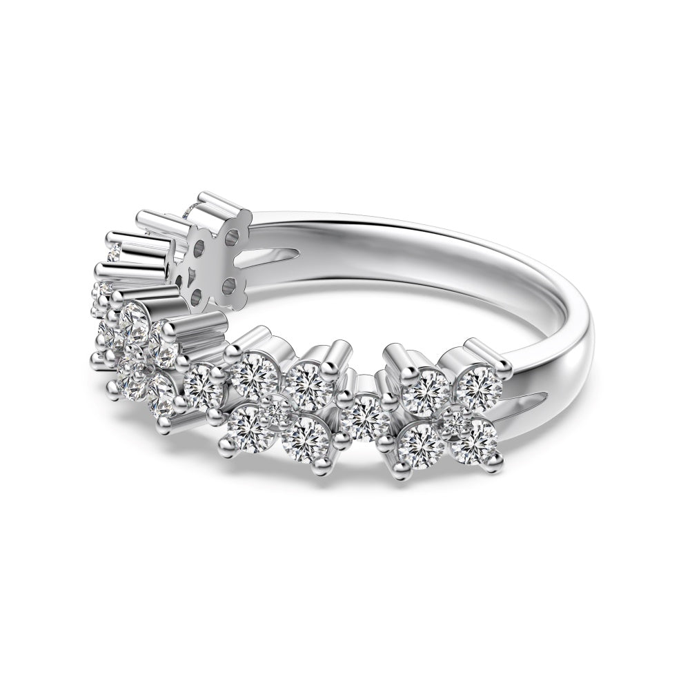 L’anello Eden è caratterizzato da una delicata fascia in argento 925 placcato rodio con affascinanti motivi a fiore formati da zirconi cubici 5A, per un design etereo, femminile e ricco di scintillante brillantezza.