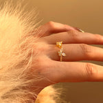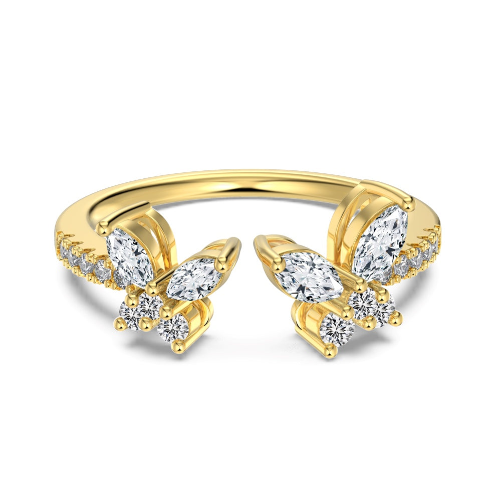 L’anello Fly è caratterizzato da un design aperto e regolabile in argento 925 placcato rodio o oro, con due ali di farfalla simmetriche decorate da zirconi cubici 5A luminosi, per un effetto etereo, leggero e pieno di brillantezza.