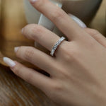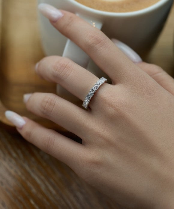 L’anello Jolie è caratterizzato da una raffinata fascia in argento 925 placcato rodio con una fila di scintillanti zirconi cubici 8A a taglio triangolare, montati per un effetto eternity pieno di luce e brillantezza.
