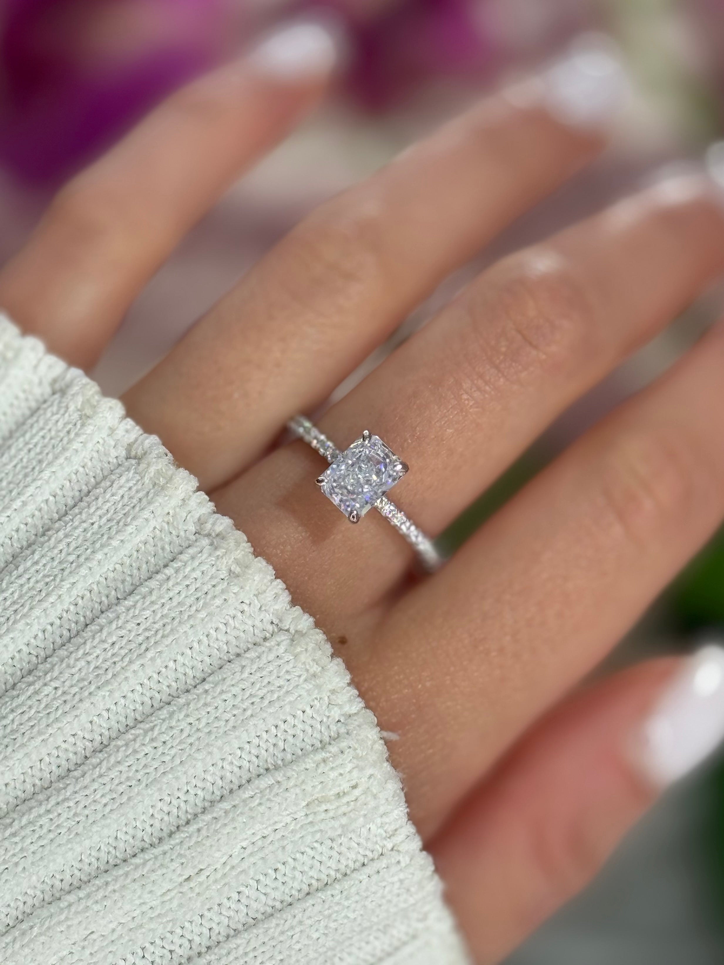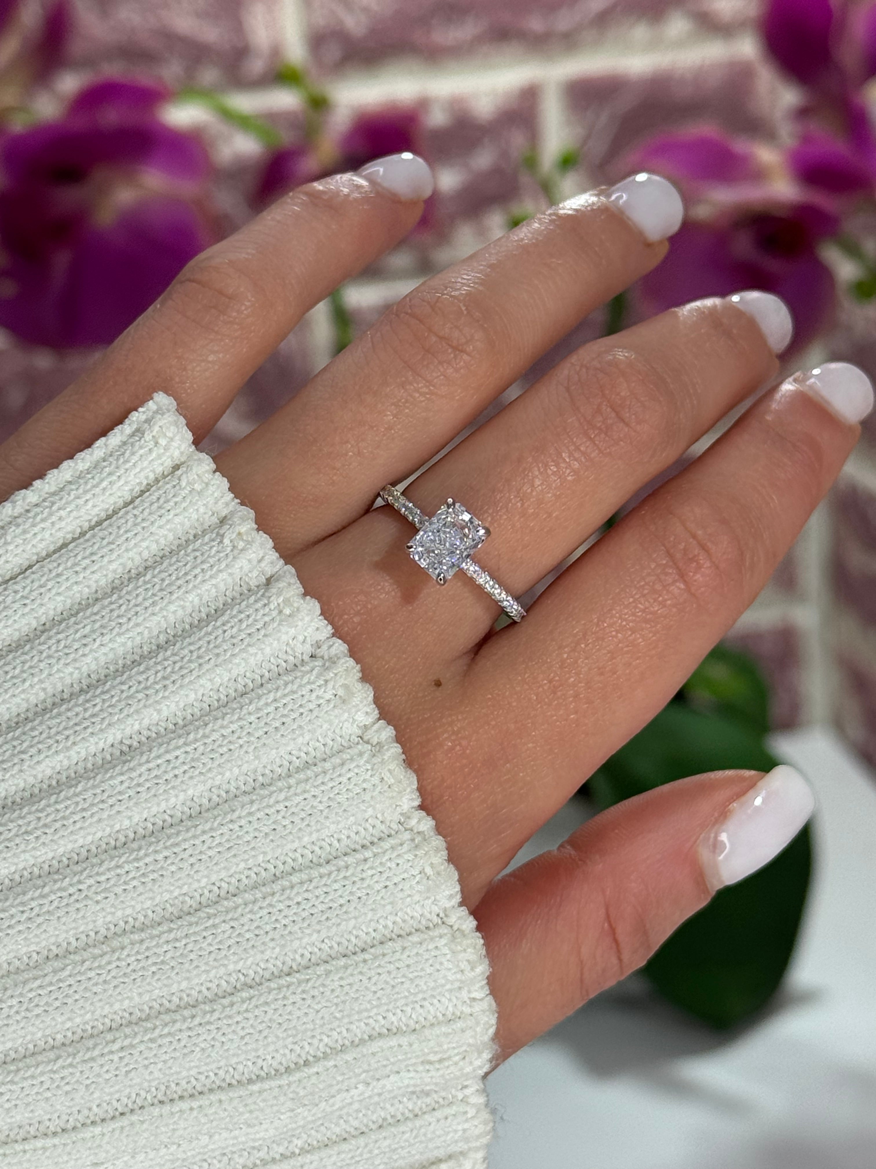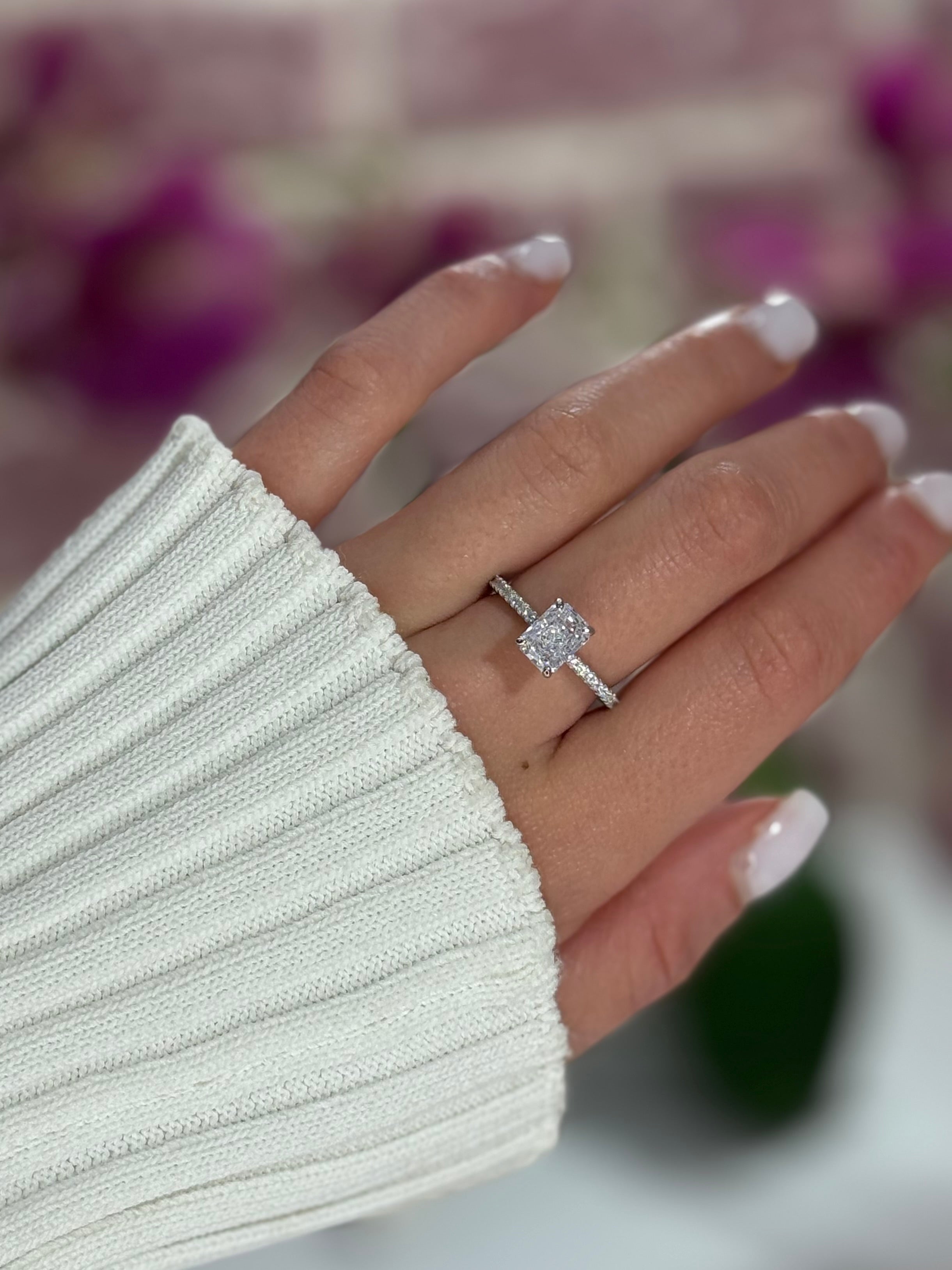 La pietra centrale è valorizzata da una montatura alta con quattro griffe, che la solleva e le permette di catturare al meglio la luce, esaltandone la brillantezza.