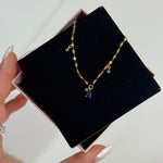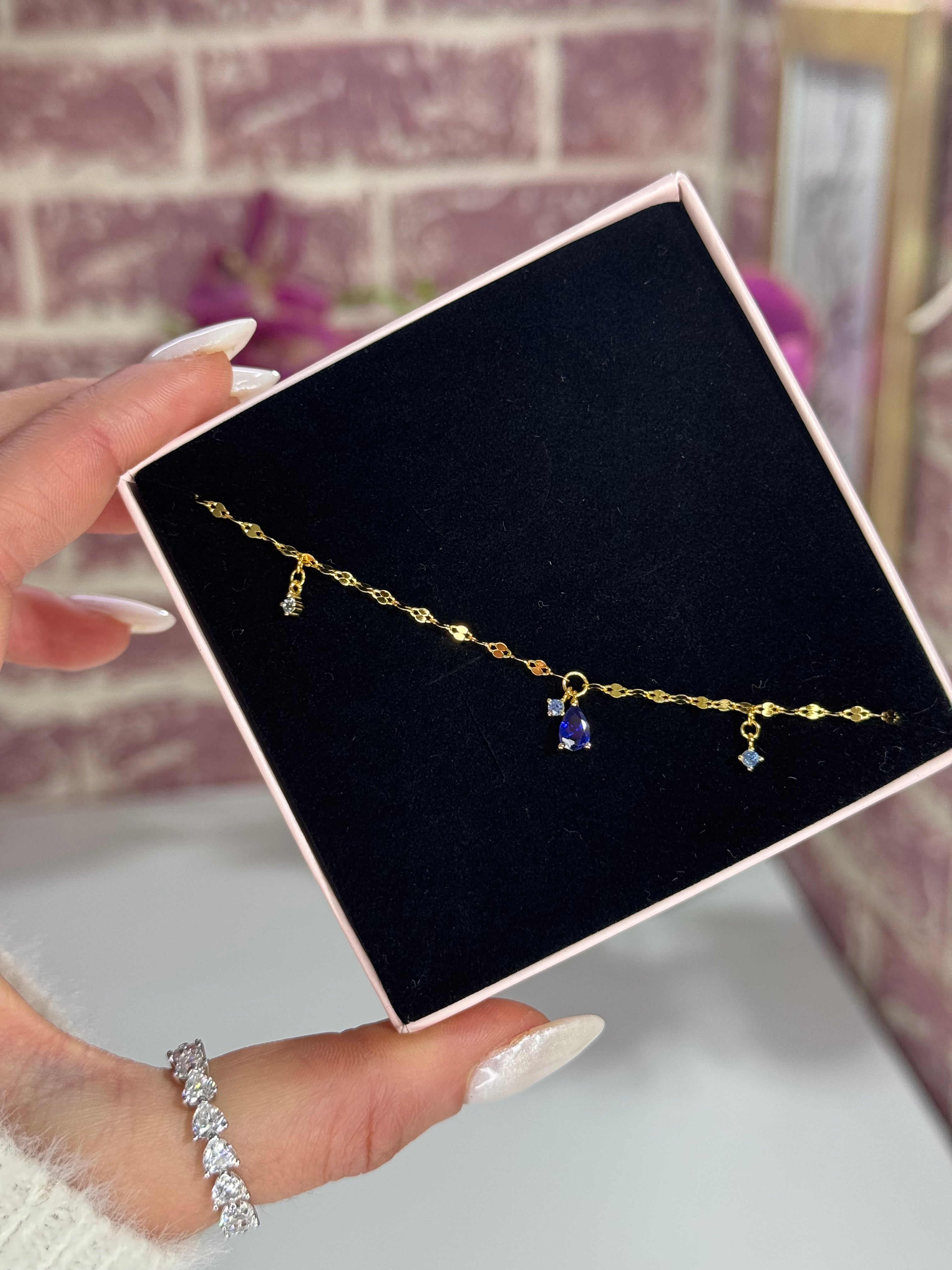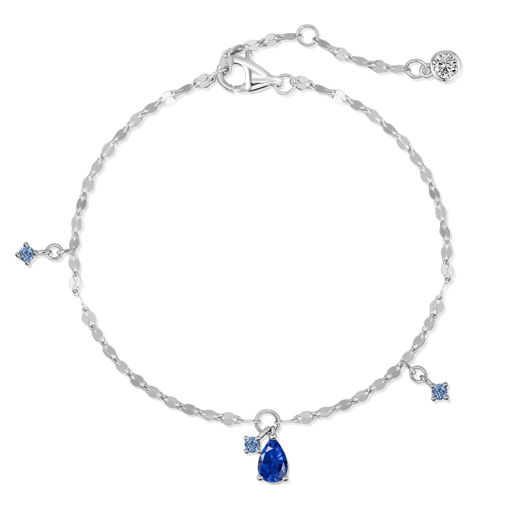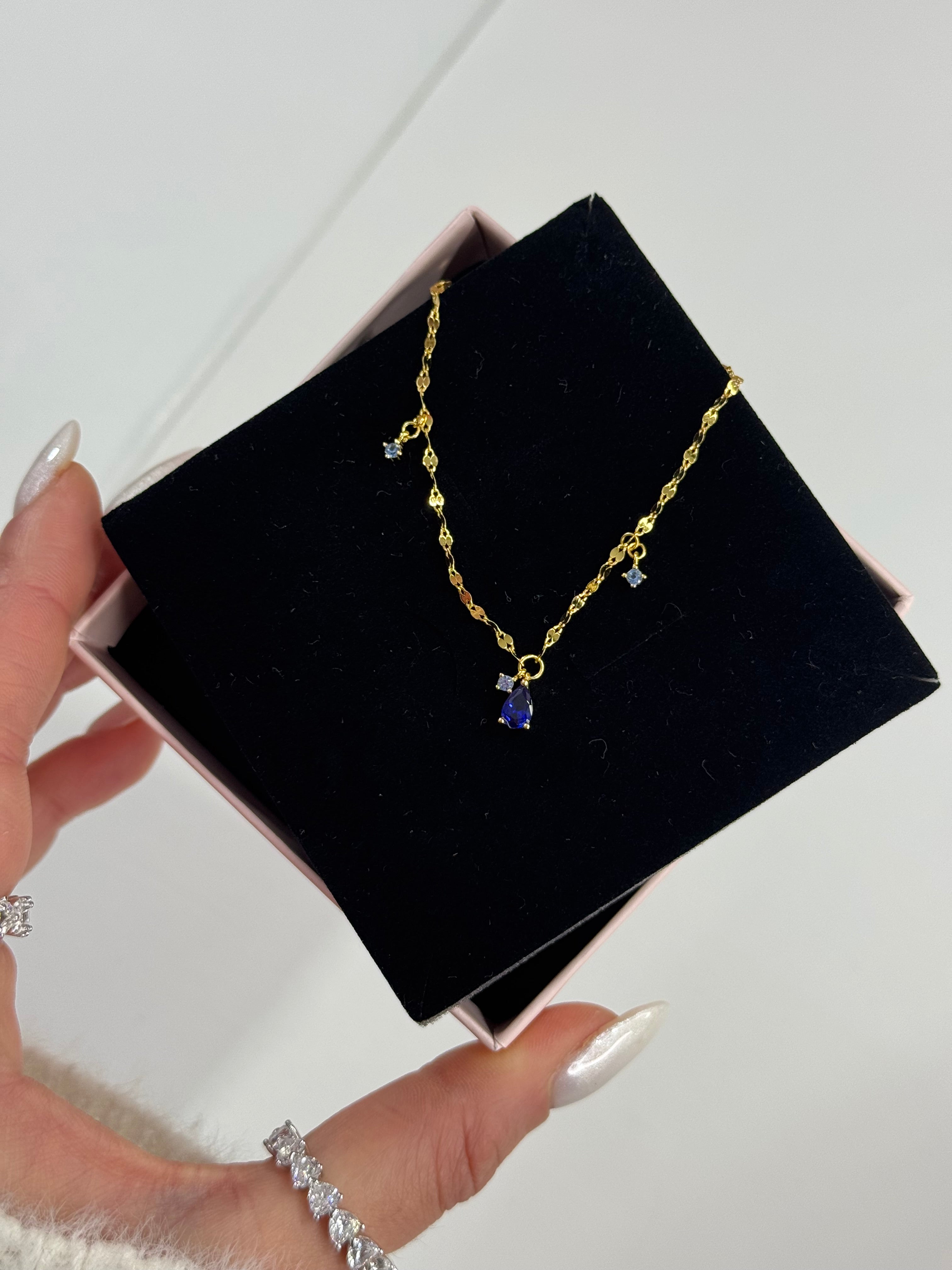 Al centro, un raffinato pendente composto da una goccia di zirconia cubica 5A colore blu intenso, affiancata da due piccole zirconi rotondi tono su tono, per un tocco di sofisticata asimmetria.