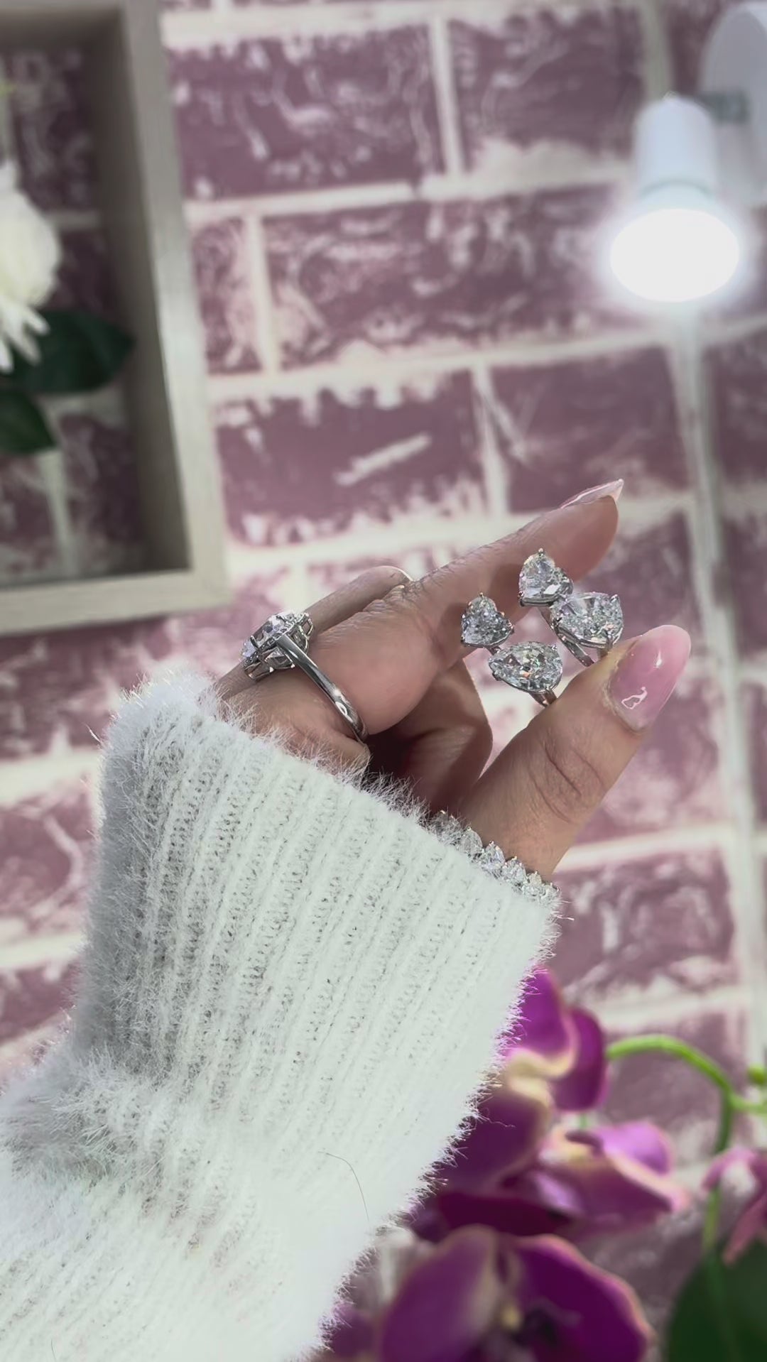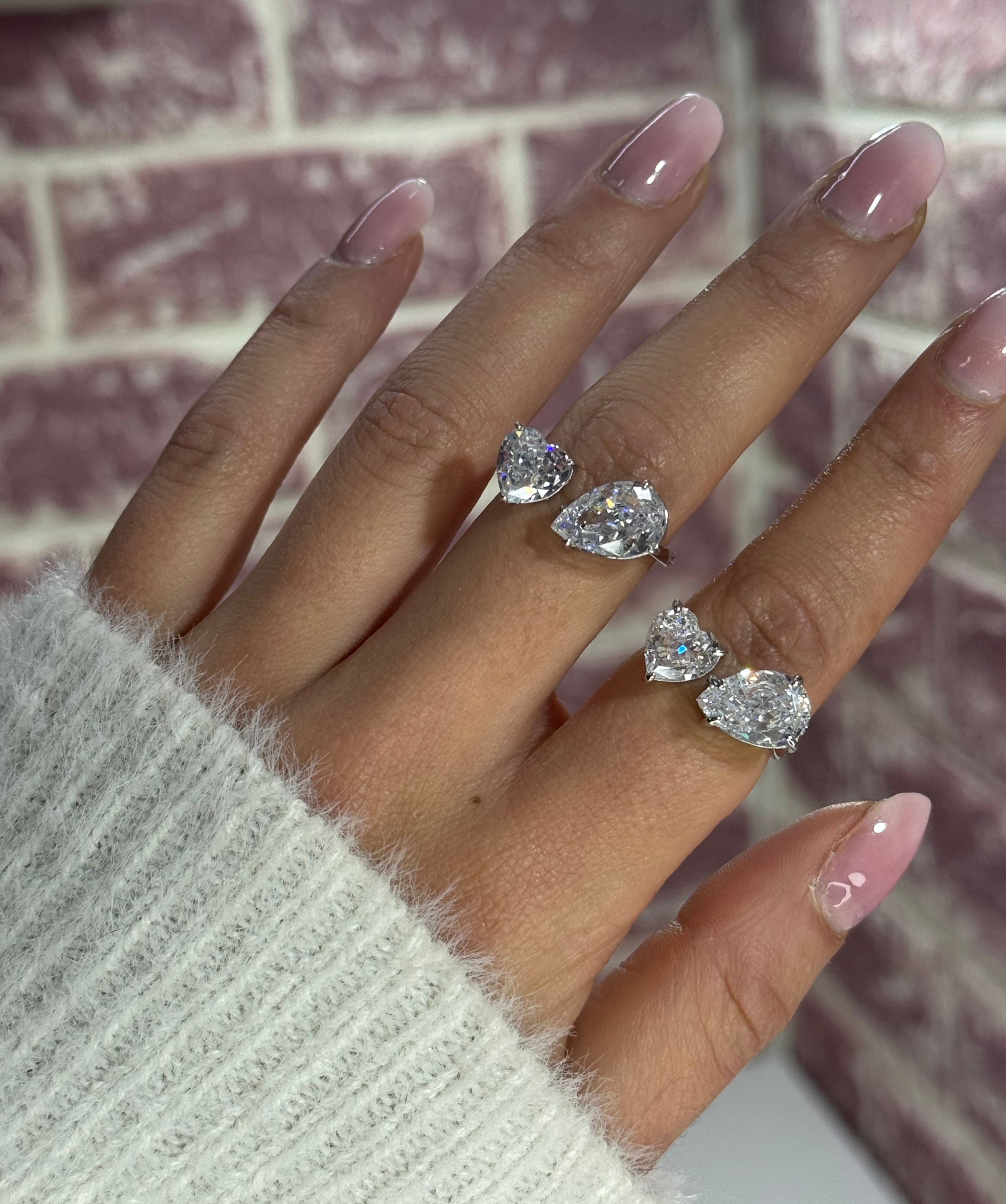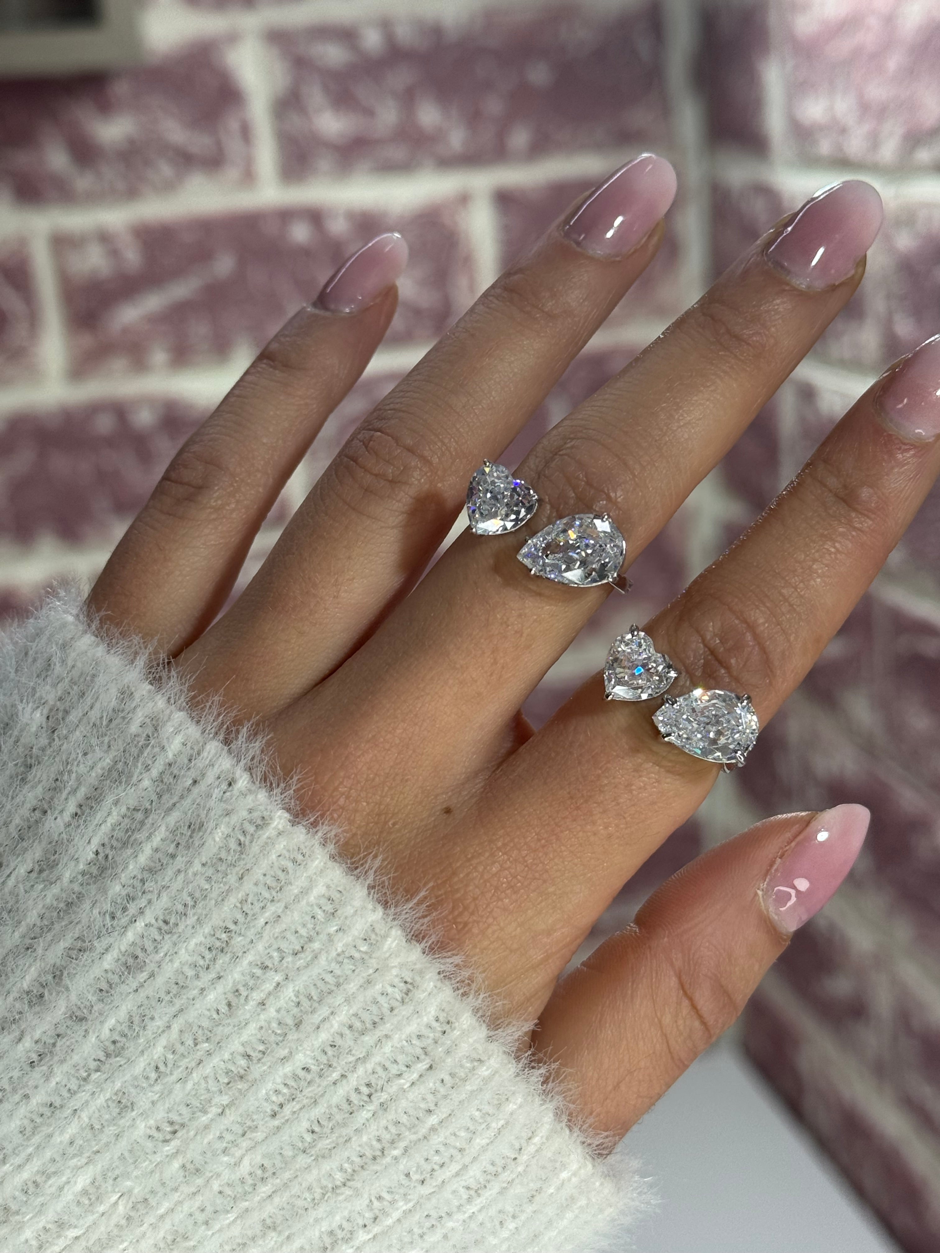 Anello aperto e regolabile, realizzato in argento sterling 925, con due zirconie cubiche 8A: un cuore e una goccia. Il design contemporaneo e delicato mette in risalto le pietre, creando un effetto luminoso e raffinato da ogni angolazione. Perfetto per chi cerca un gioiello versatile e di grande impatto visivo.